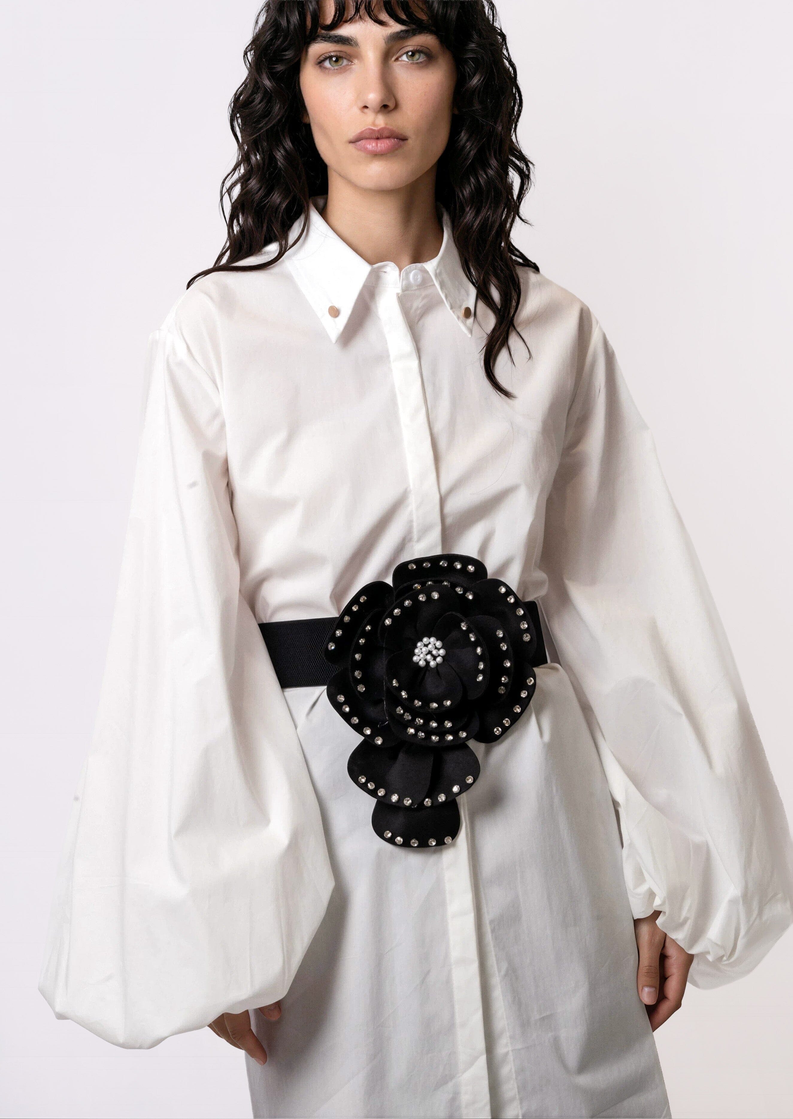 • Silhouette: Waist-defining with a bold floral focal point; sits at the natural waist for a dramatic cinched effect.