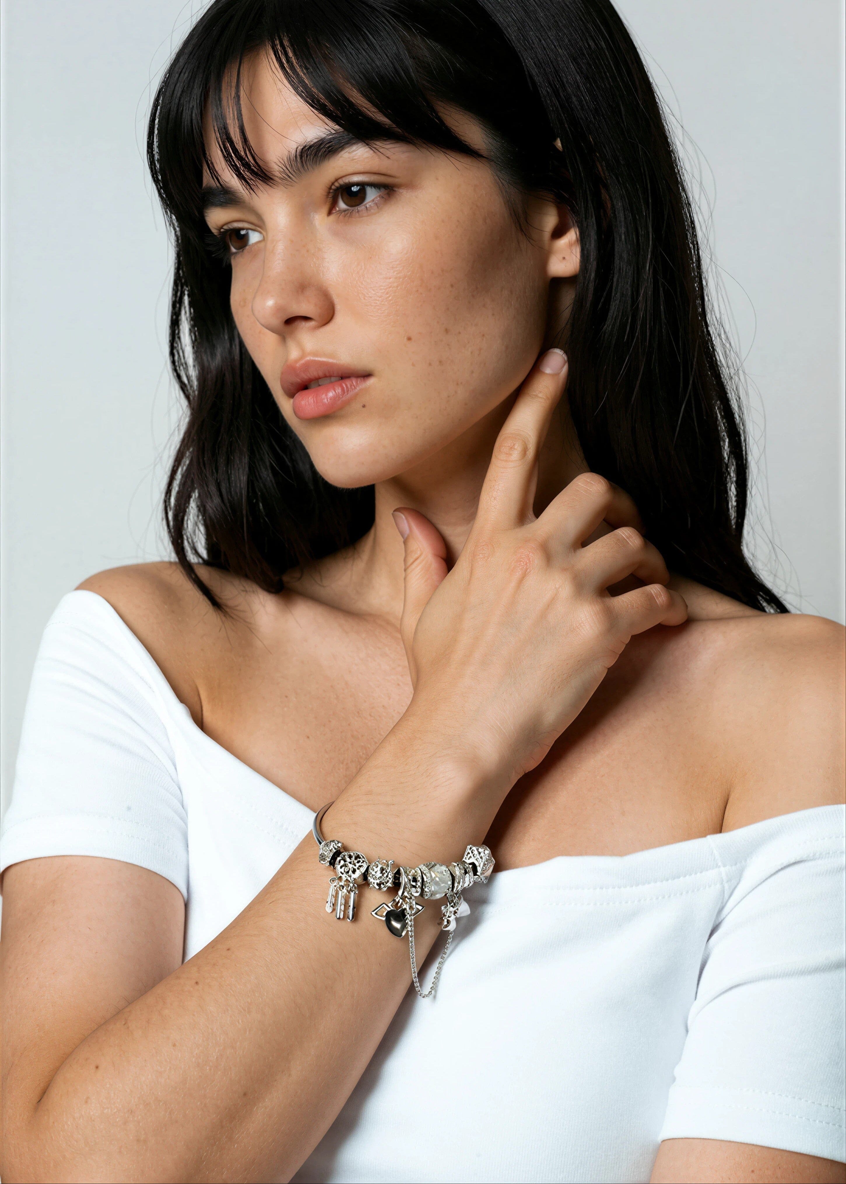 The details are everything — the Silver Charm Bangle Bracelet is a sculptural silver charm bangle stacked with dangling mixed charms, chain accents, and a decorative bead closure that makes even your wrist a statement. Rigid structure, polished finish, zero subtlety.