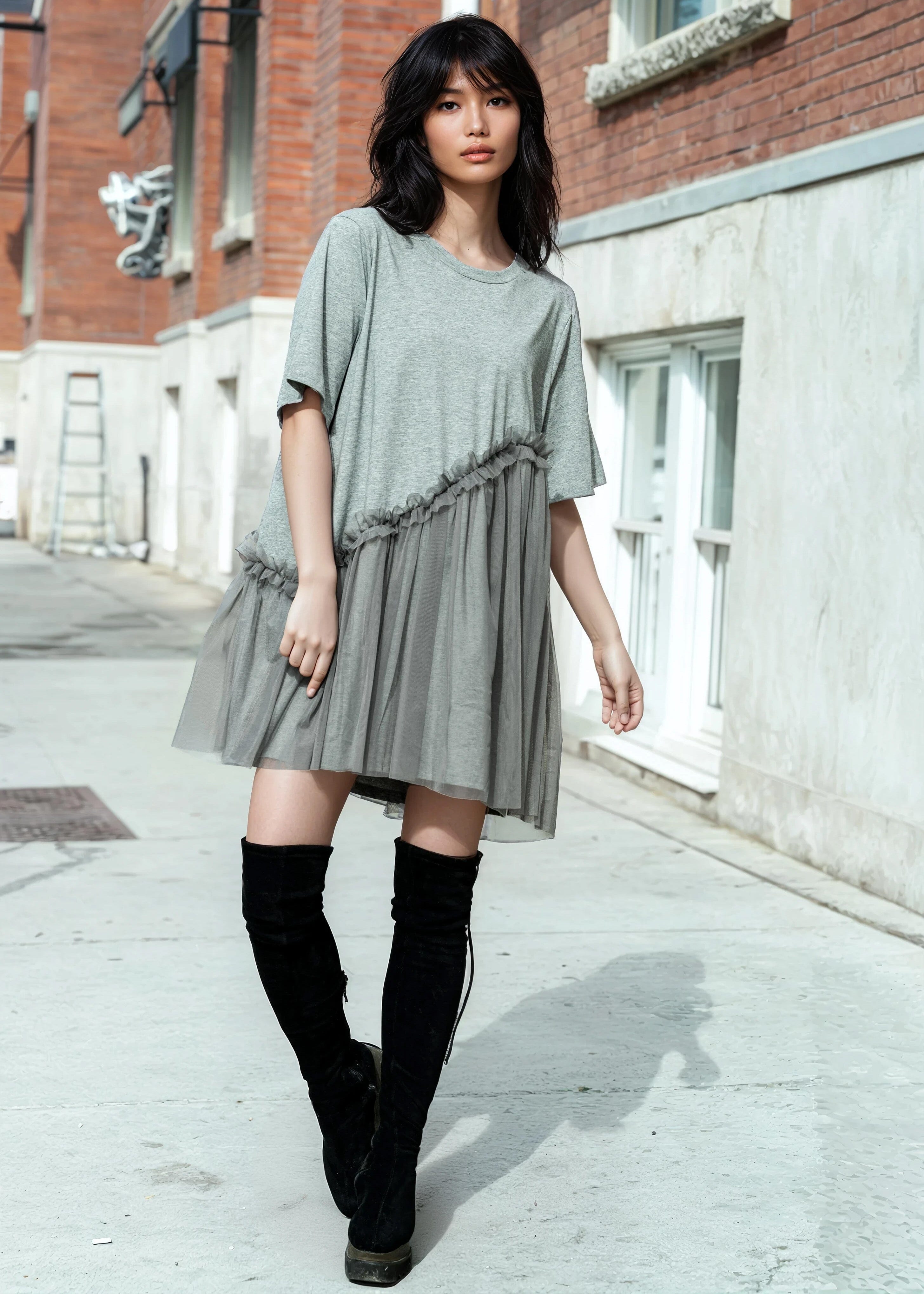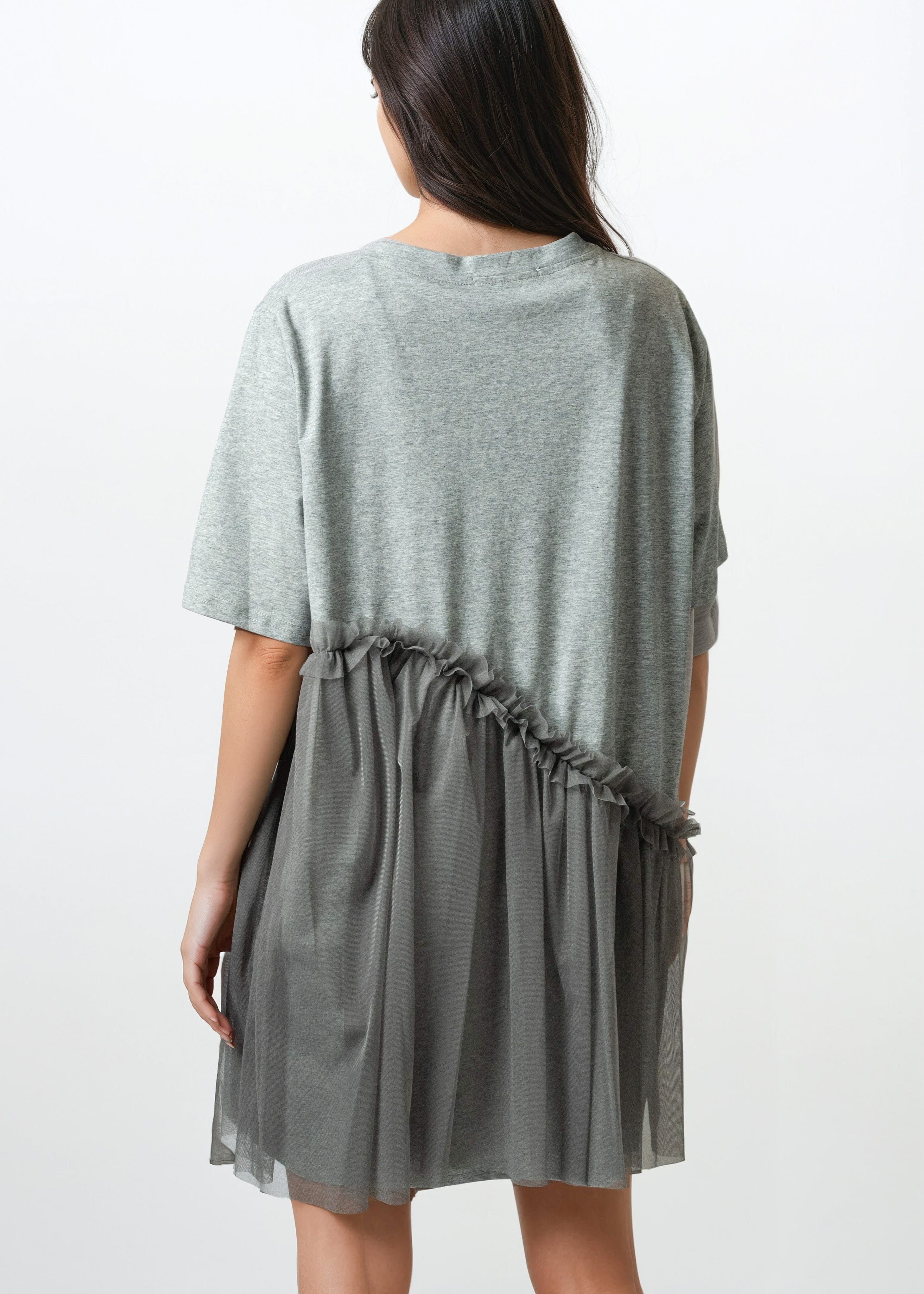 - Oversized tee meets deconstructed glam with asymmetrical tulle layers