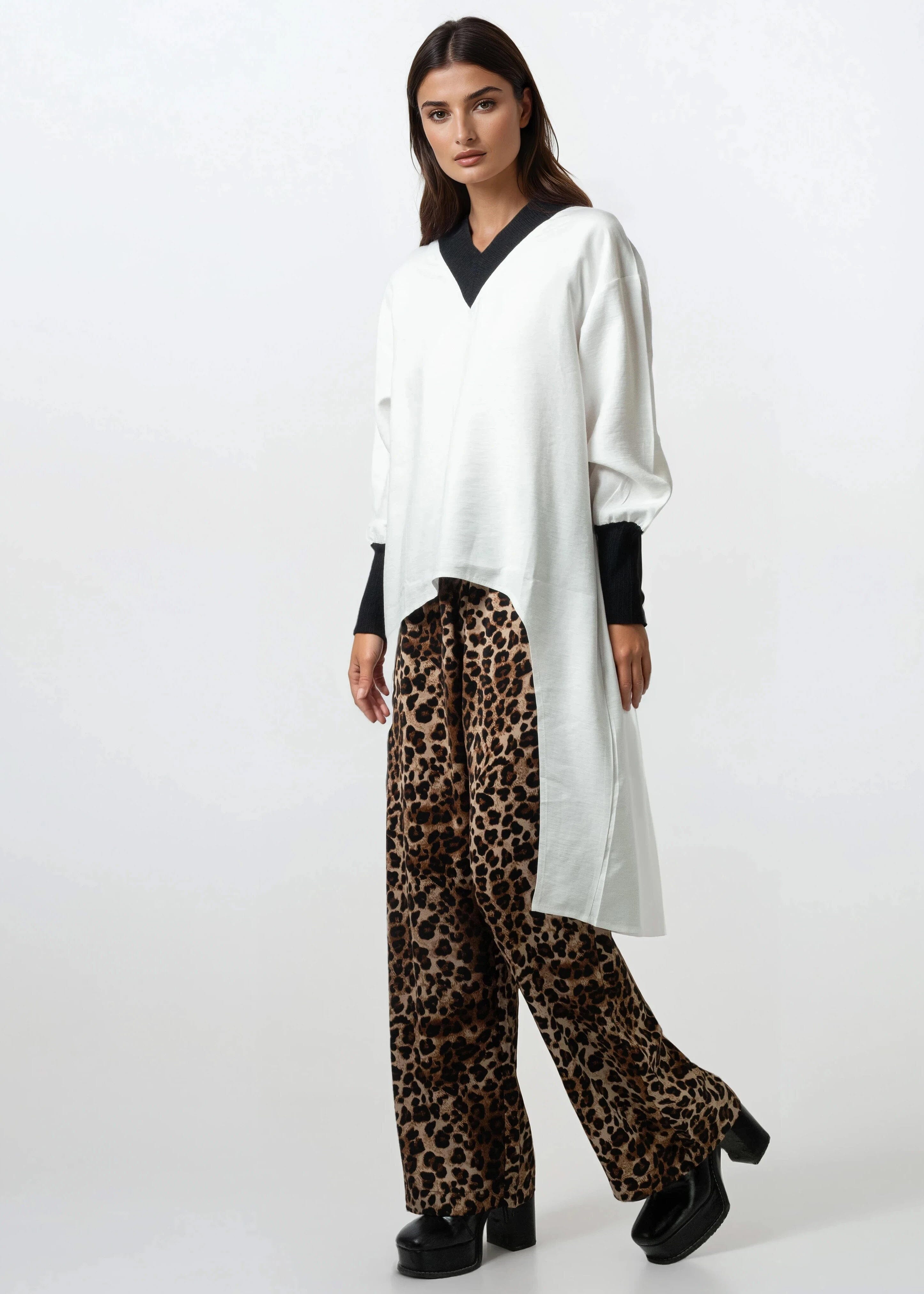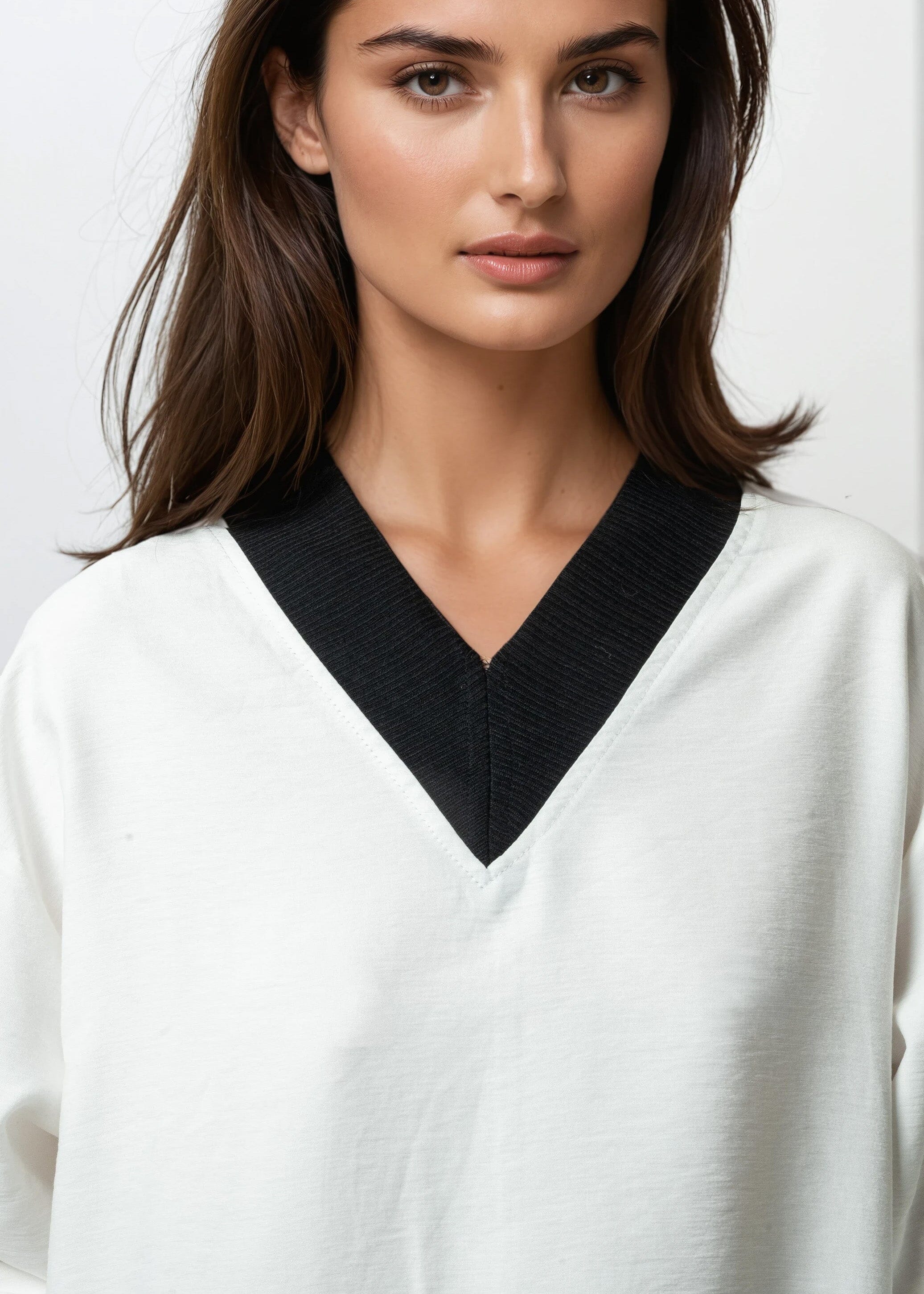 - Relaxed V-neck tunic with contrast rib trim that hits both front and back