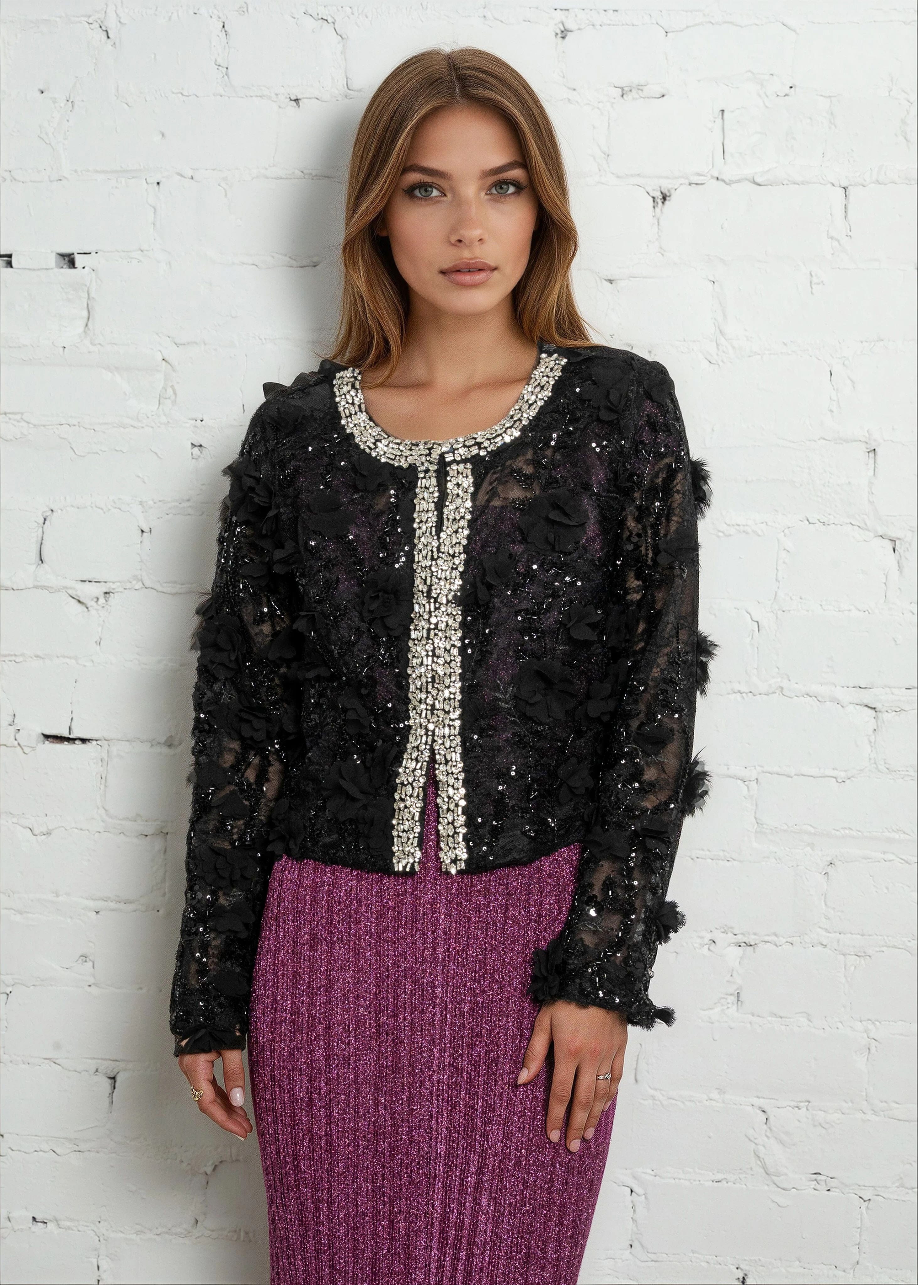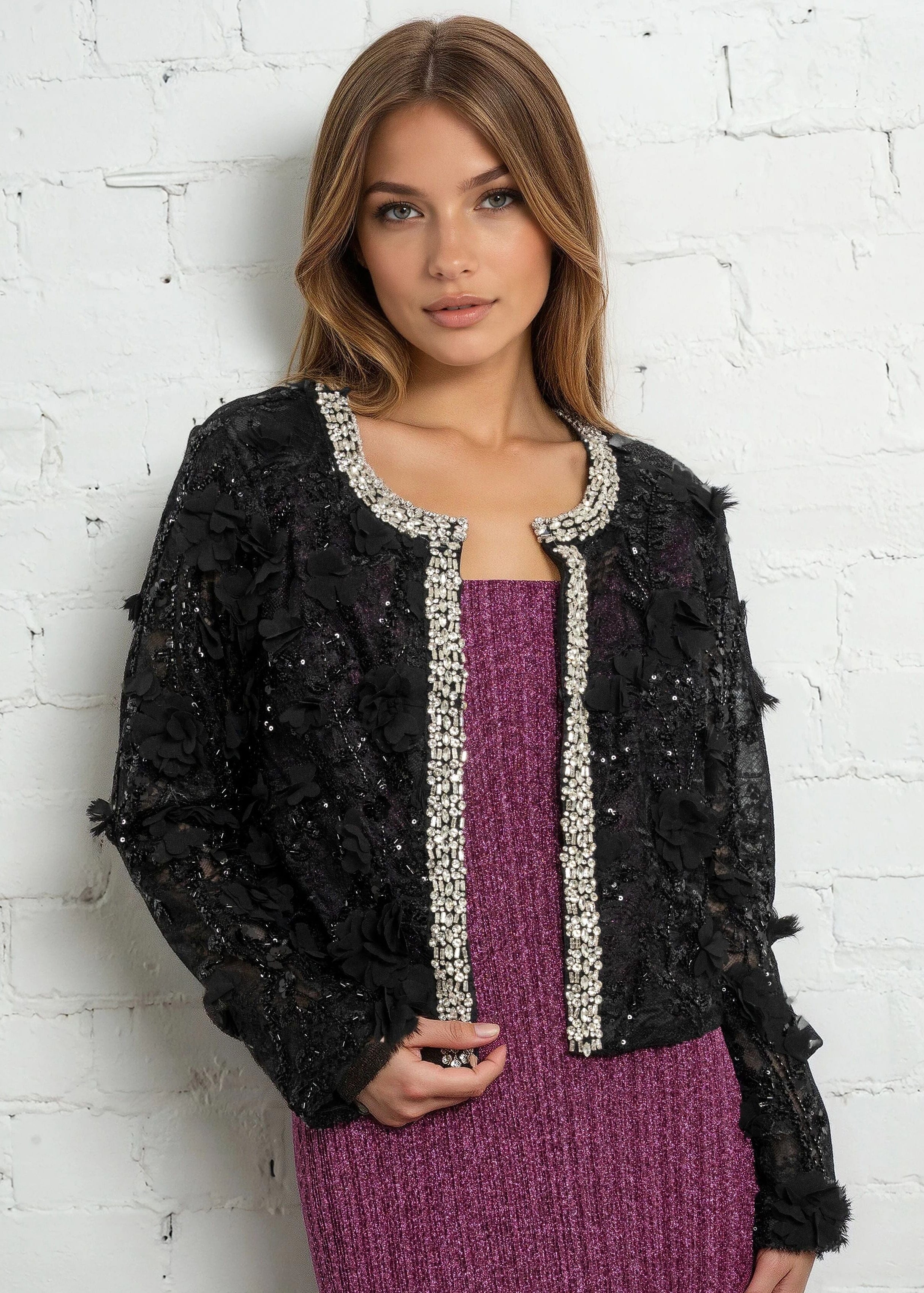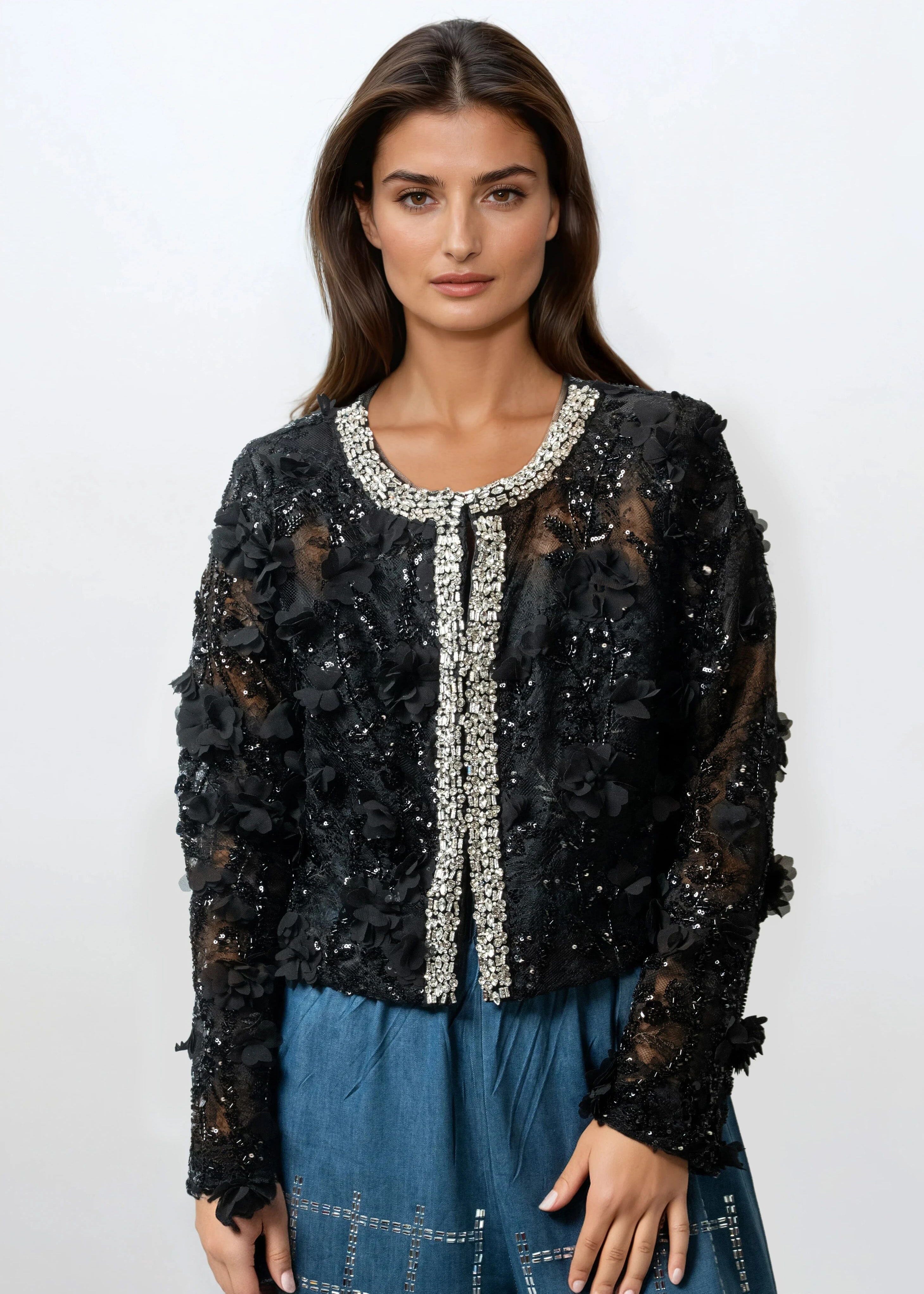 • Sheer lace cardigan with dimensional floral detailing