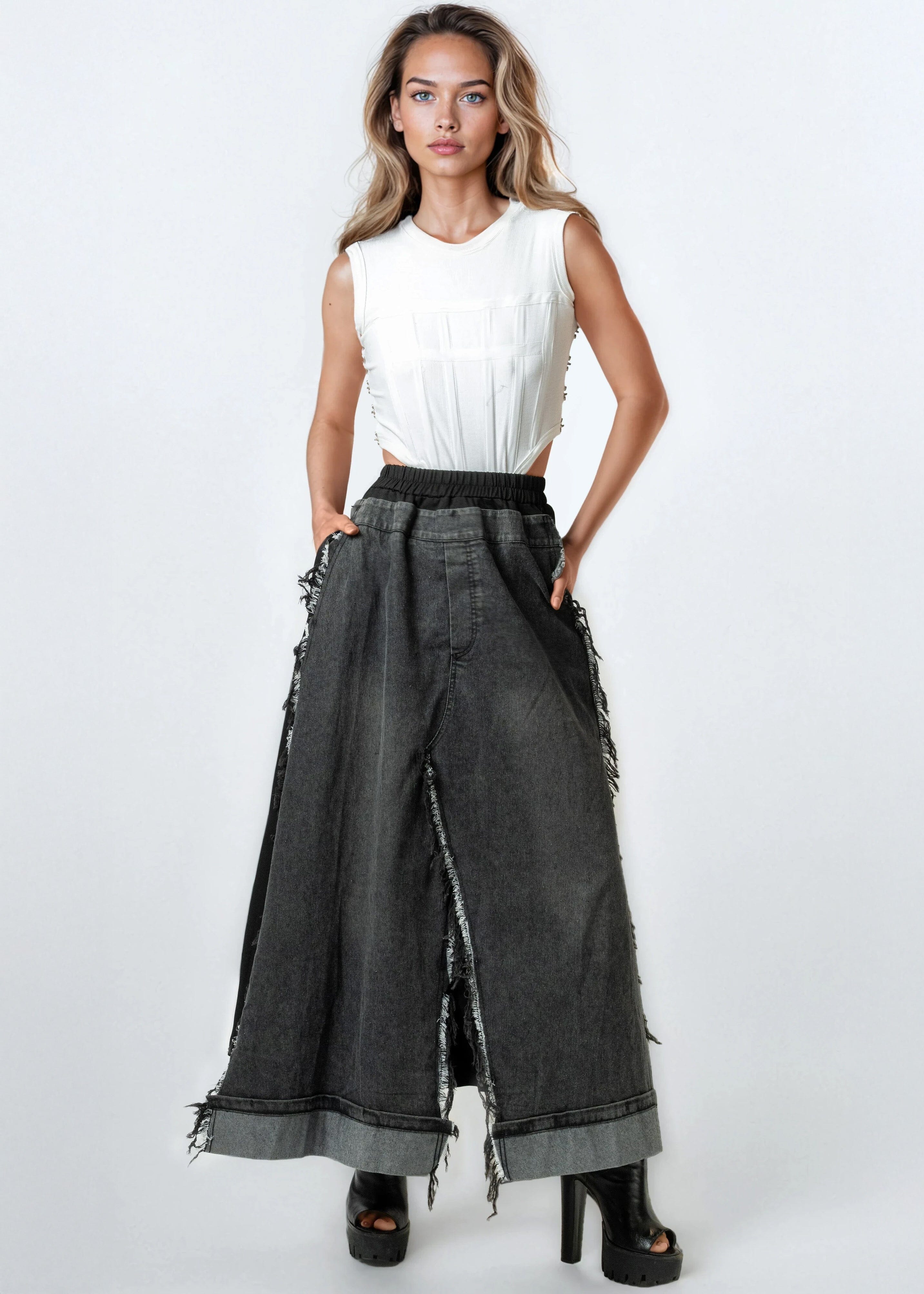 • Ultra-wide-leg silhouette with dramatic drape and frayed edges