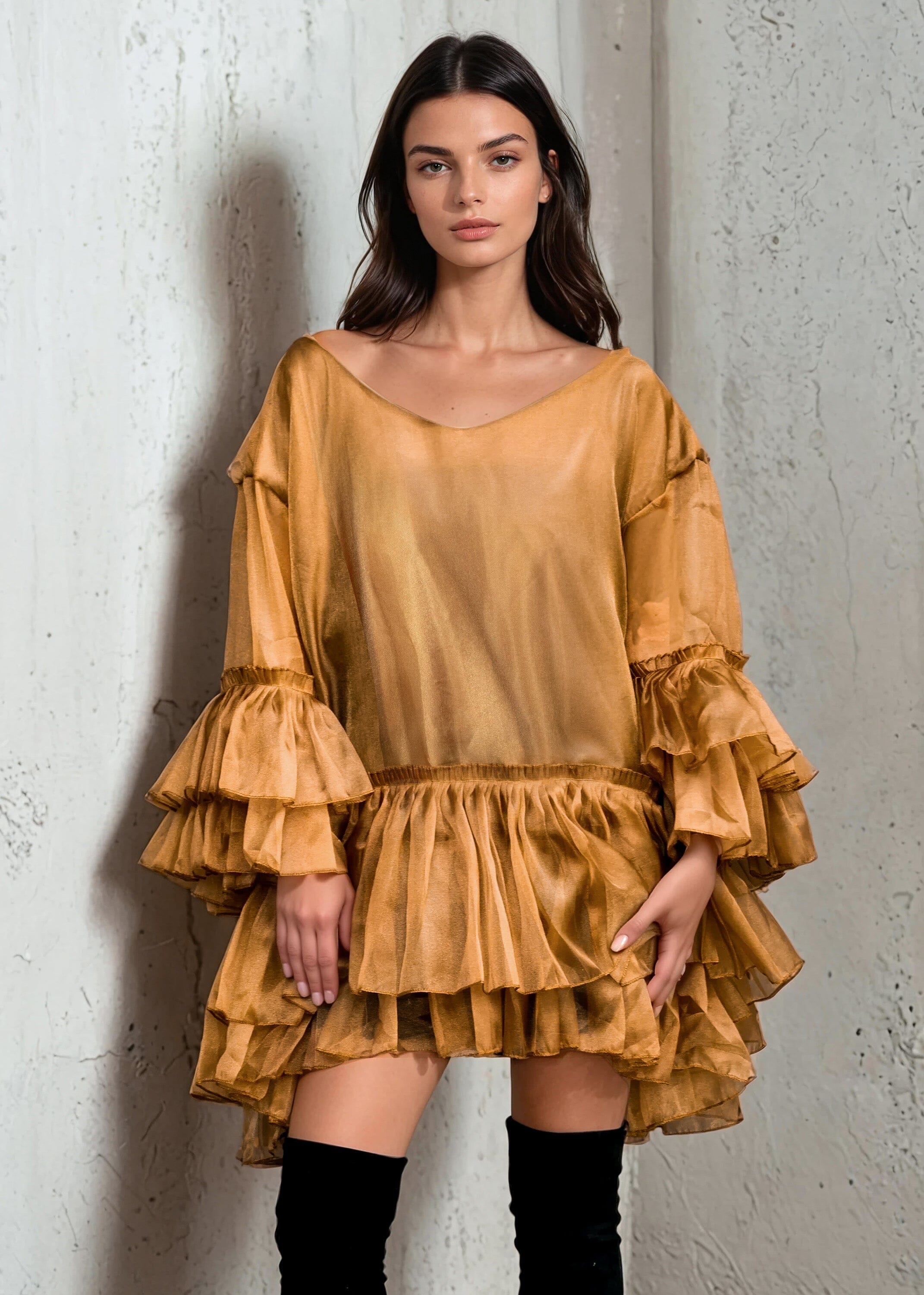 - Voluminous tiered ruffles add dramatic movement