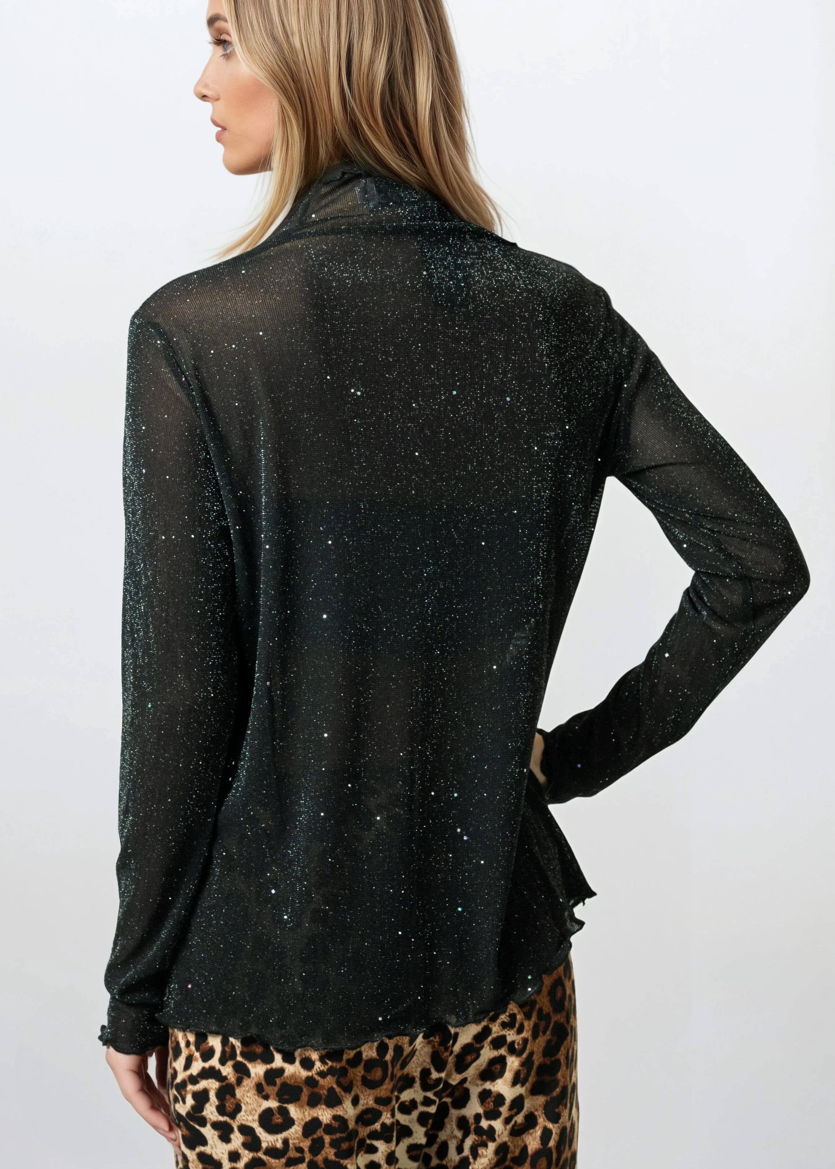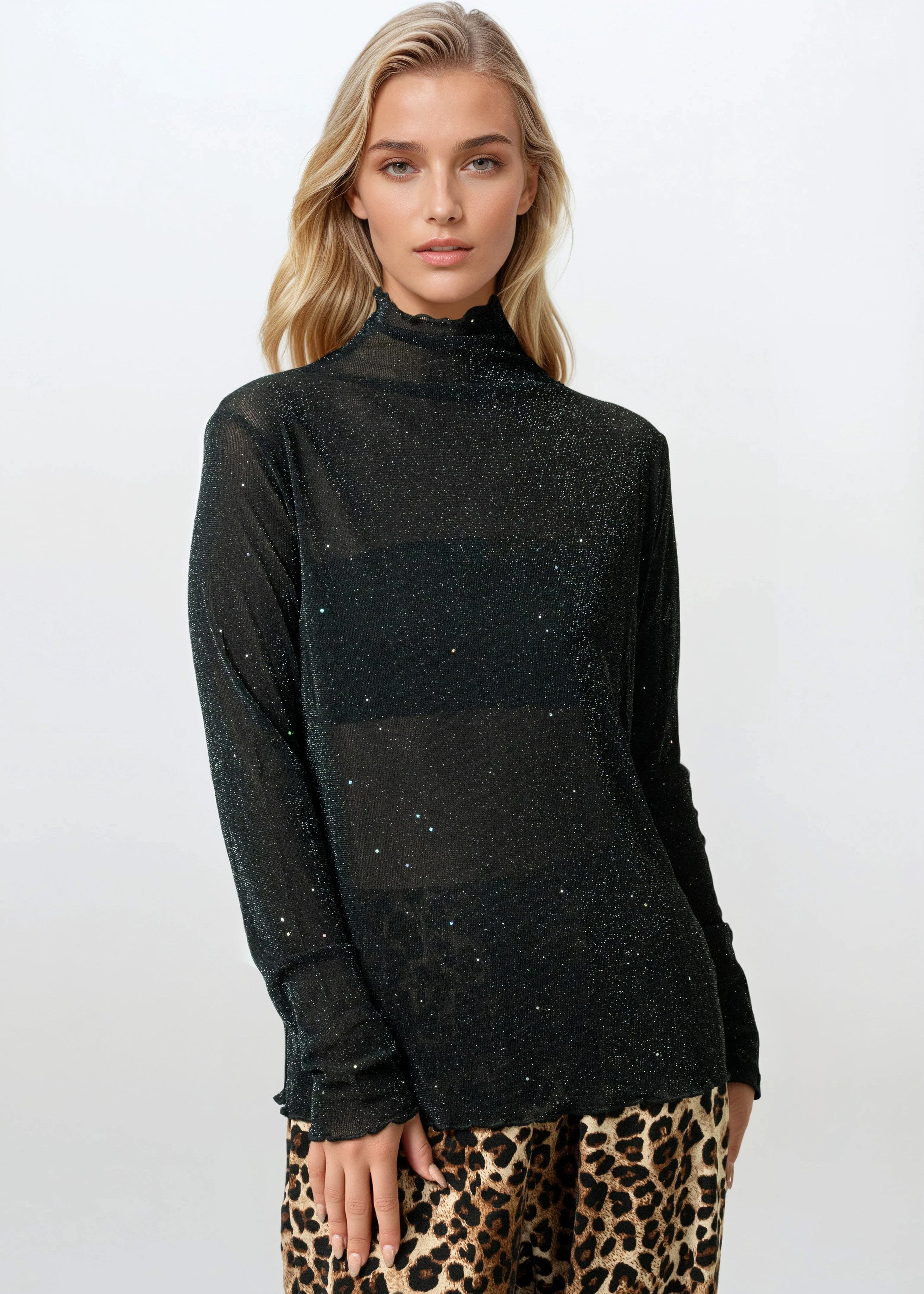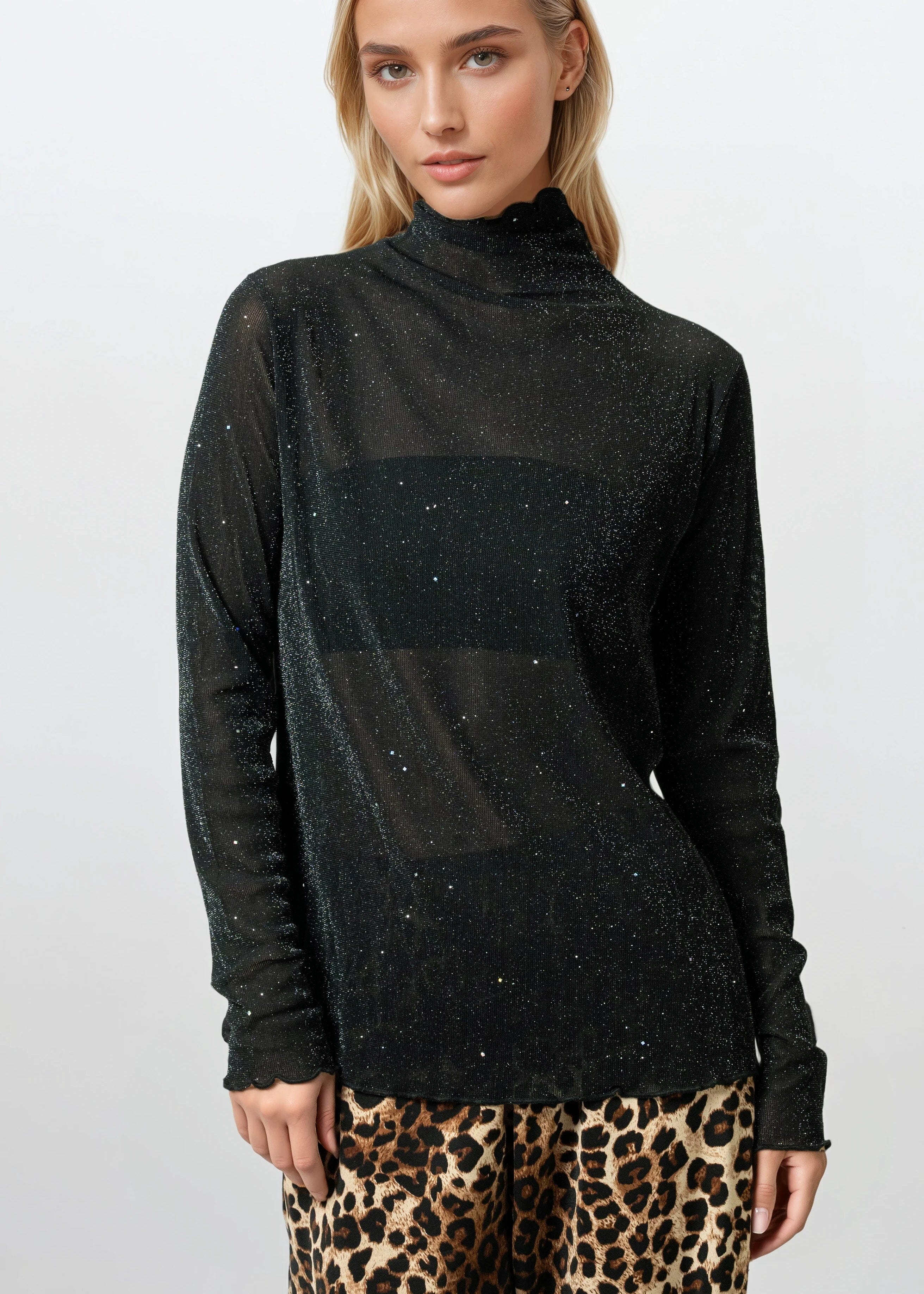 - Sheer black high-neck top dusted with subtle glitter for a night-sky effect
