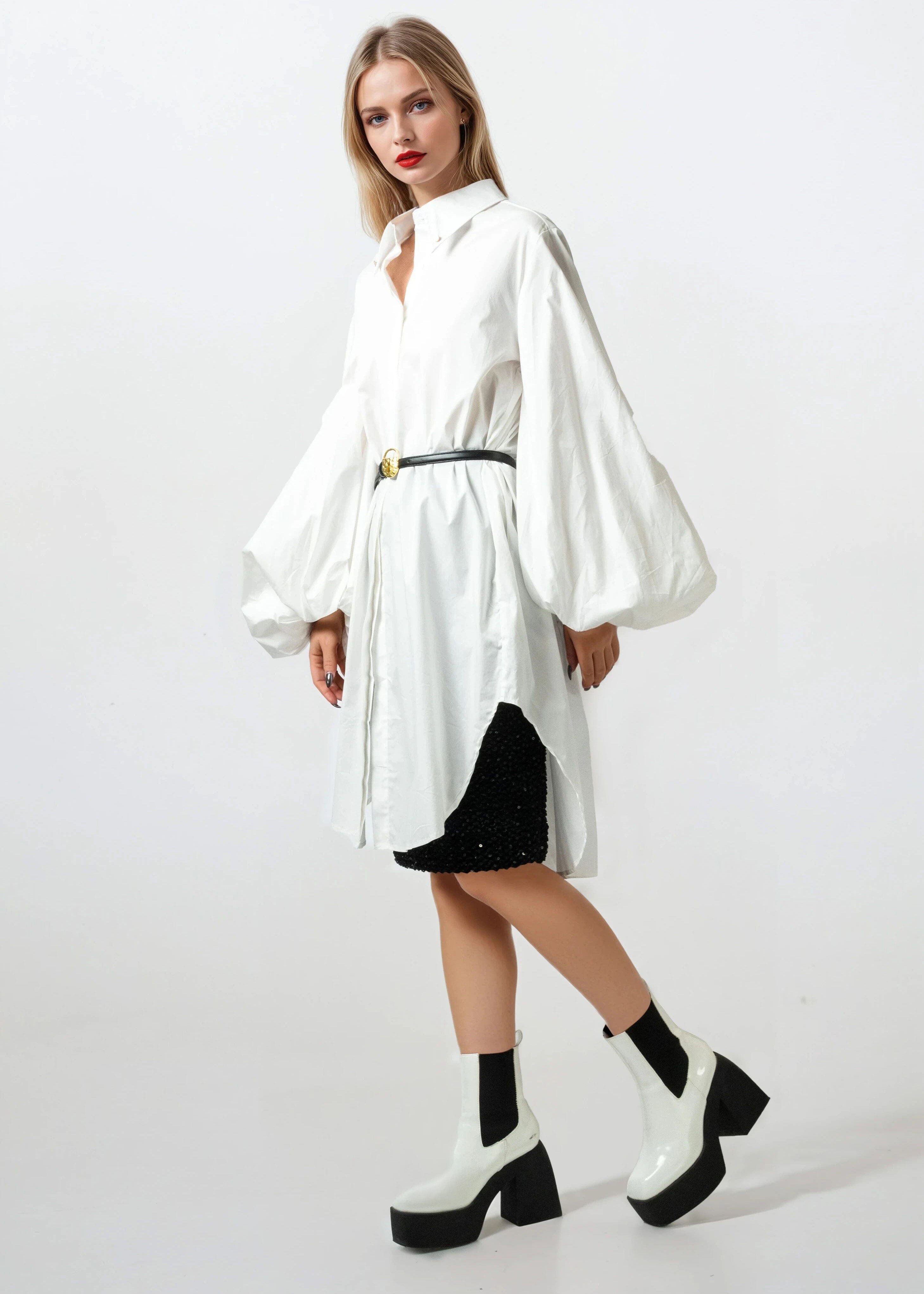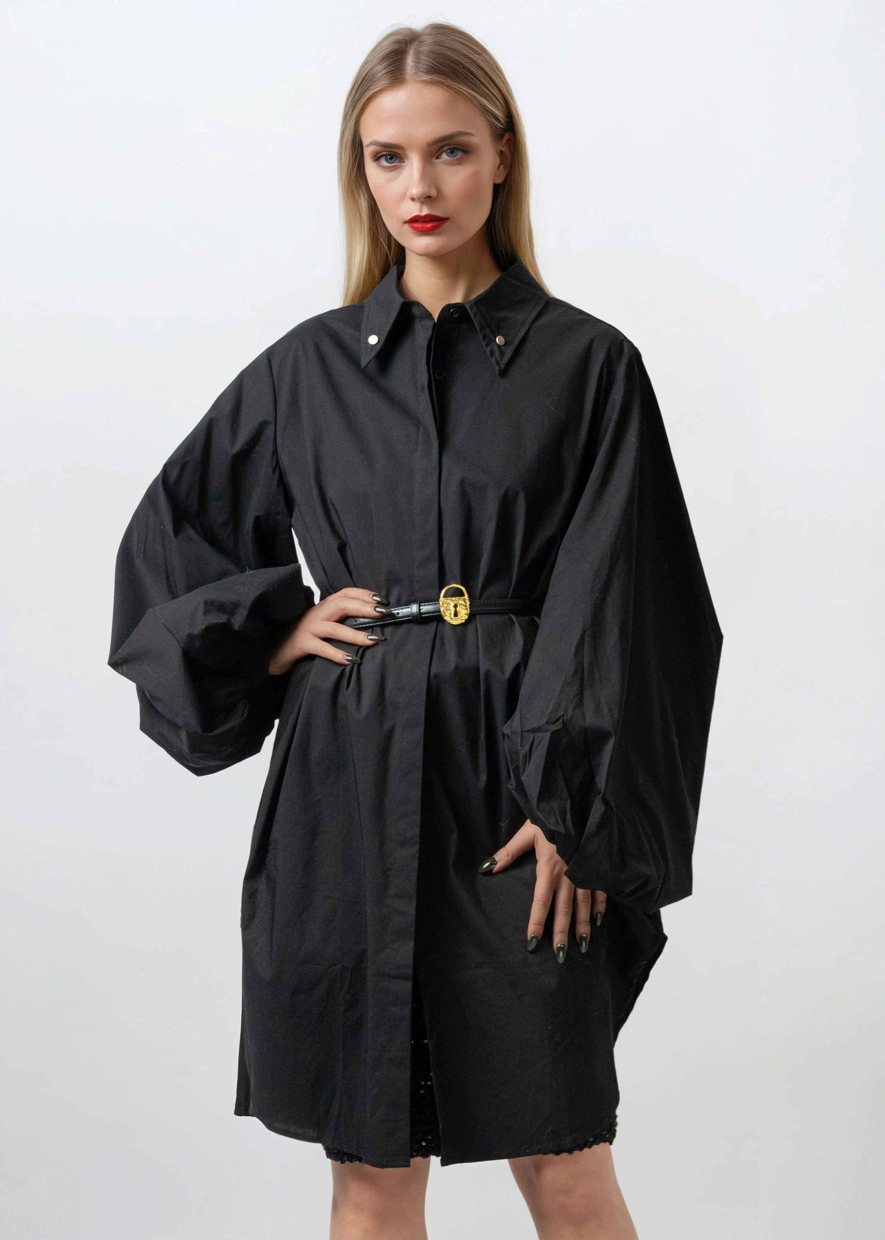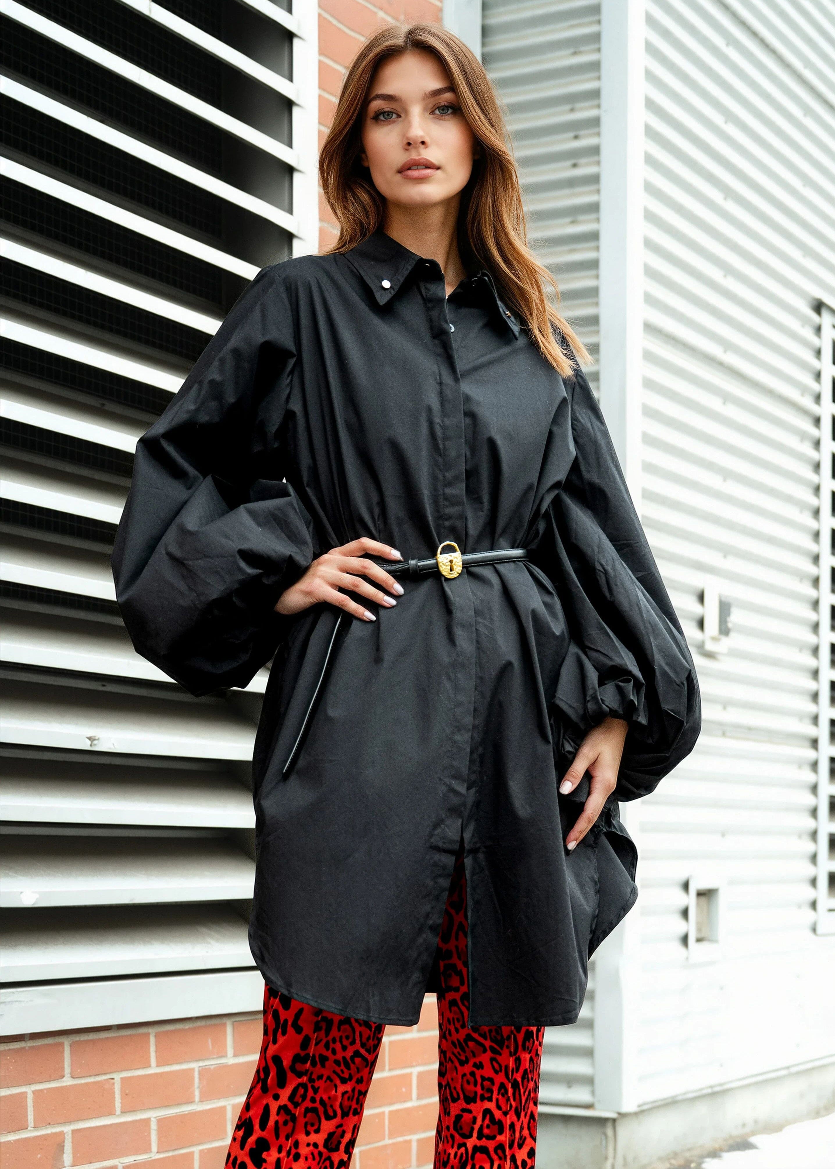 - Oversized shirt-dress silhouette with dramatic balloon sleeves