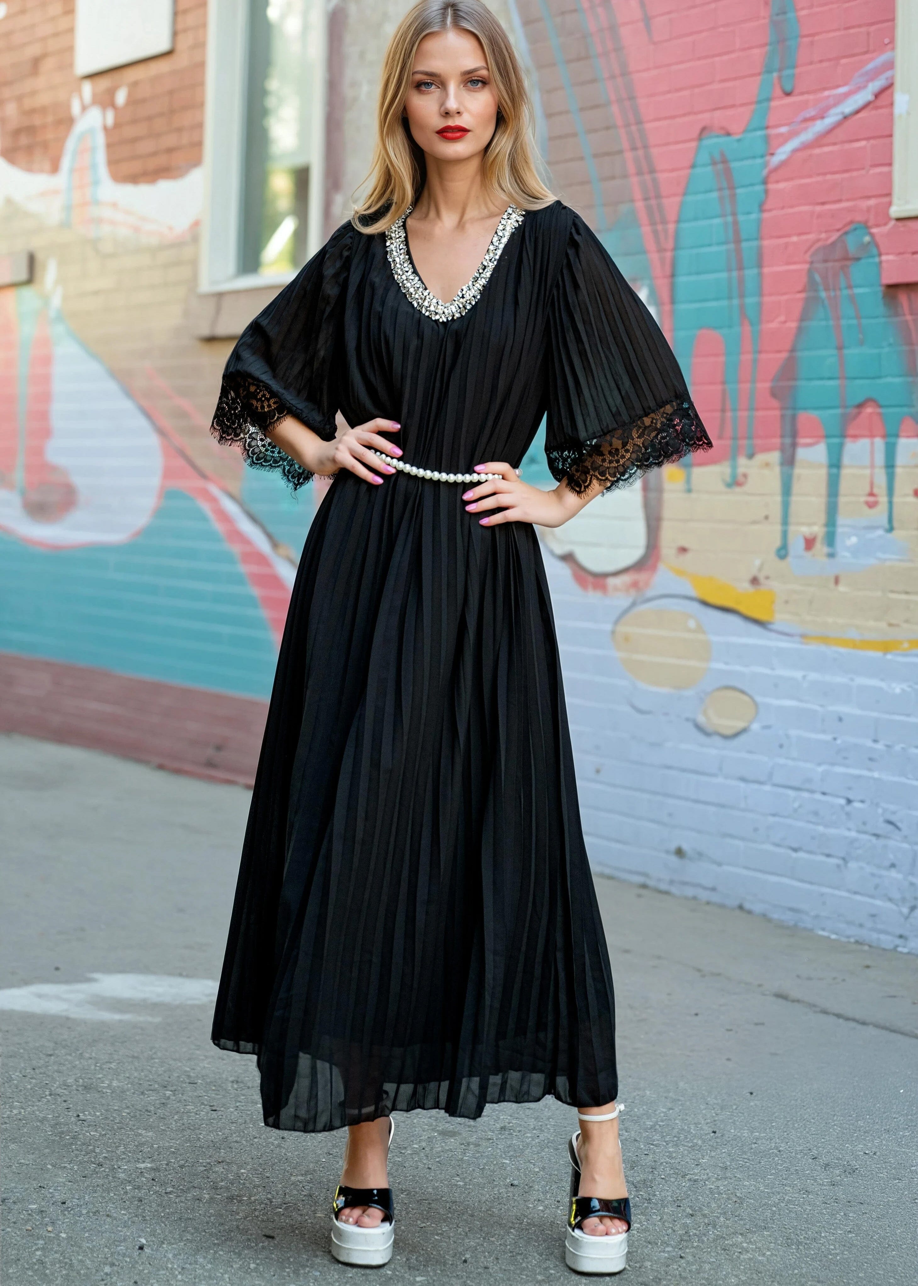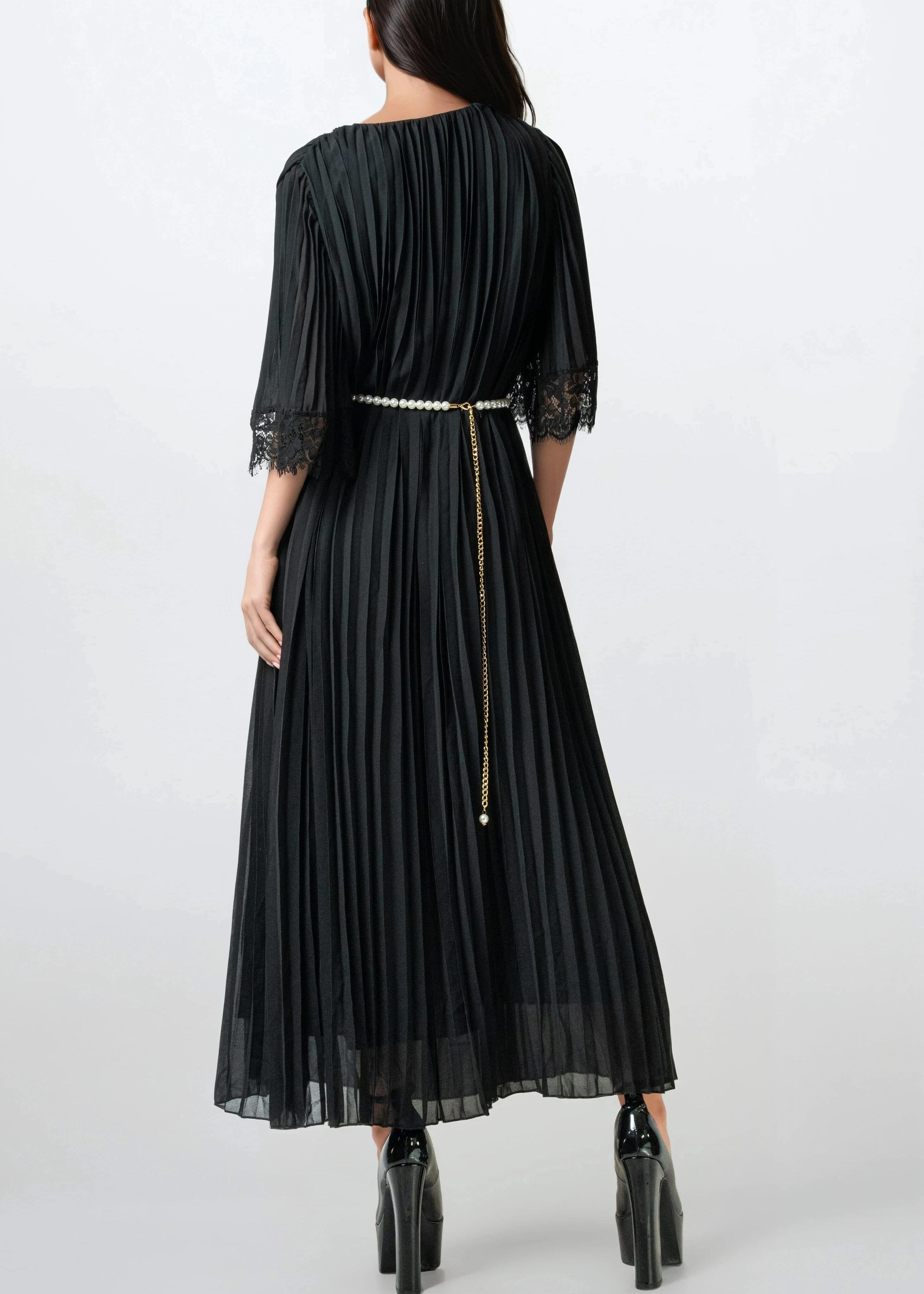 • Black pleated maxi with sheer flow and movement