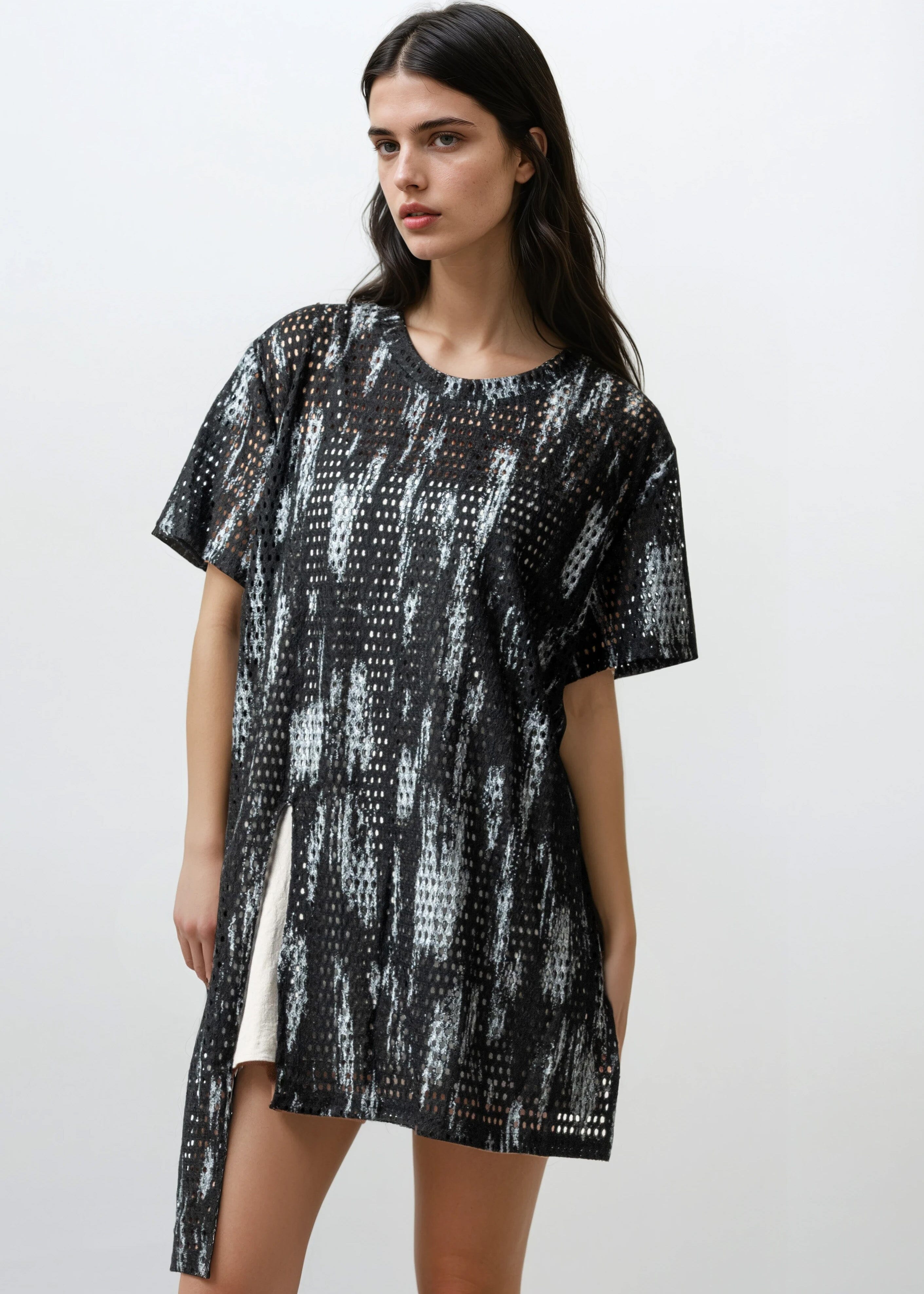 - Distressed mesh with a shredded metallic effect for a raw, industrial vibe
