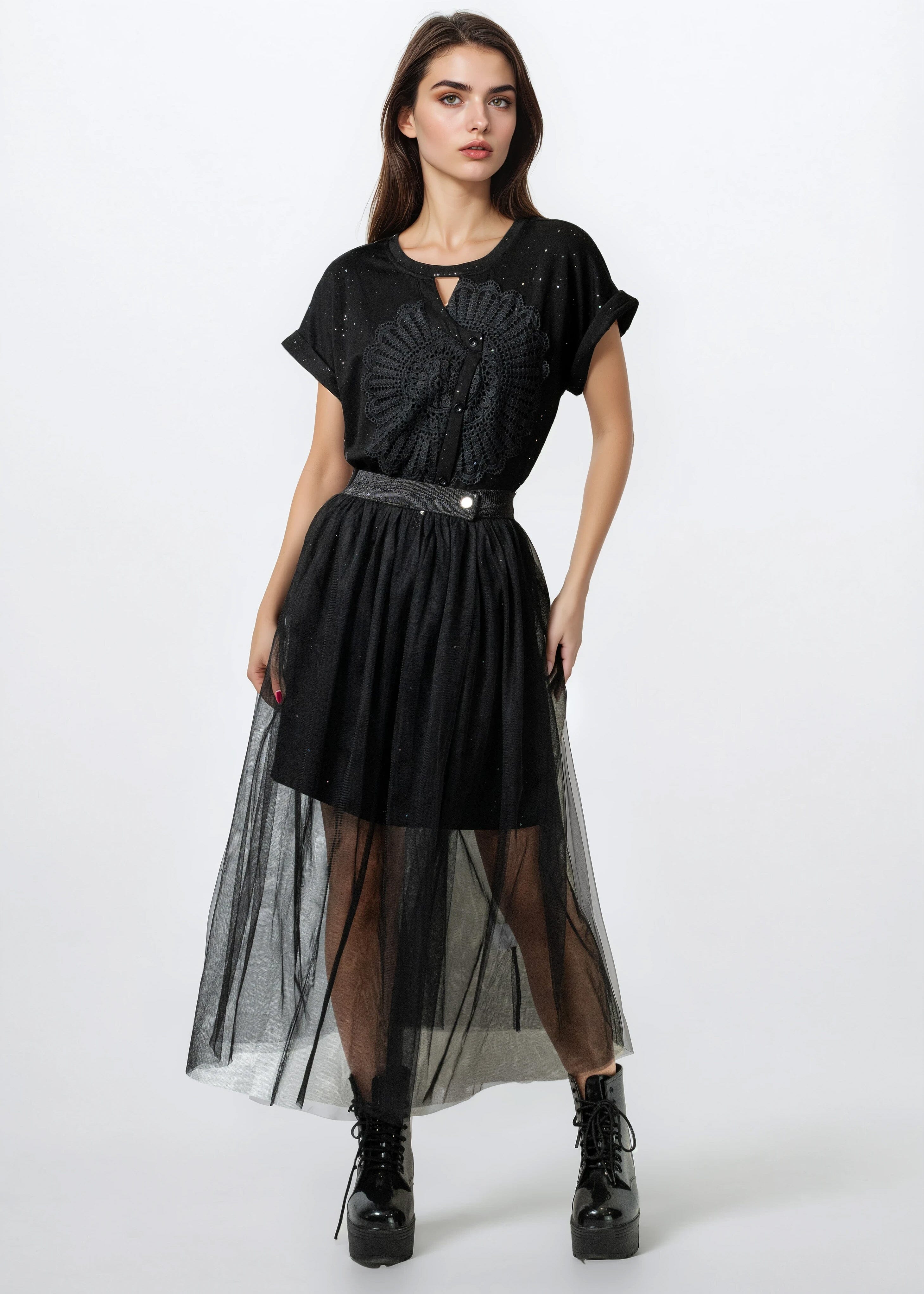 - Two-piece set: glitter tunic + sheer tulle overlay skirt
