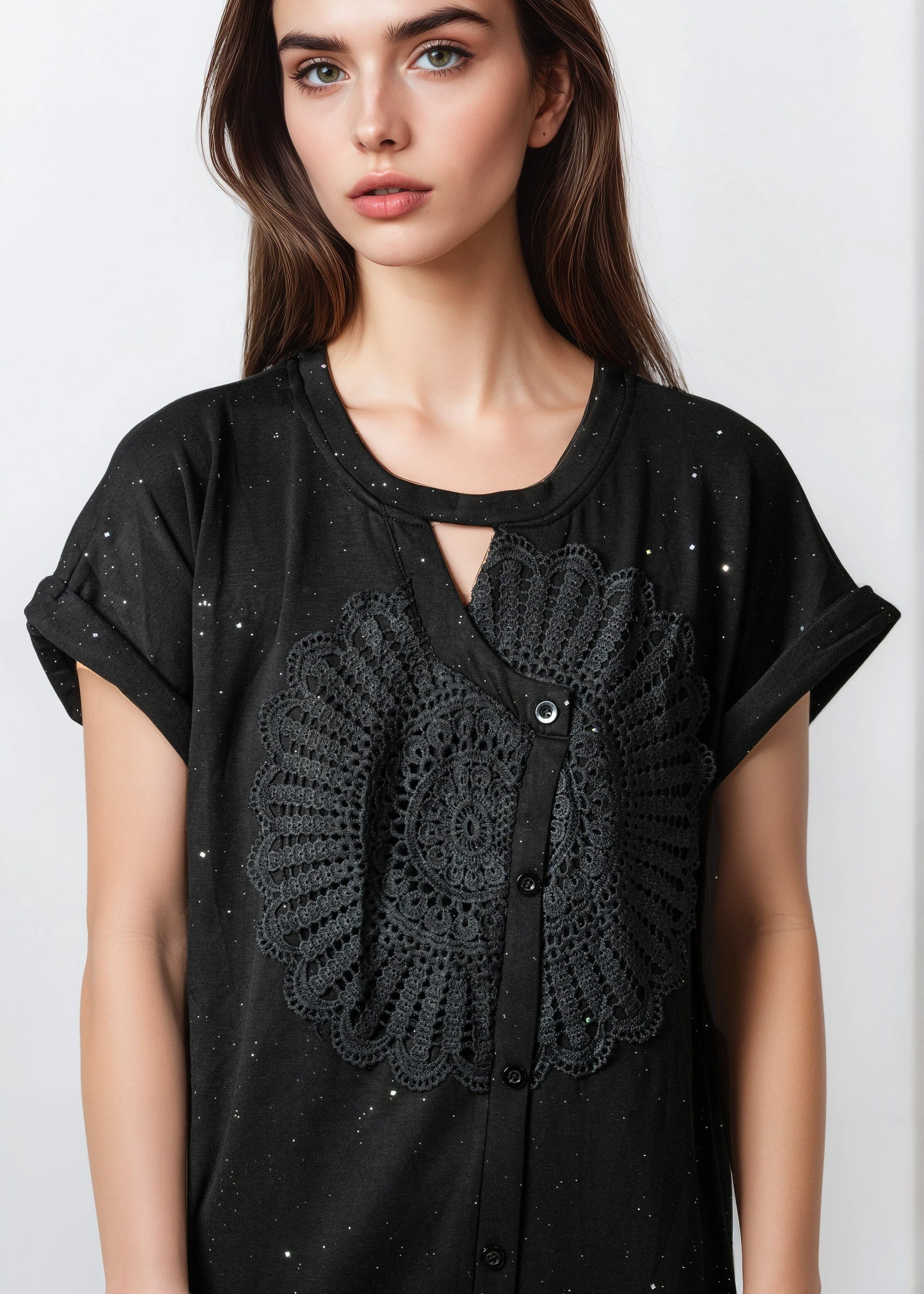 - Tunic features crochet-inspired chest detail with subtle sparkle