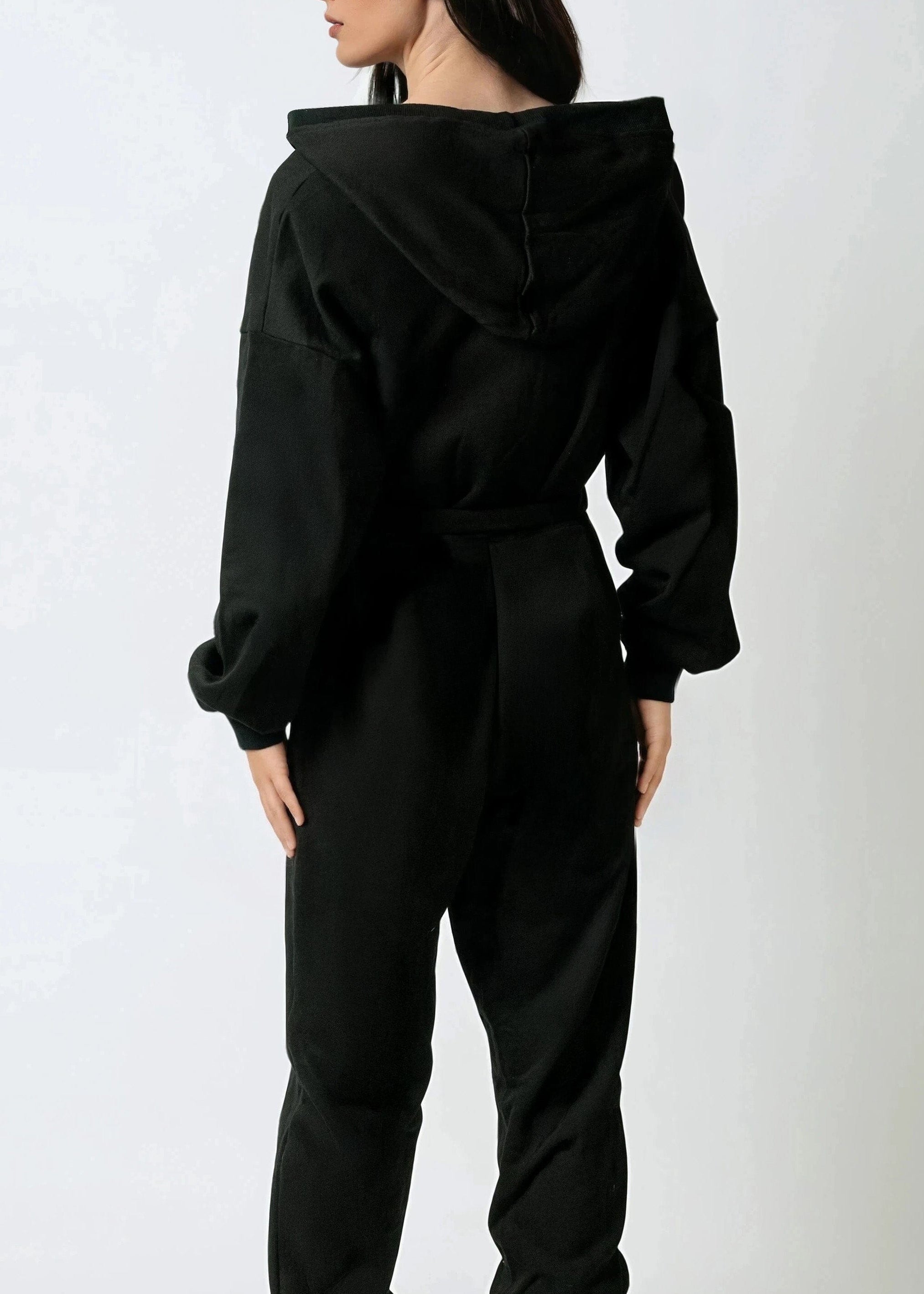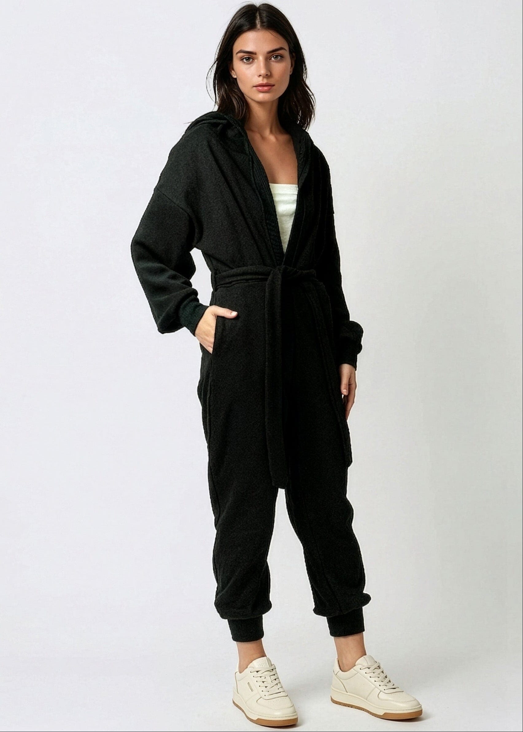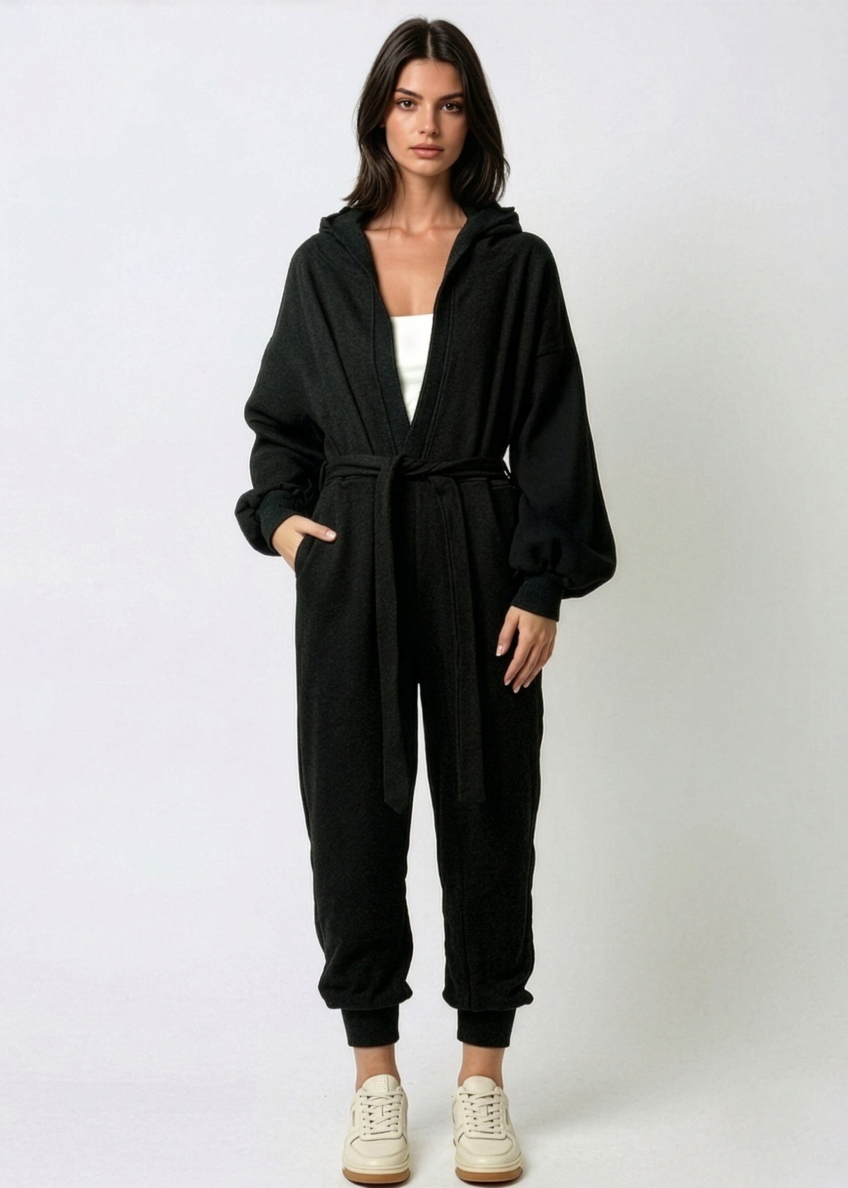 The hooded jumpsuit that proves comfort and cool aren't a compromise. This full-length athleisure jumpsuit brings a deep V neckline and detachable waist tie belt to a soft, sweatpant-fabric one-piece — so you get the ease of a loungewear day with the silhouette of a styled outfit. One piece, zero effort, full impact.