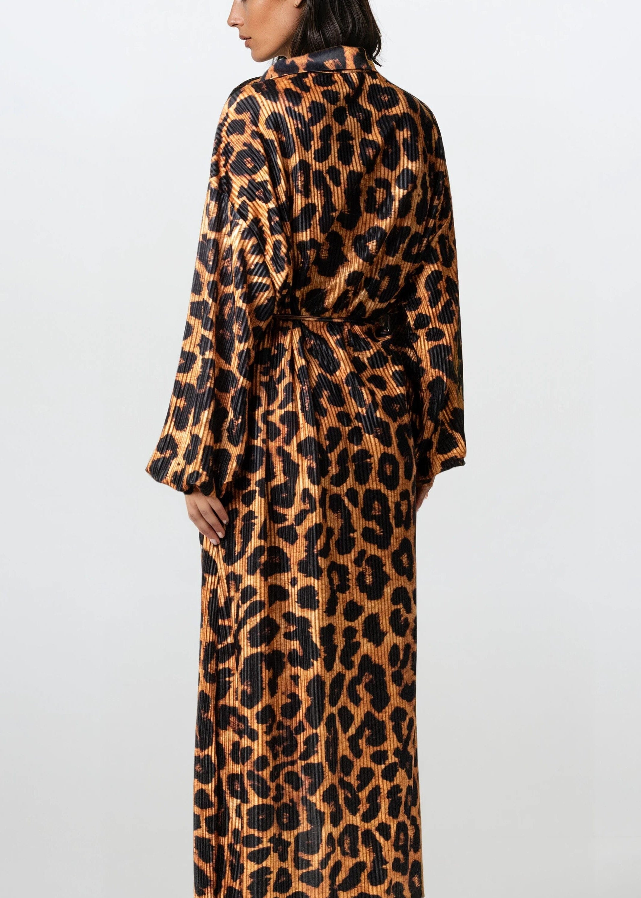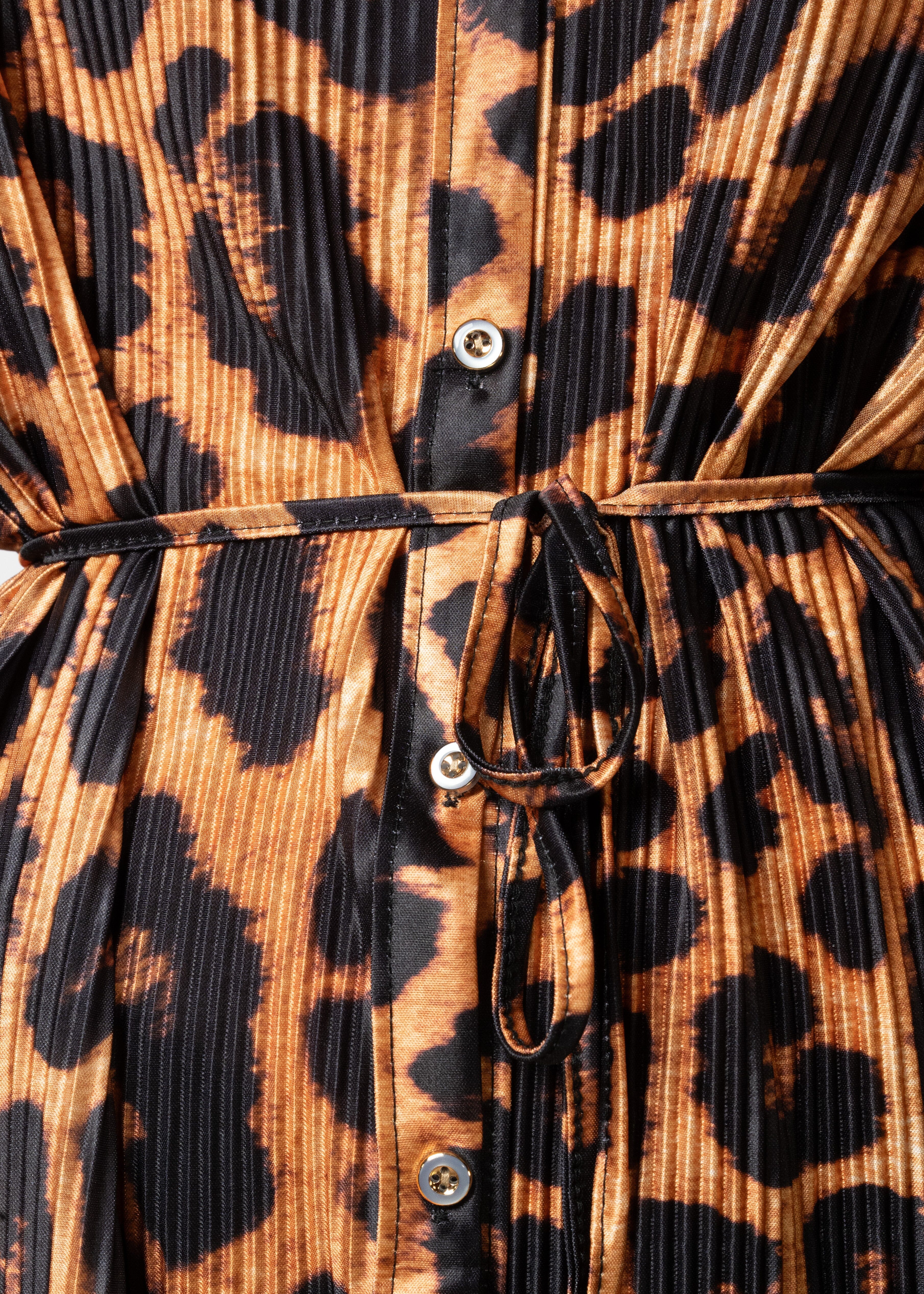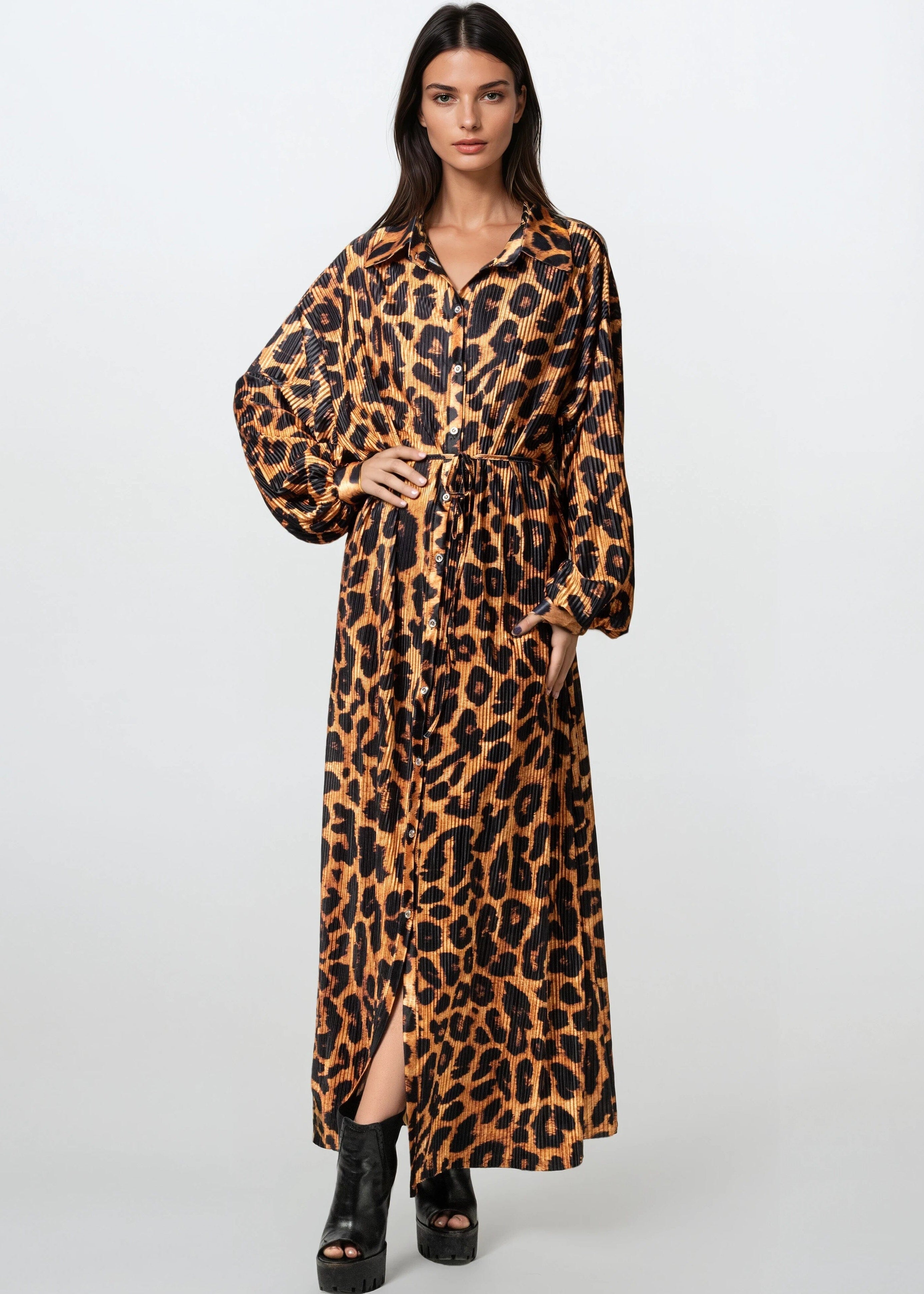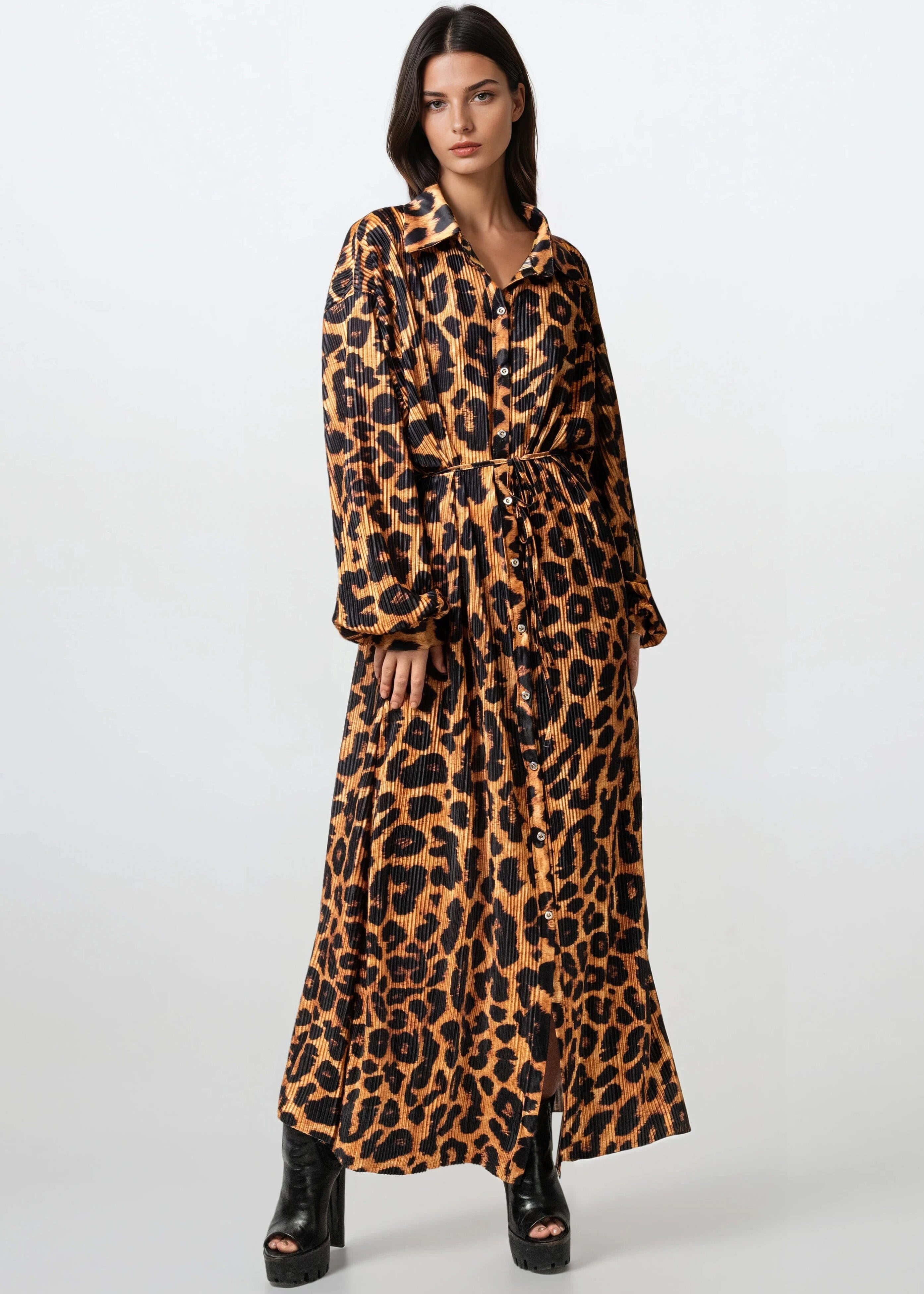 Long Pleated Leopard Shirt Dress