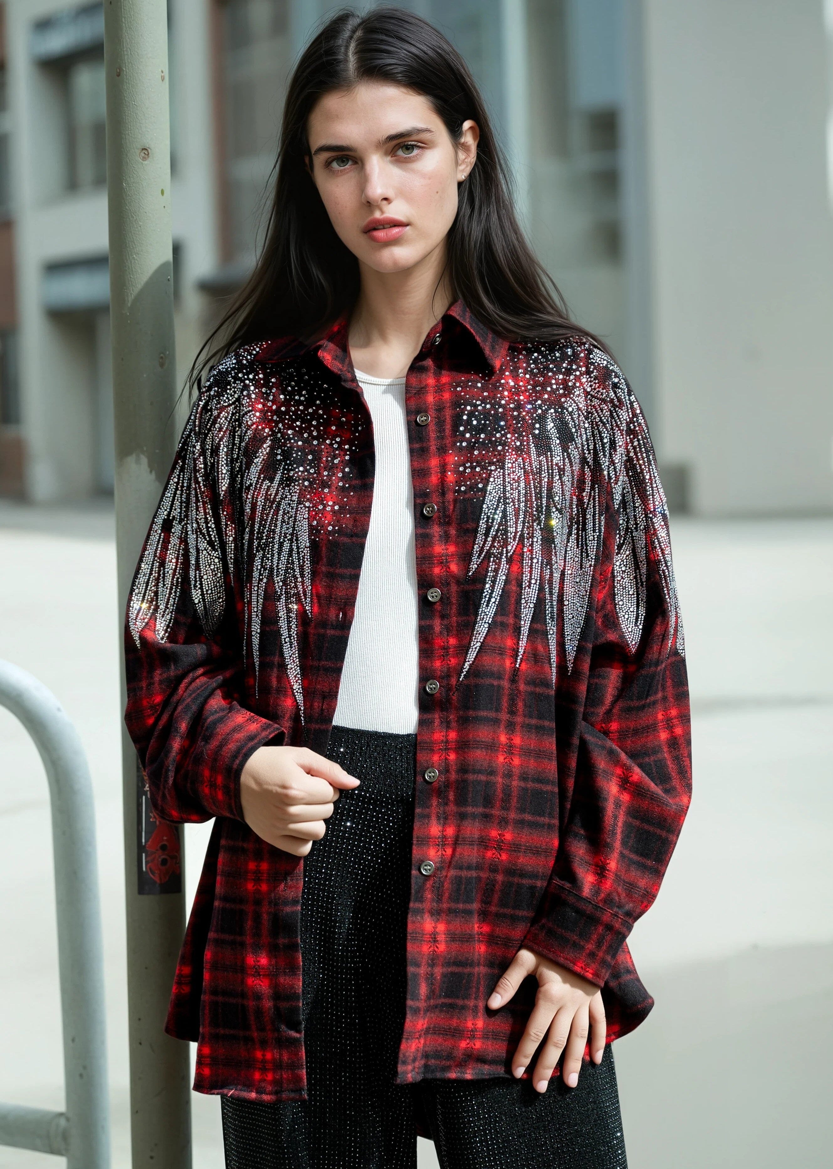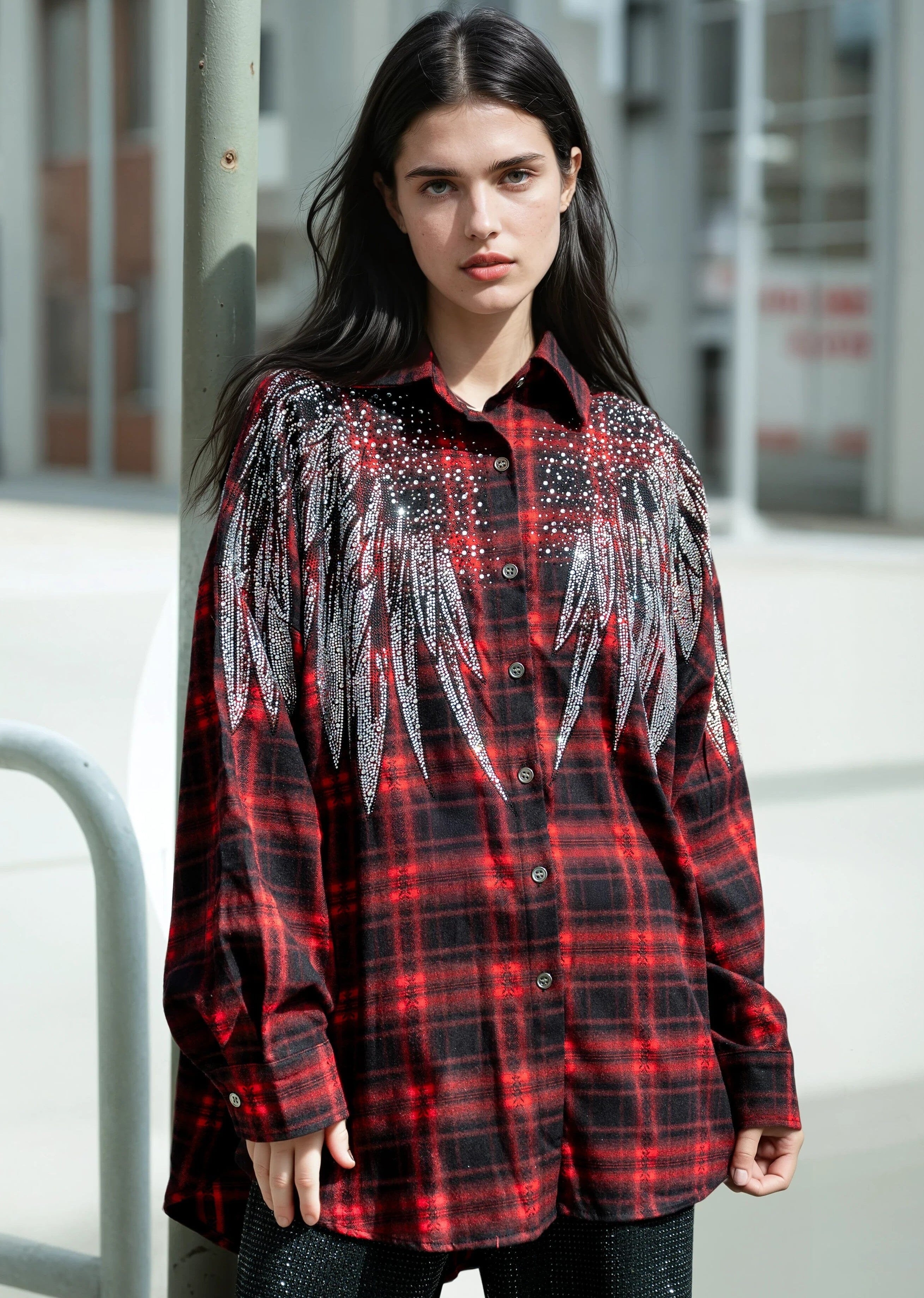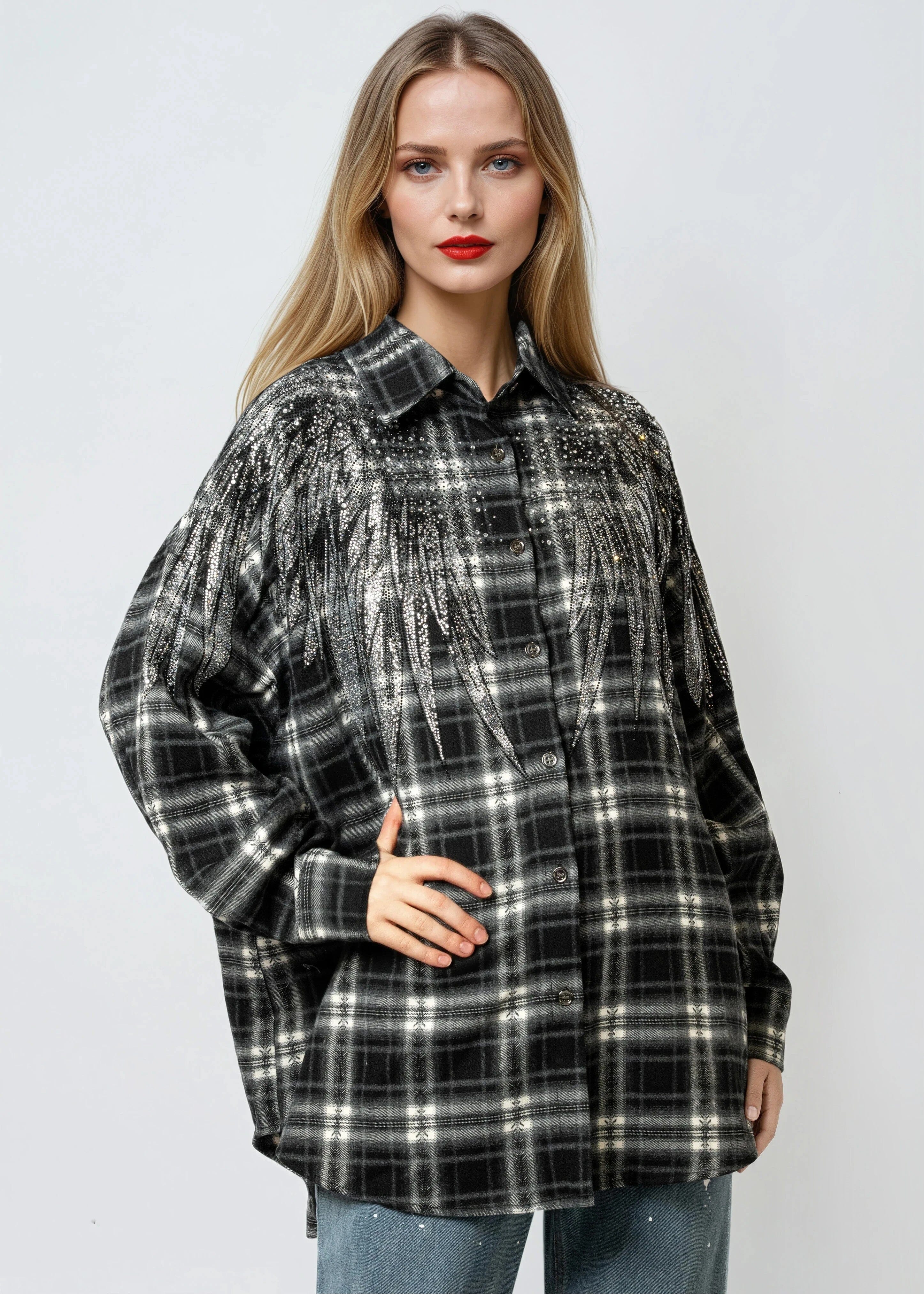 Plaid gets a serious upgrade. This rhinestone embellished button-up takes a classic base and covers the shoulders and back in a wing and cross motif that turns every exit into a moment. Wear it buttoned up, thrown open over a bodysuit, or tied at the waist — the back does the heavy lifting either way.