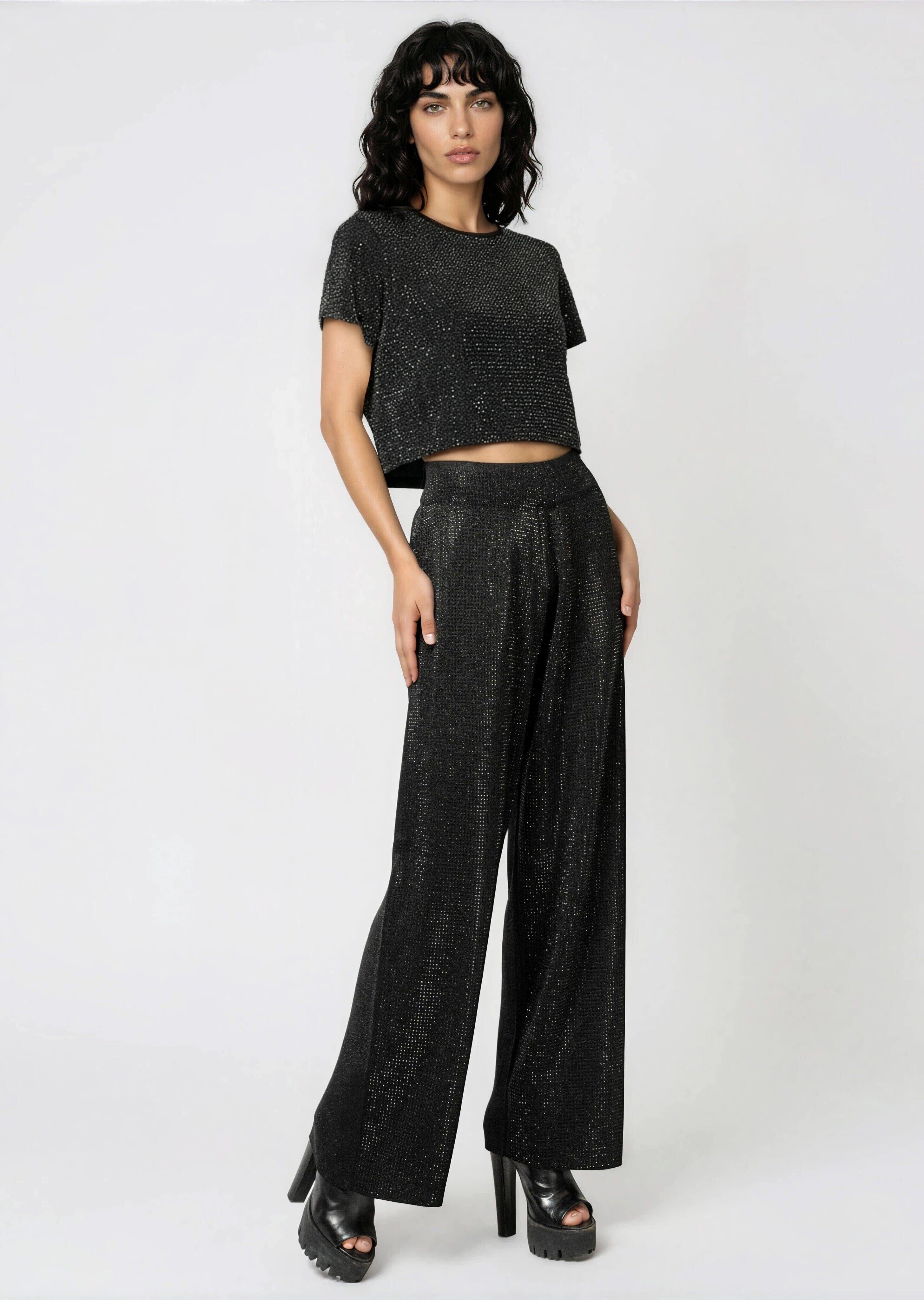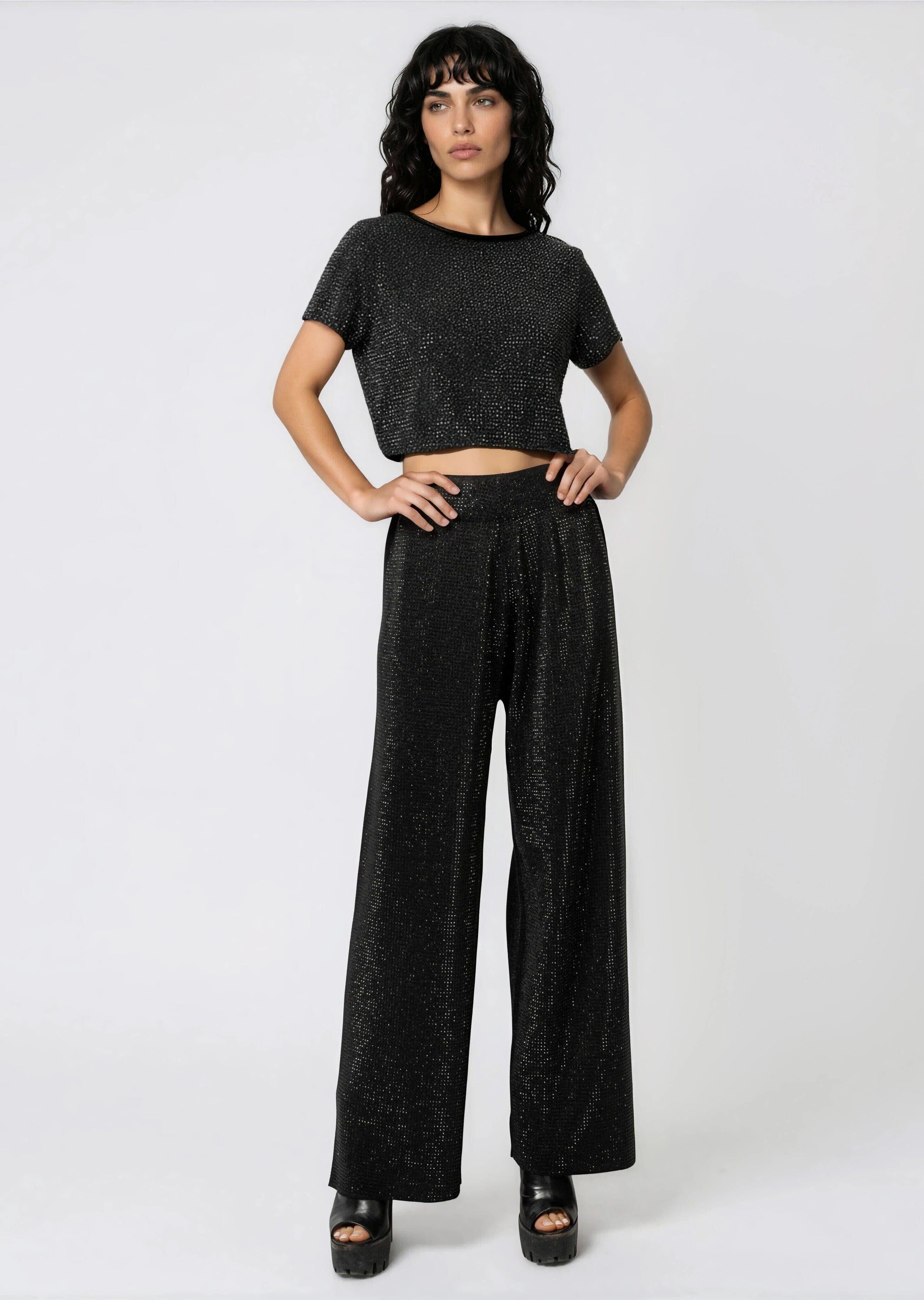 One pant, zero effort, full impact. The rhinestone studded front panel does all the talking — grab these in silver or black, throw on a simple fitted top, and you're done. This is the kind of wide-leg pant that makes people ask if you tried, and the answer is barely.