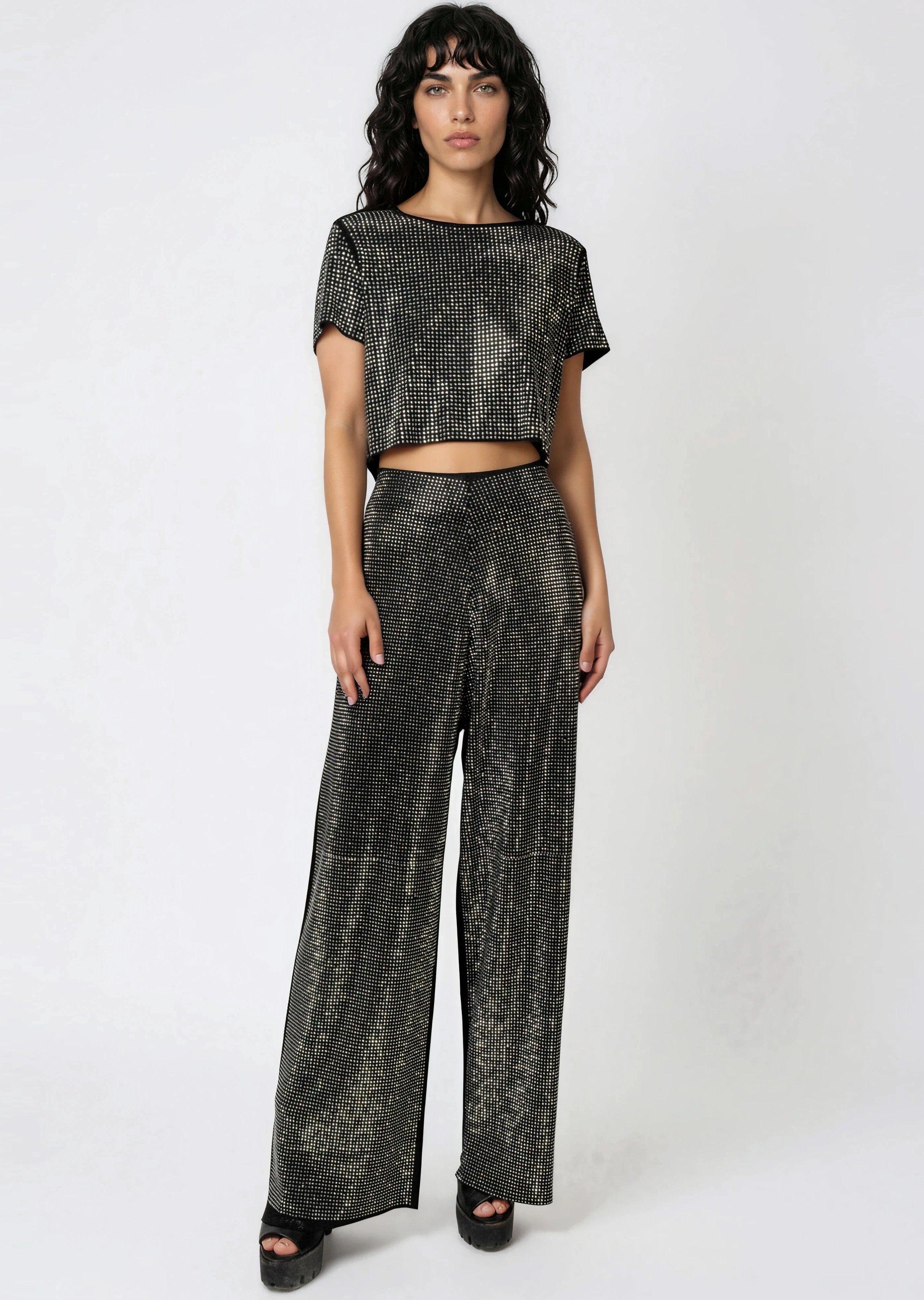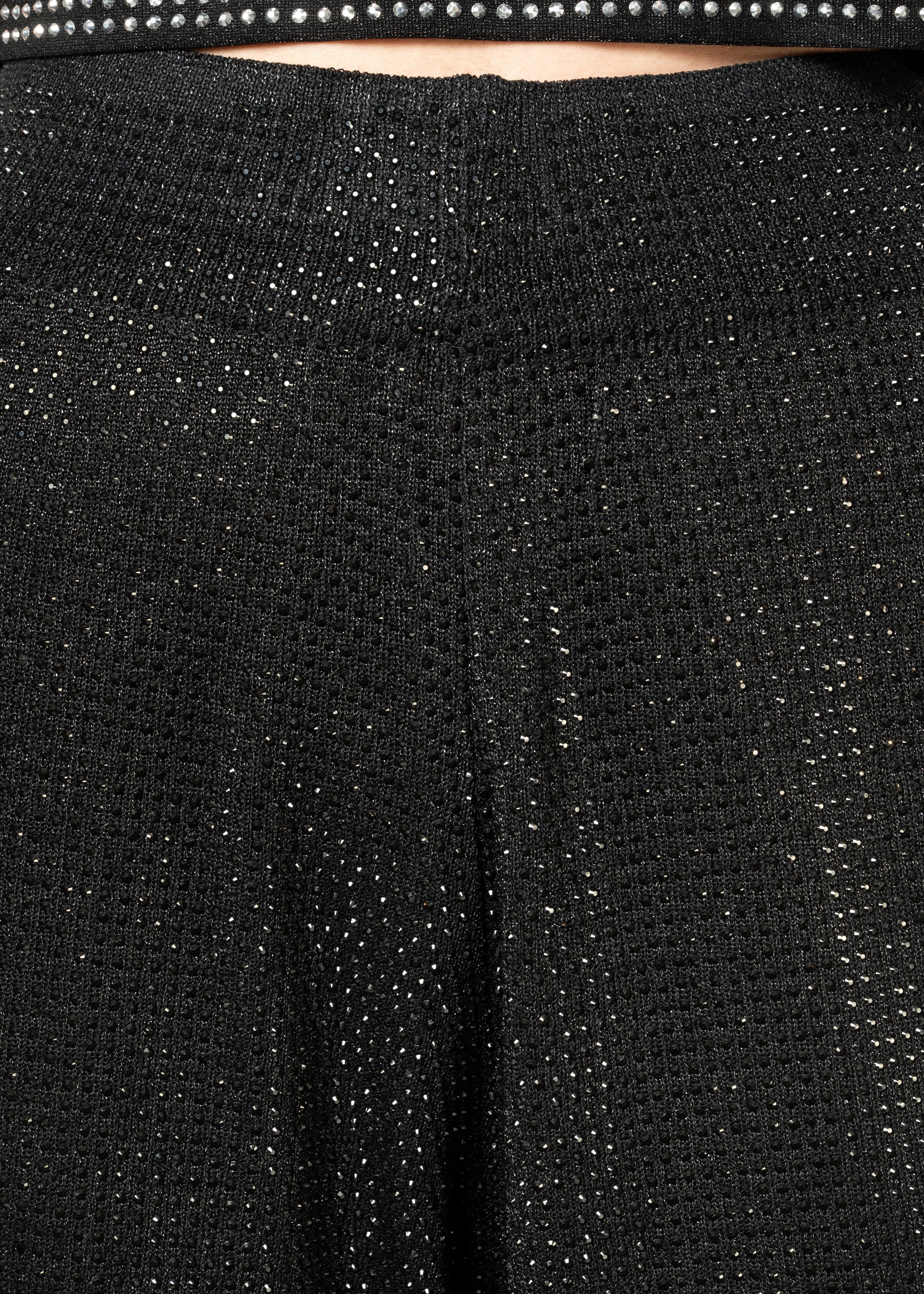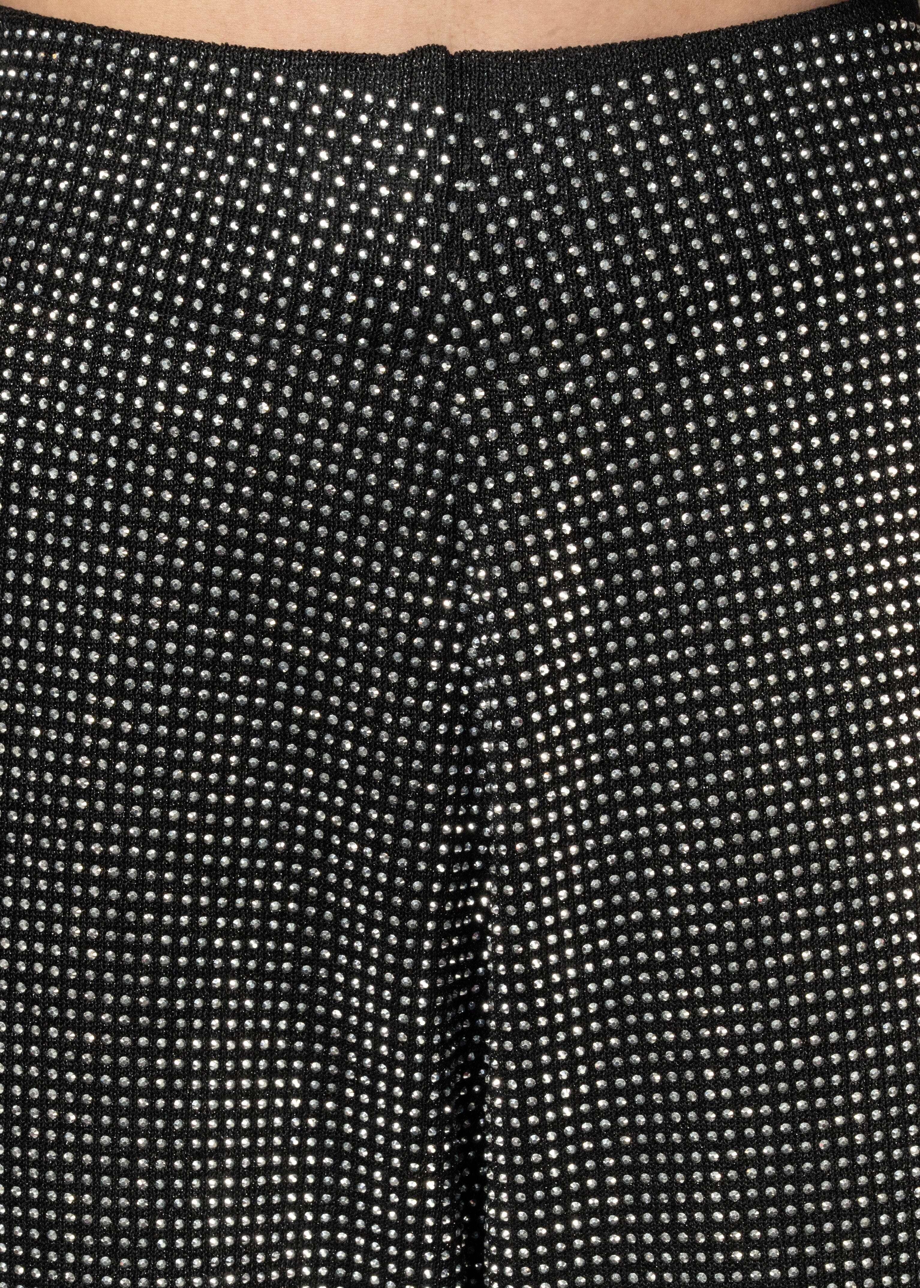 • Design: All-over rhinestone studded front panel with a contrast solid back, clean minimal elastic waistband, and fluid drape through the leg that catches light with every step.