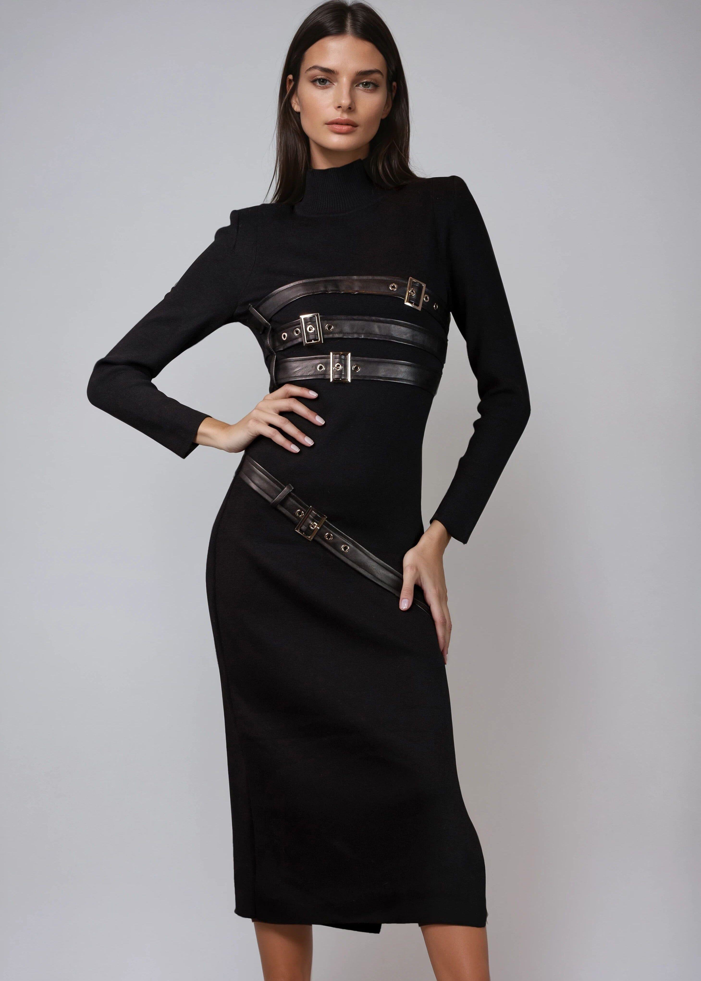 - Triple vegan-leather buckles across the front bodice for a corset-coded edge