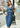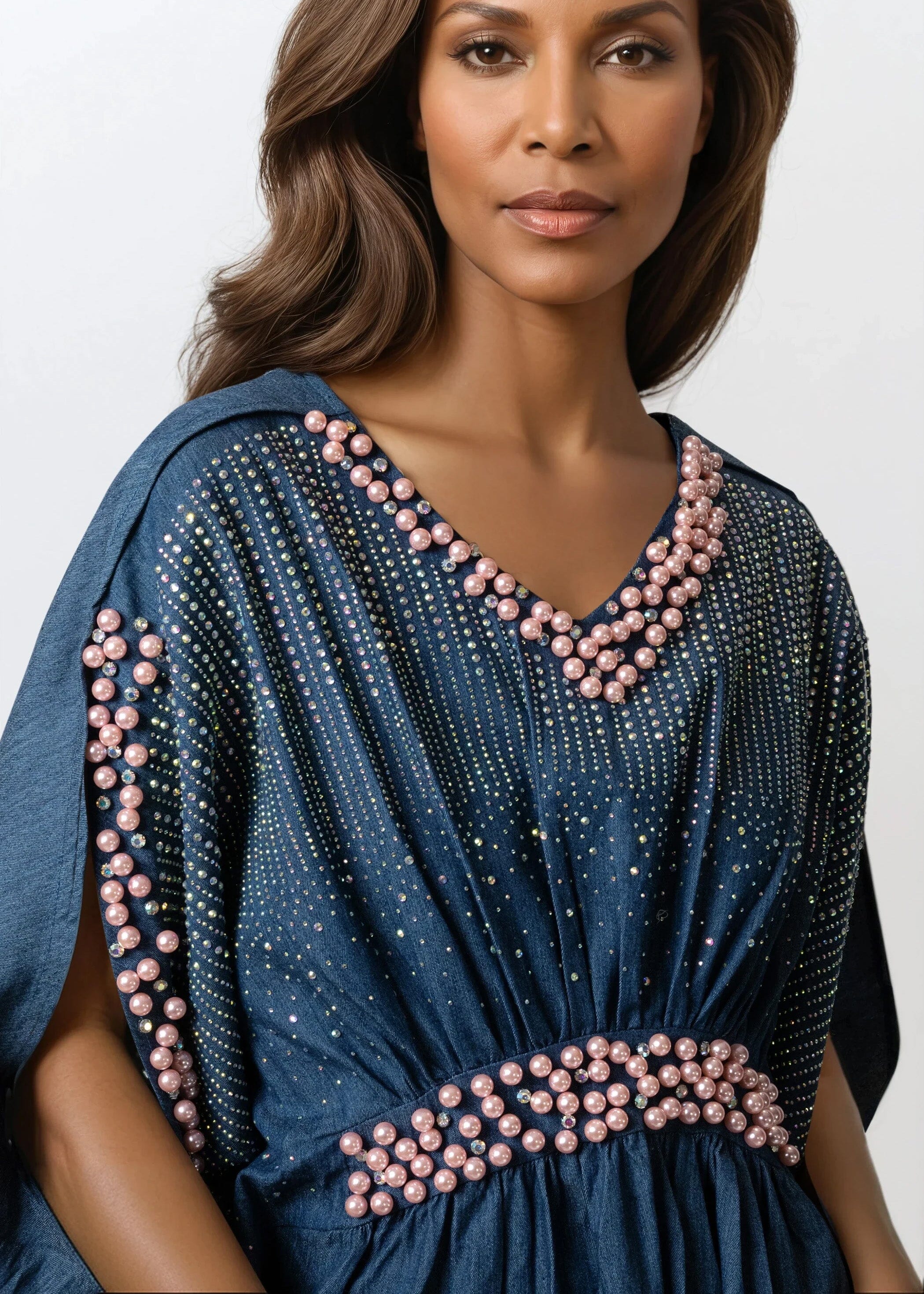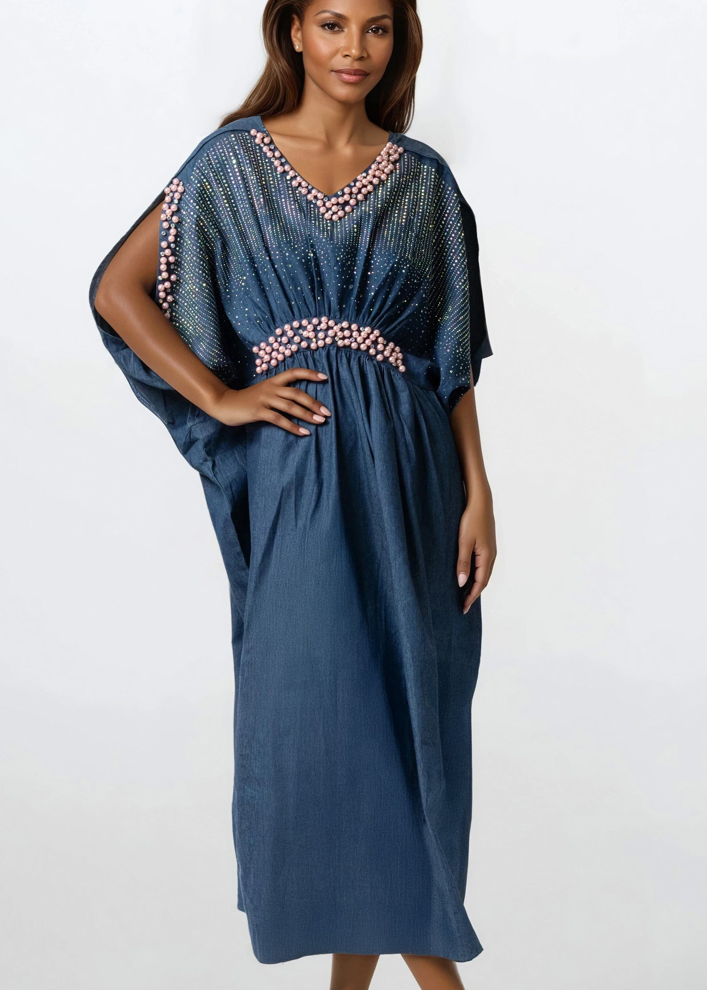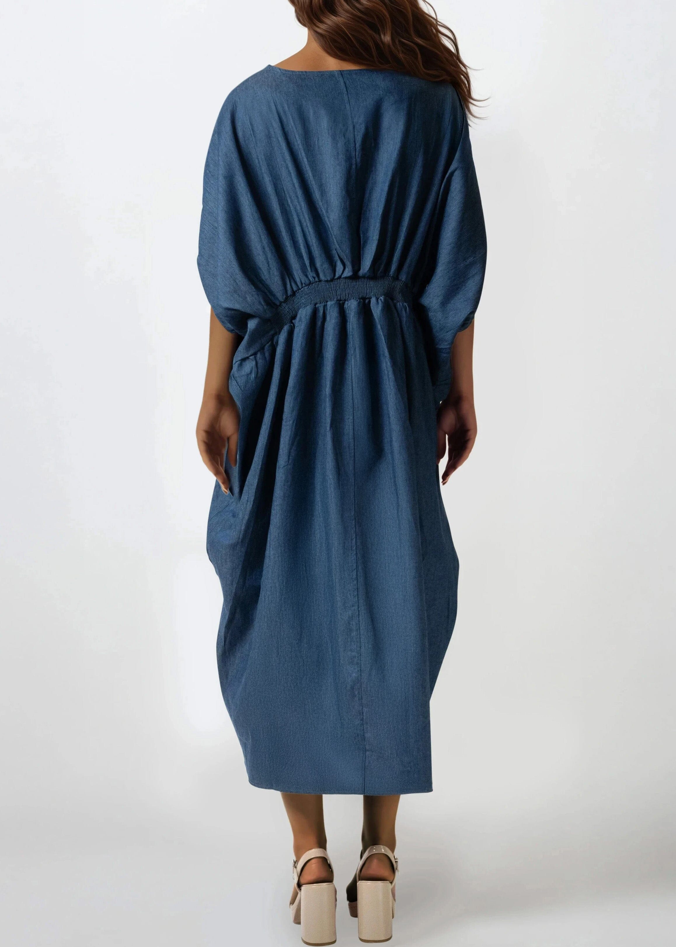 - Statement denim kaftan cut with a loose, flowing silhouette for effortless drama