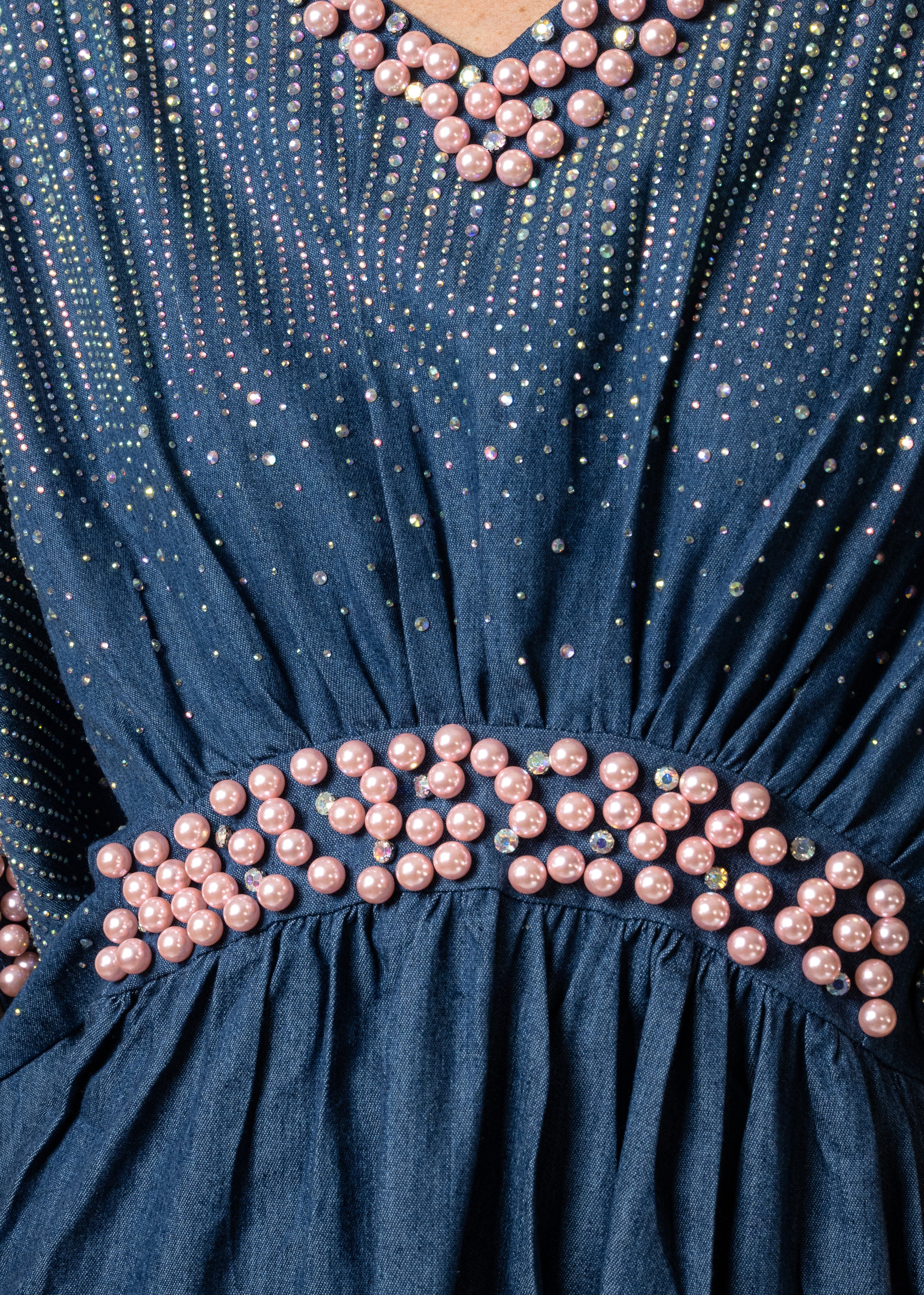 - Deep V-neckline framed by heavy embellishment that draws the eye