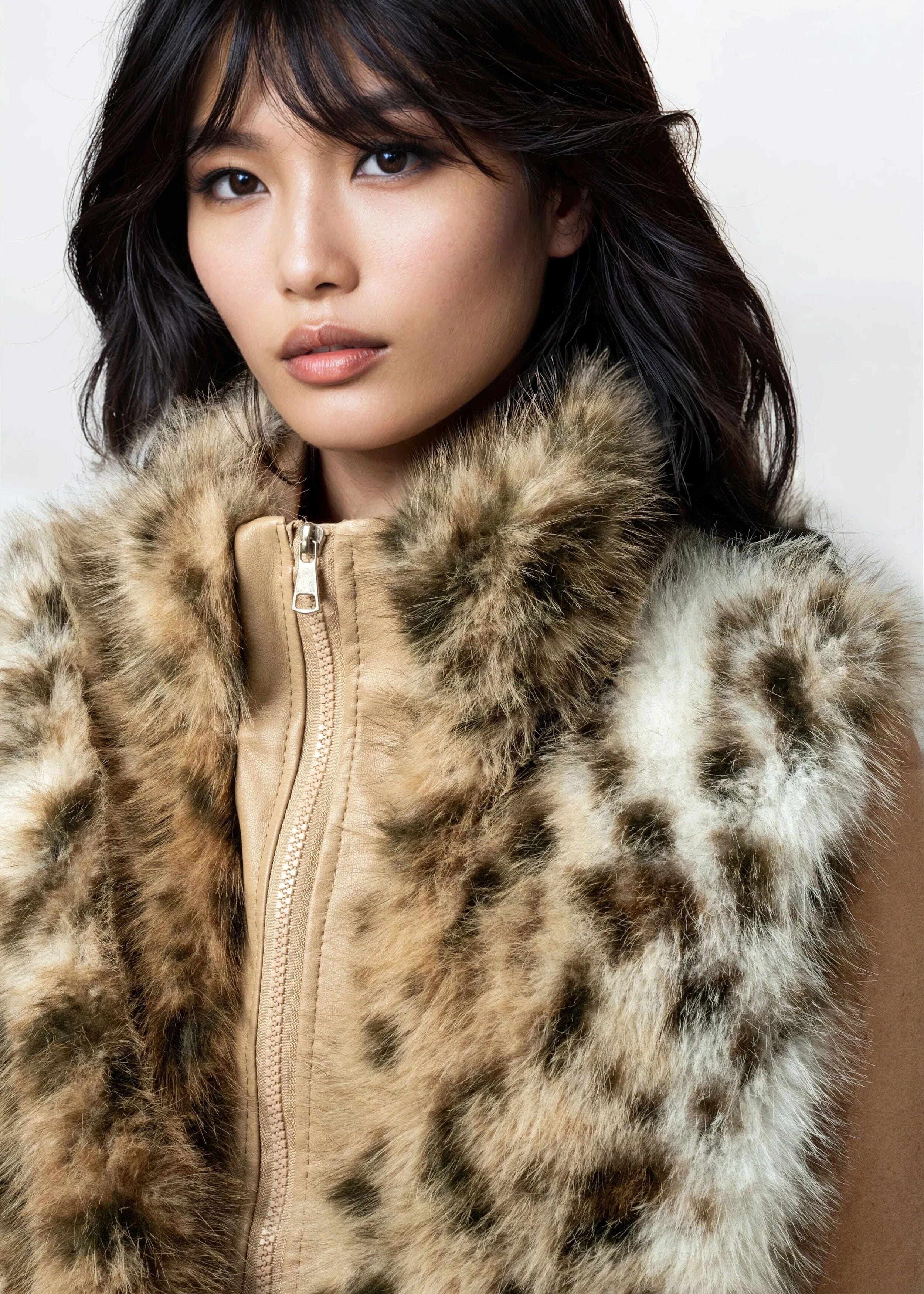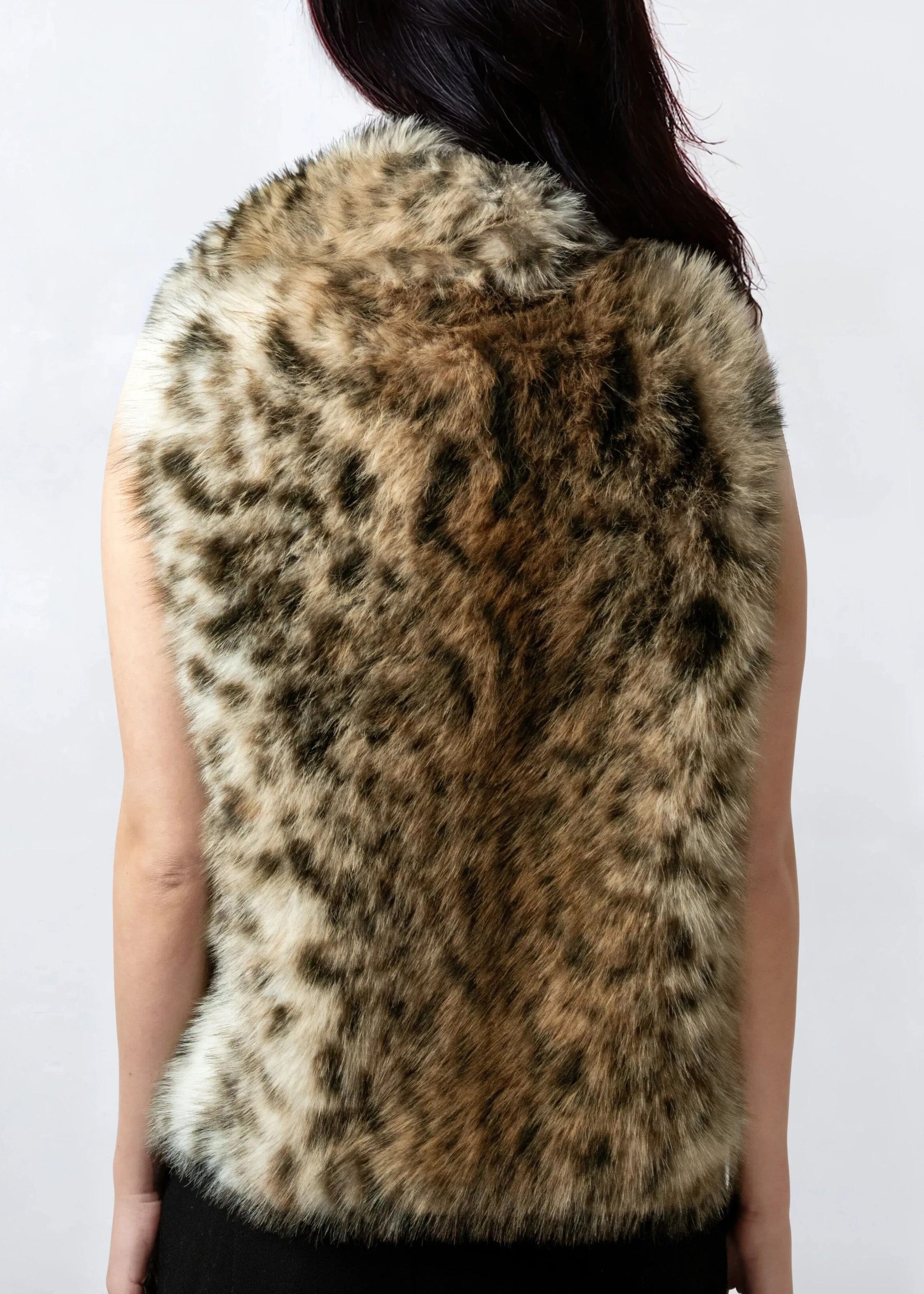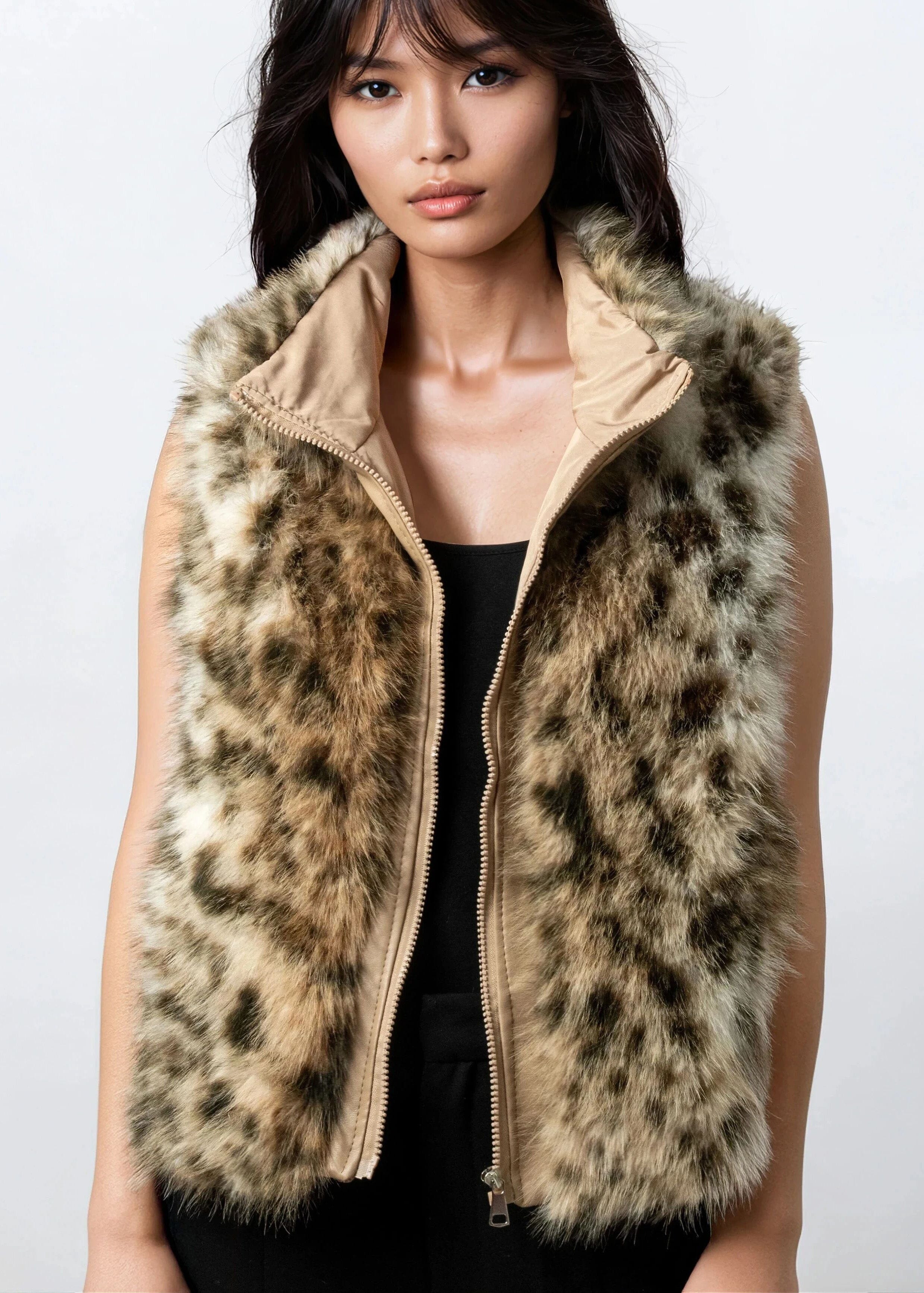 - Luxe faux-fur vest designed with a bold, wild-spotted finish