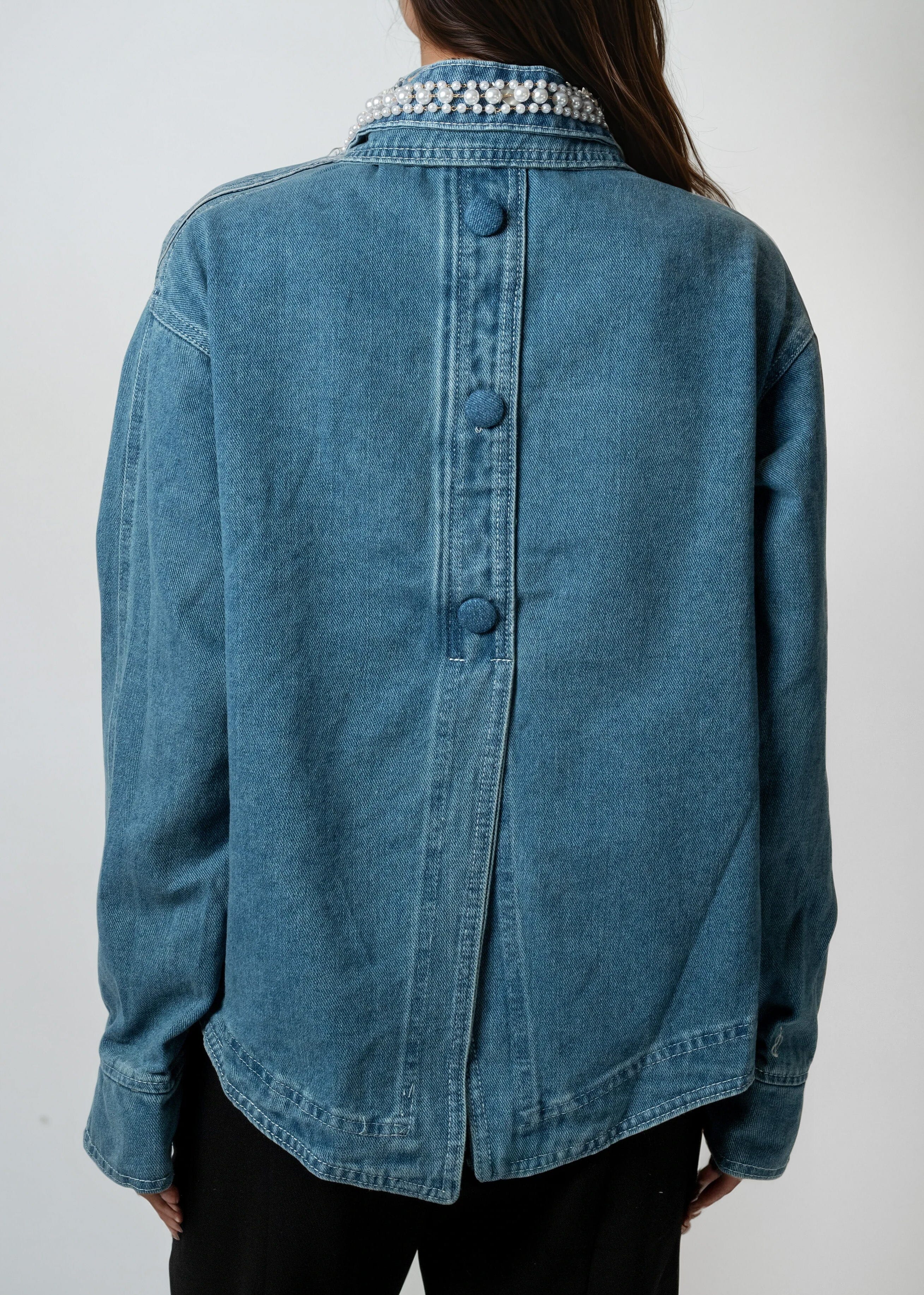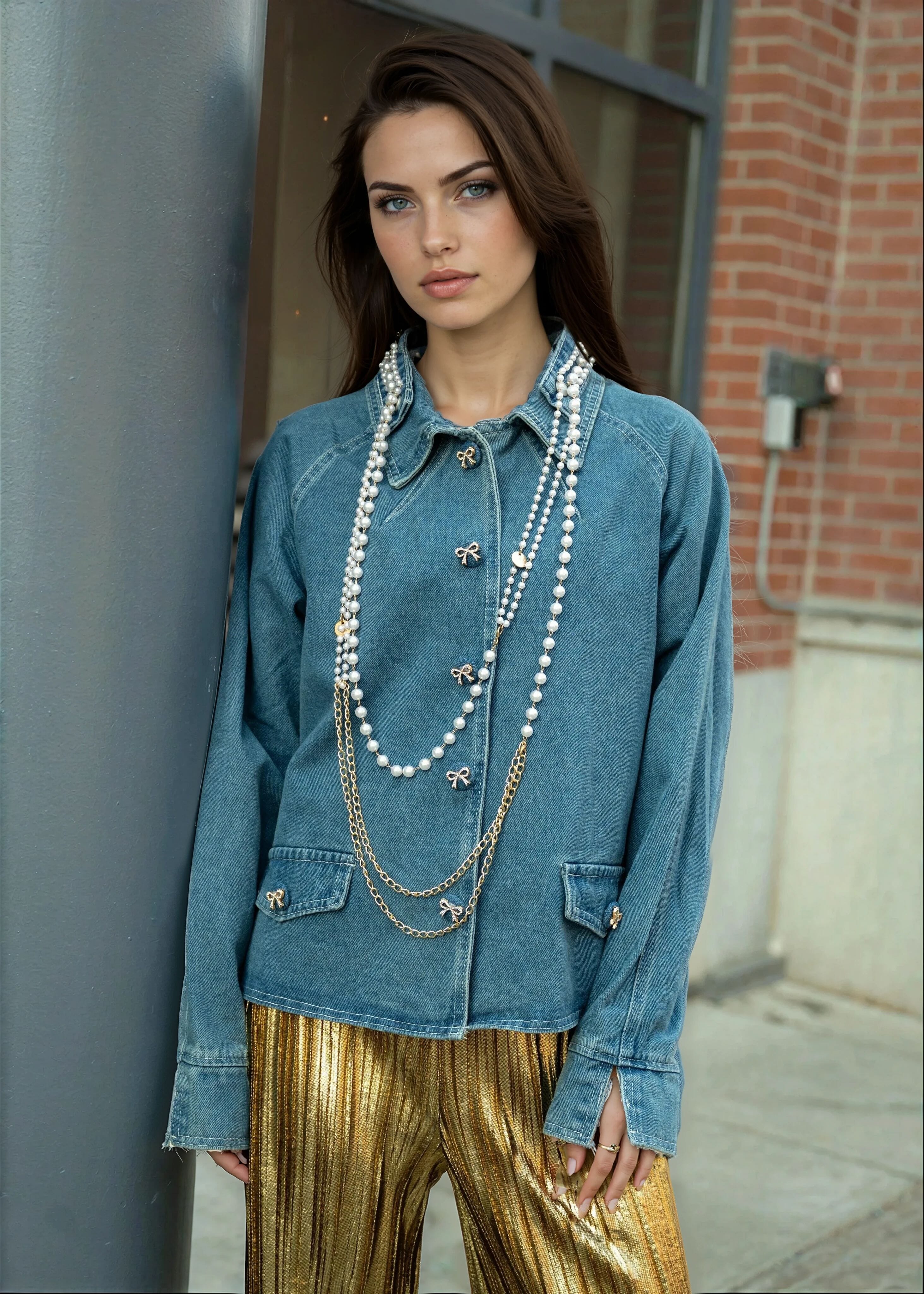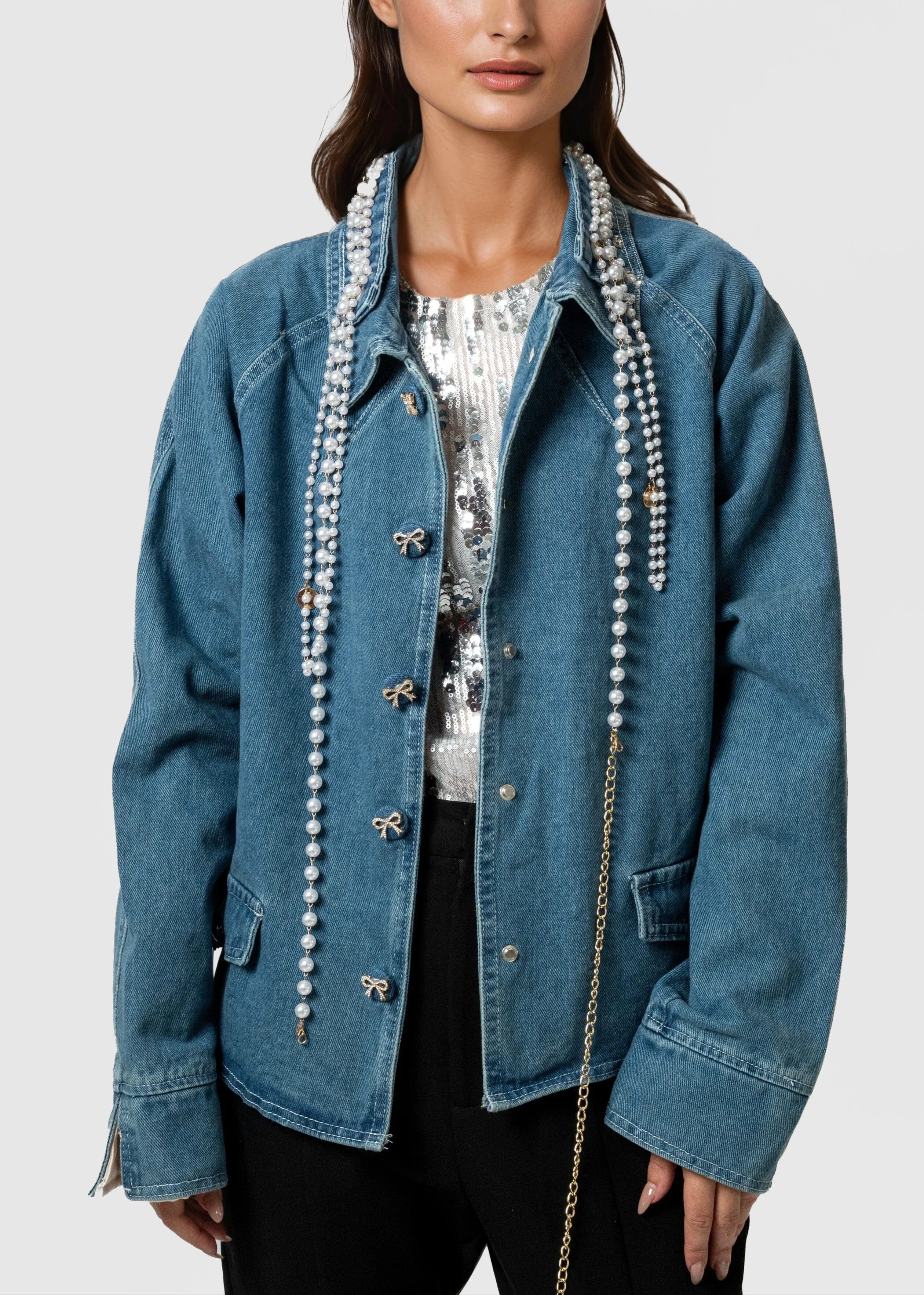 - Detachable snap-on pearl collar, switch between bold layering or a clean denim look