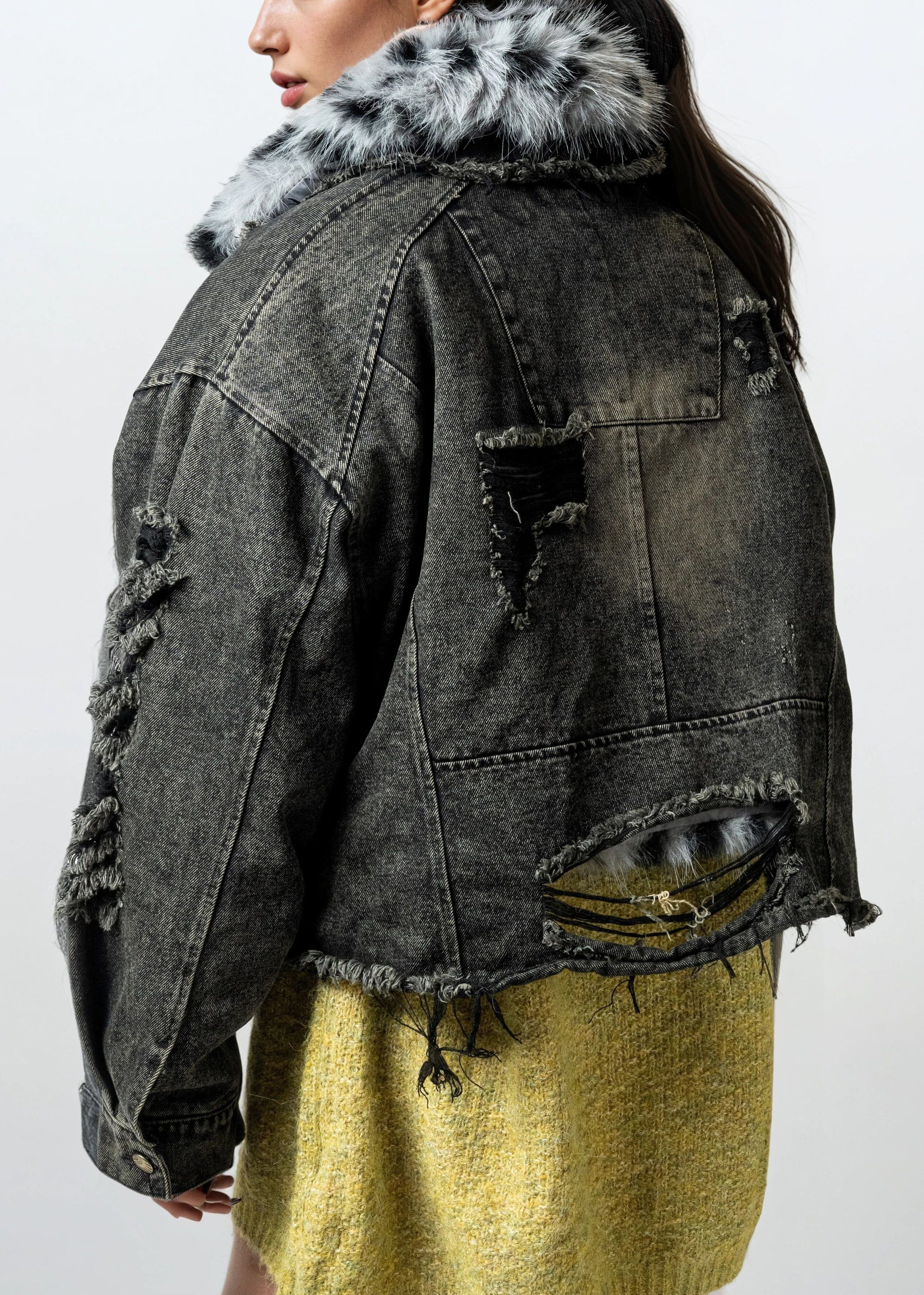 - Heavywashed grunge denim with dramatic shredding, tears + raw frayed hems