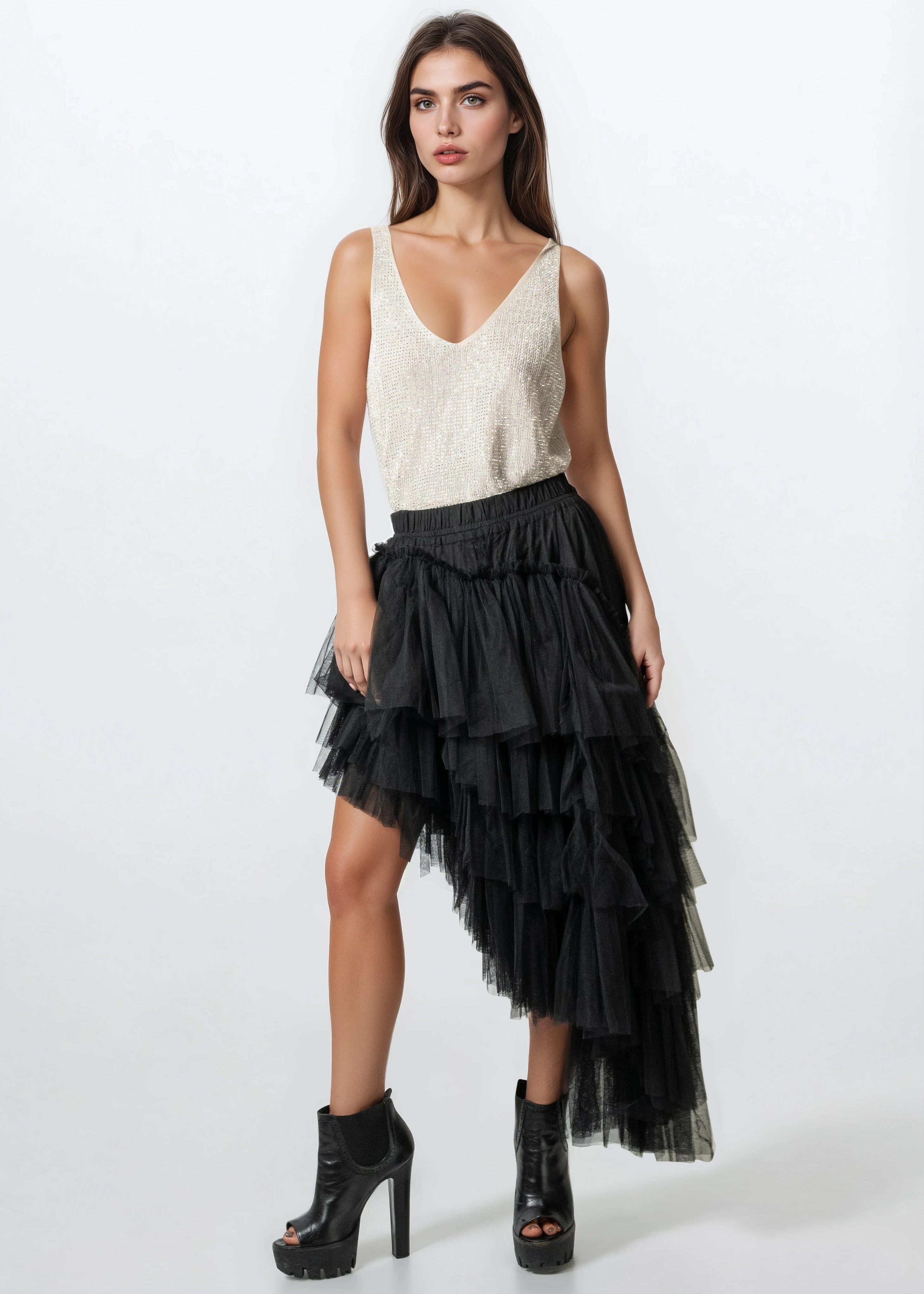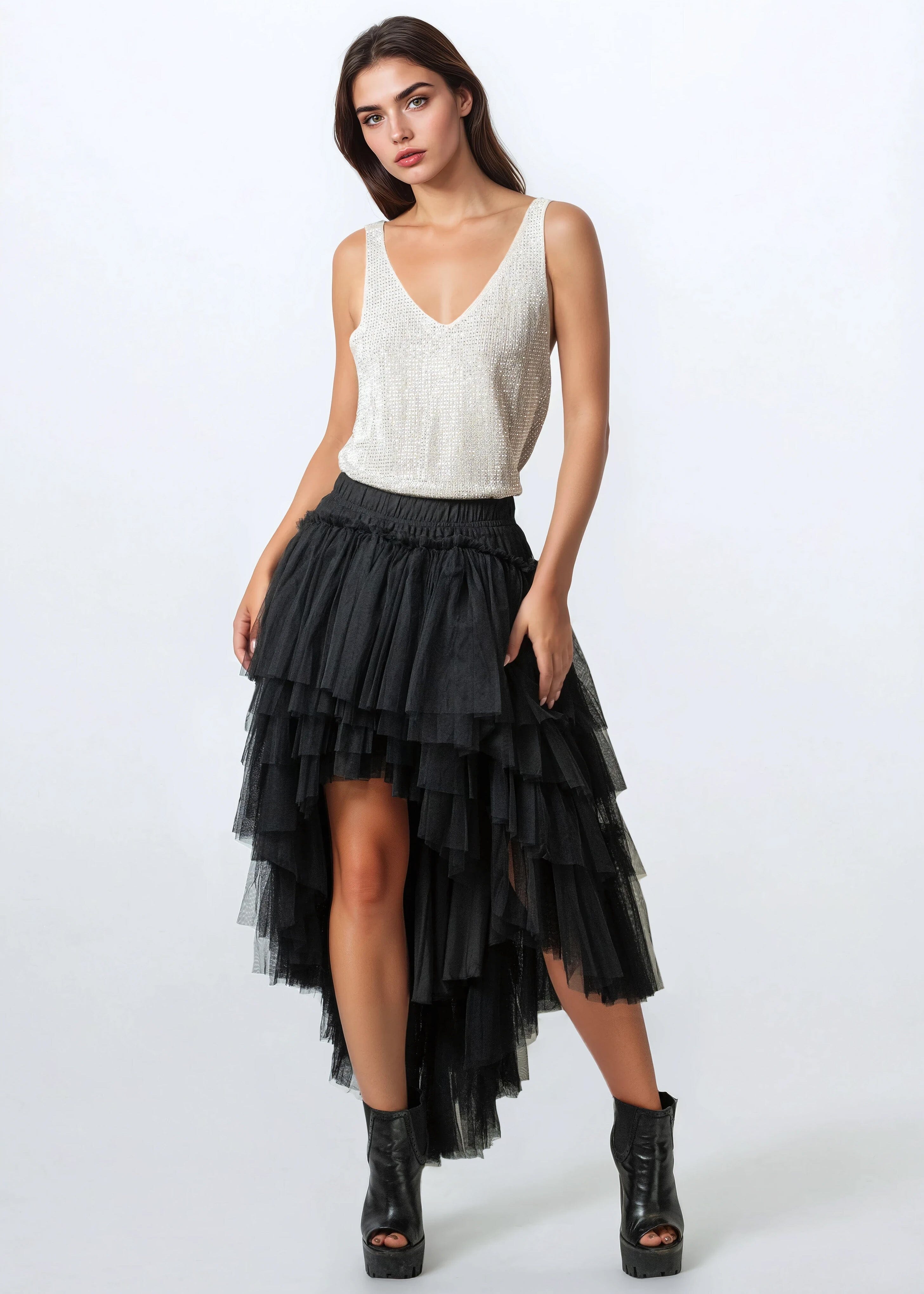 - Layered asymmetrical tulle with a dramatic waterfall hem