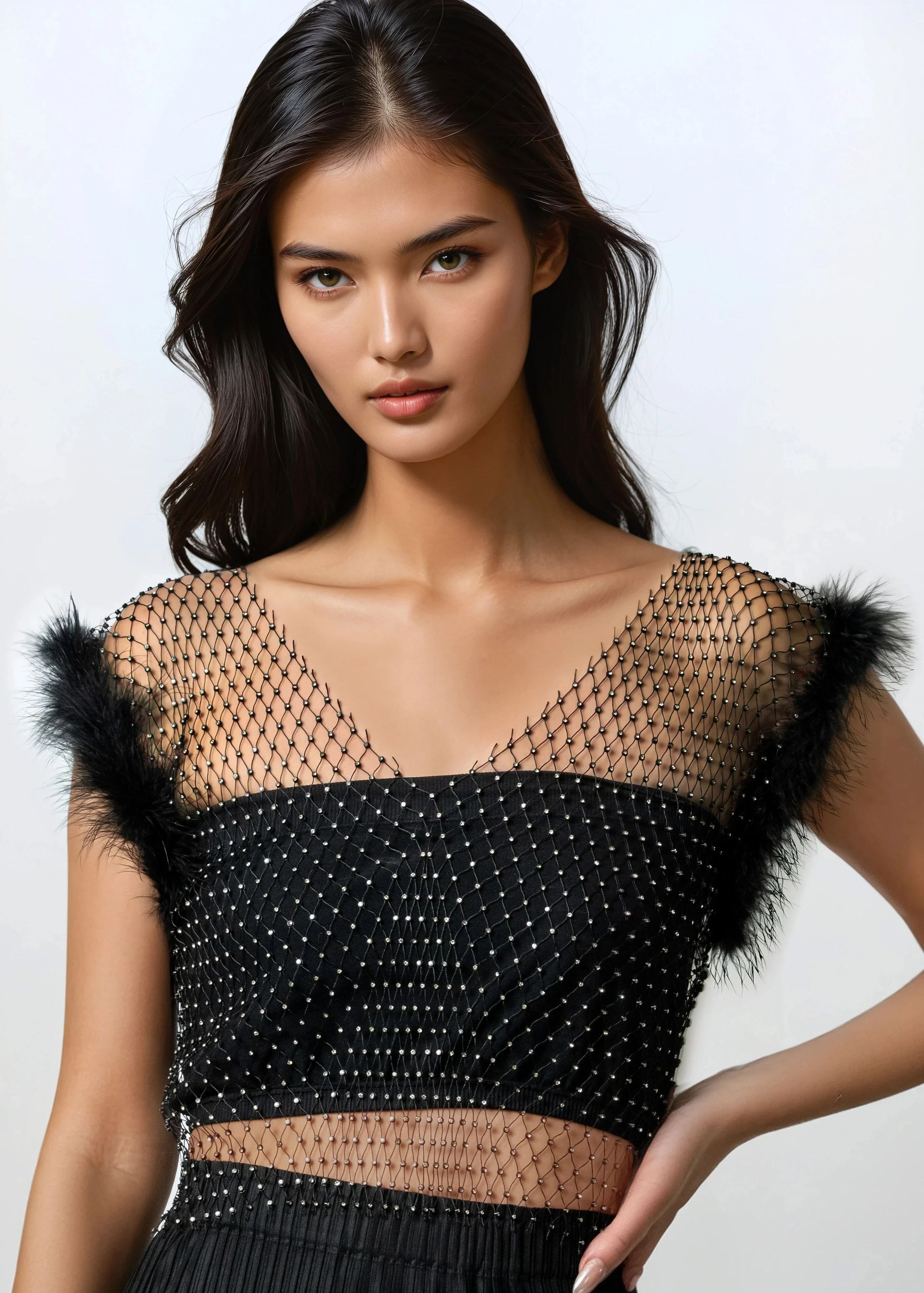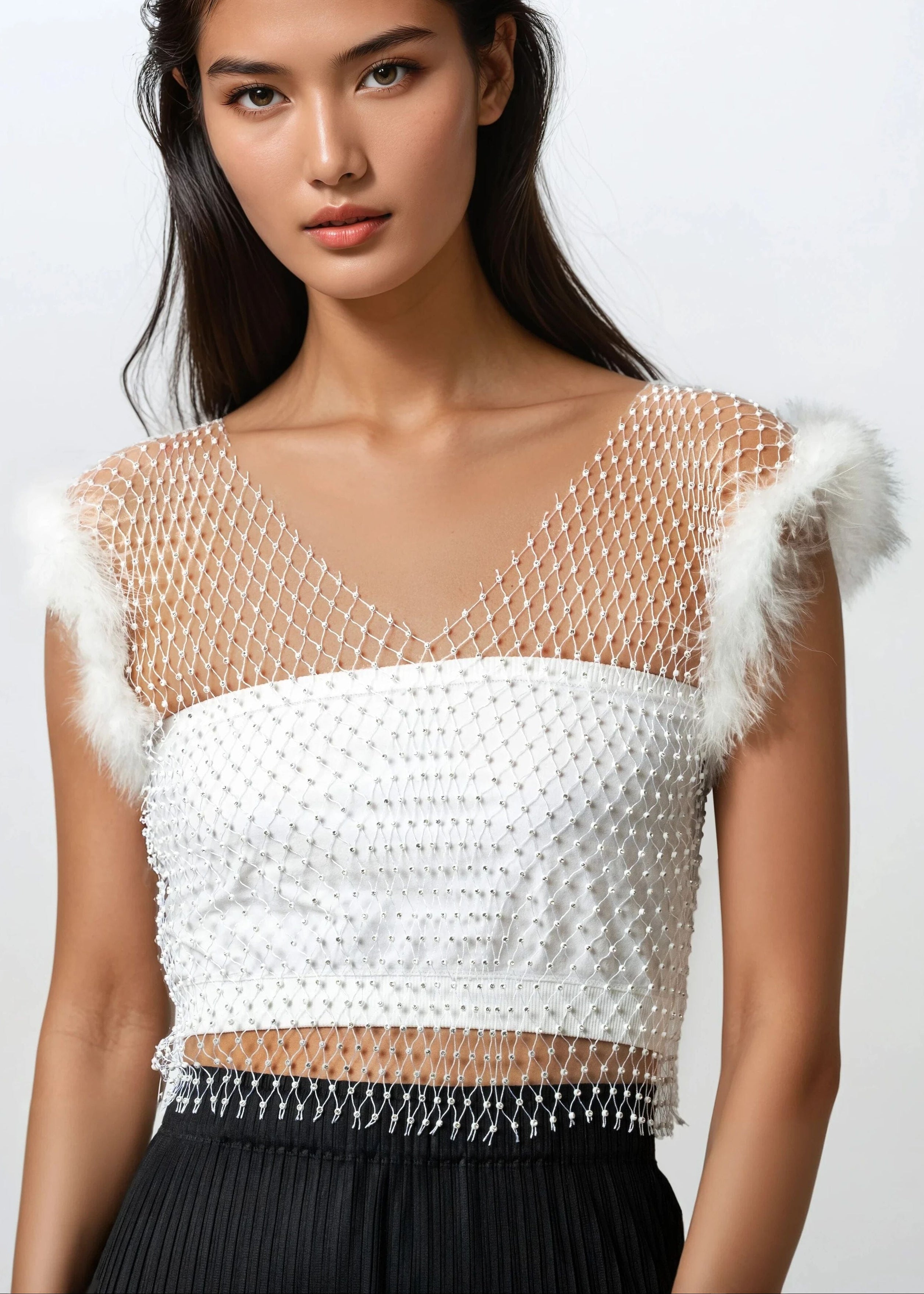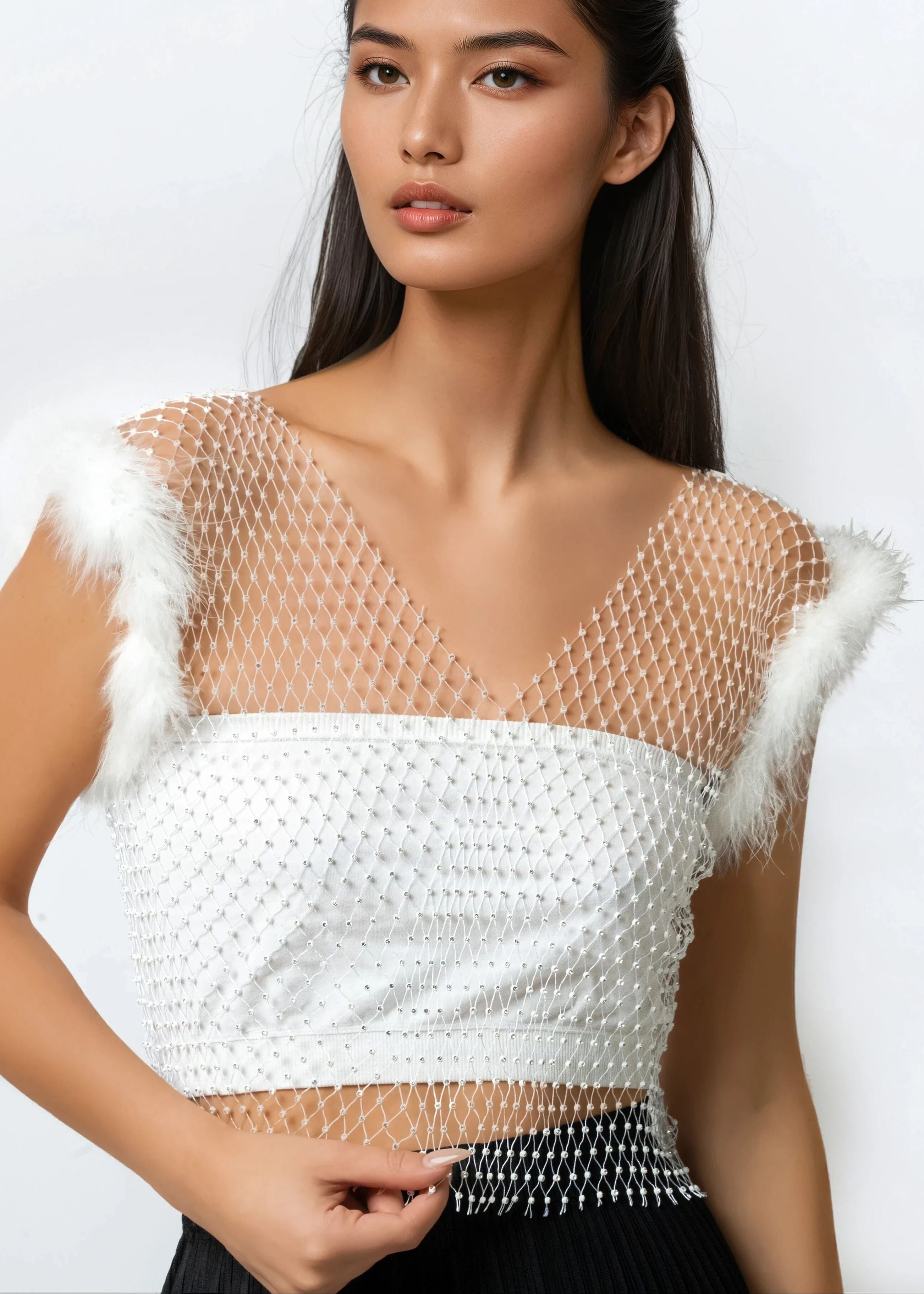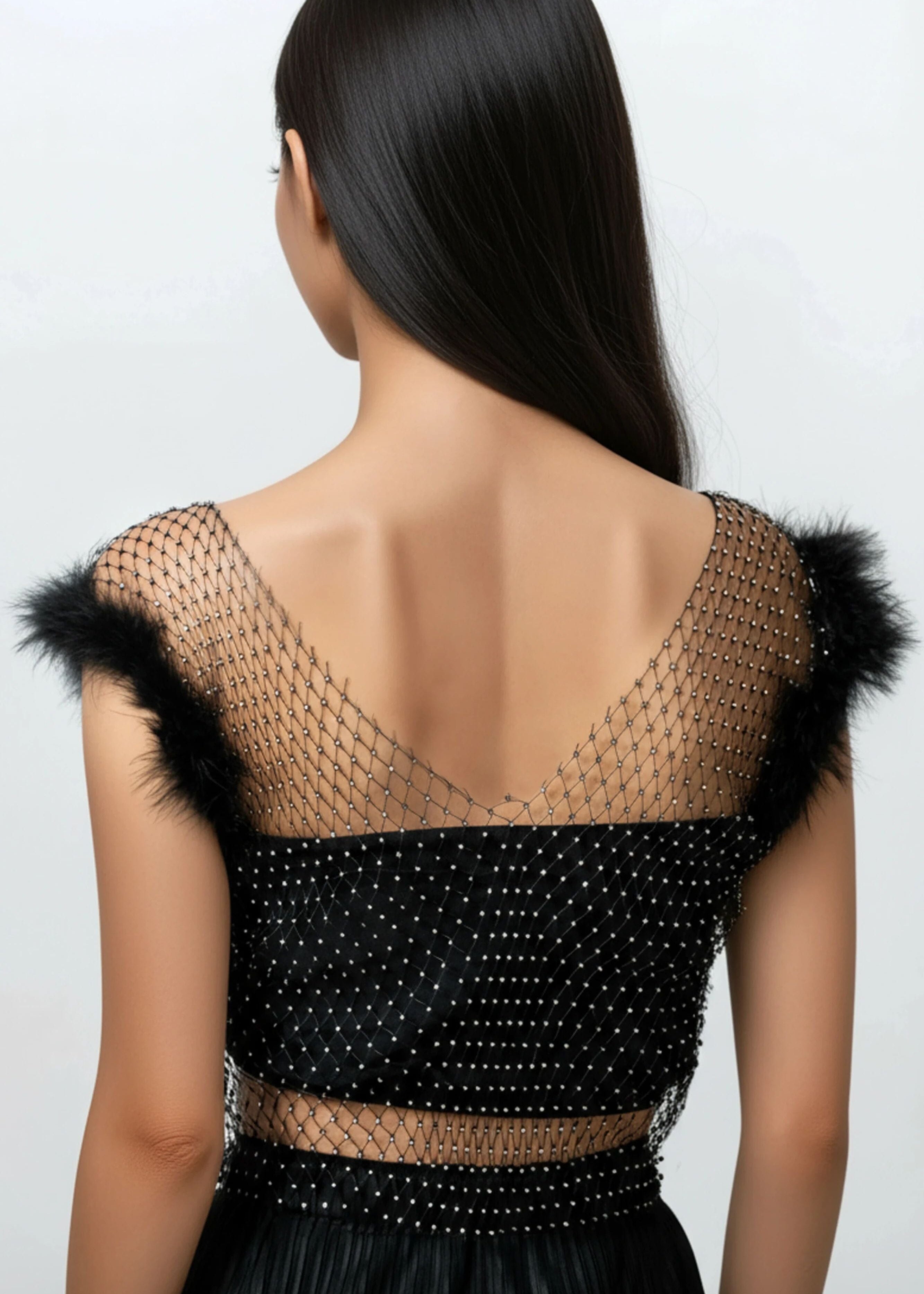 Rhinestone Mesh Feather Trim Top