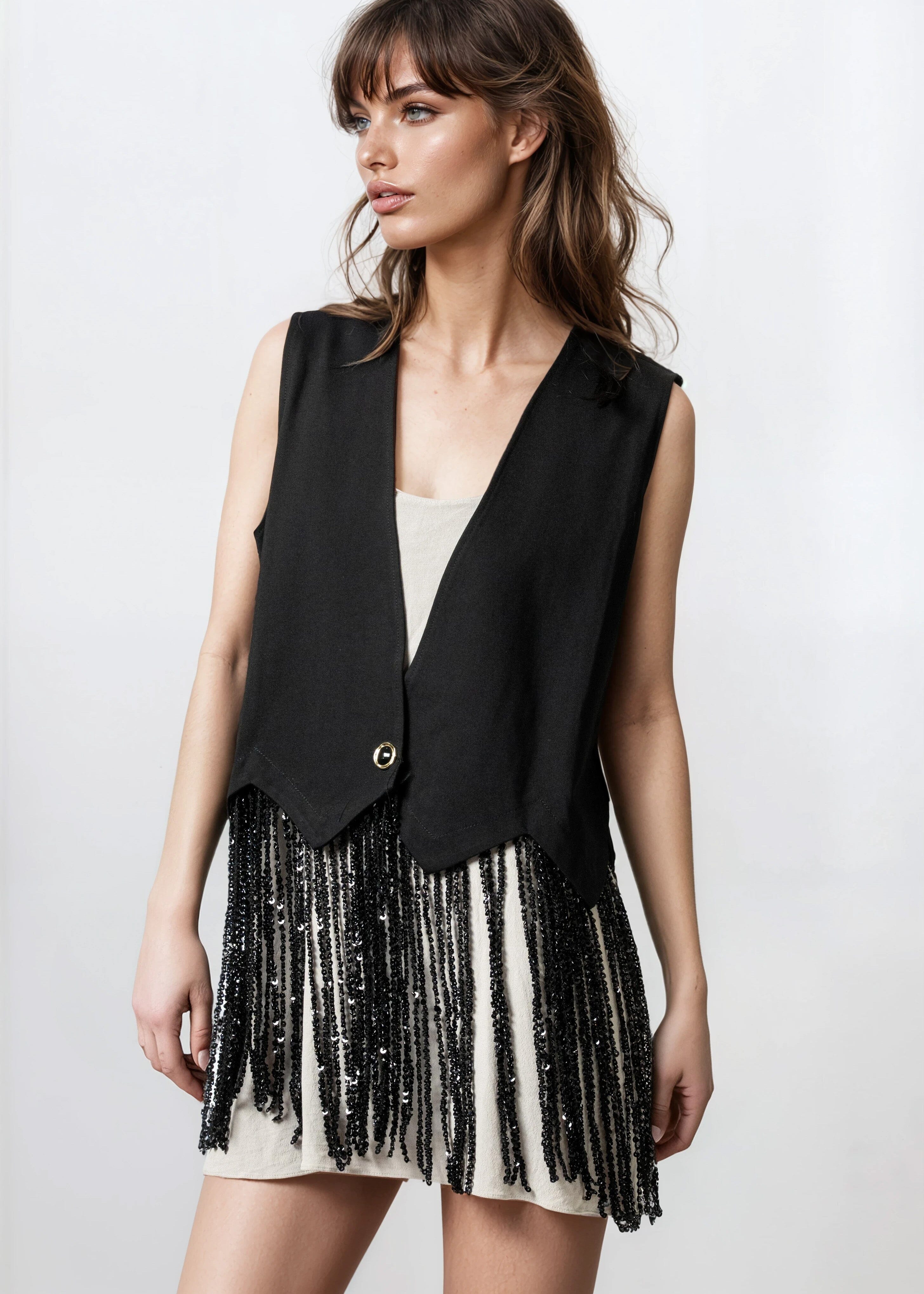 - Sleek sleeveless vest with a dramatic plunging neckline