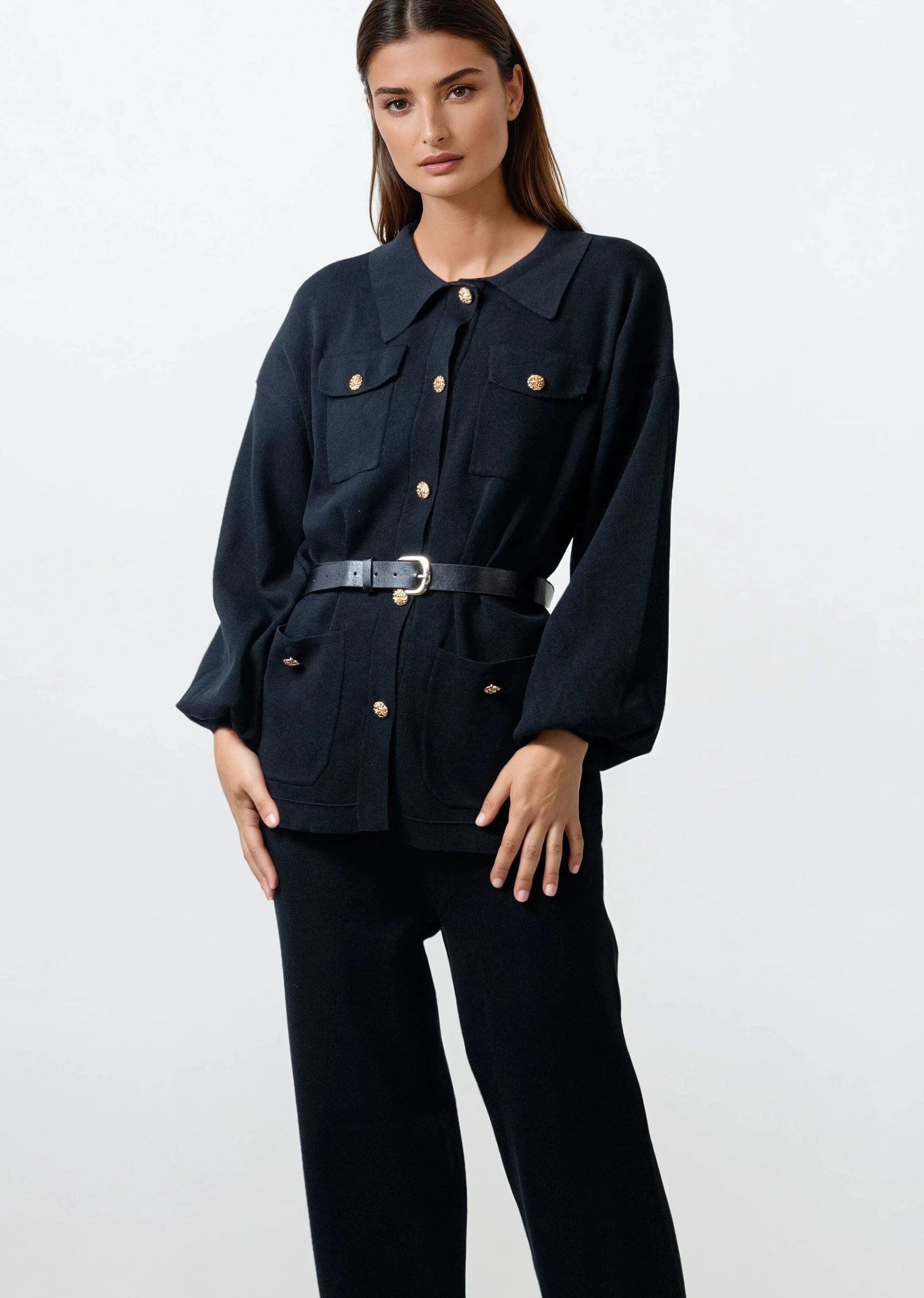 - Soft knit pant set with a sharp, utility-inspired attitude