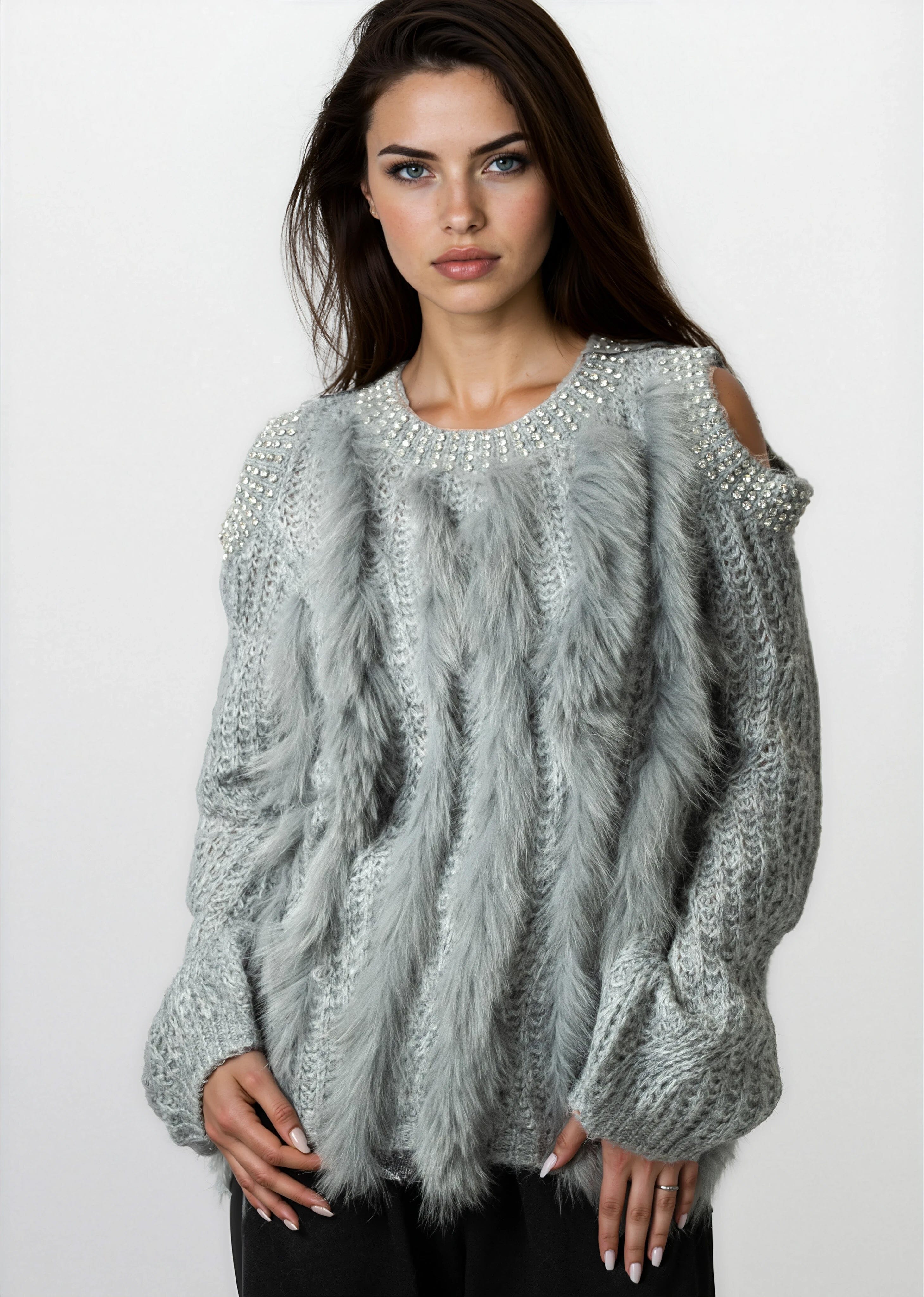 Bedazzled Cold Shoulder Faux Fur Sweater