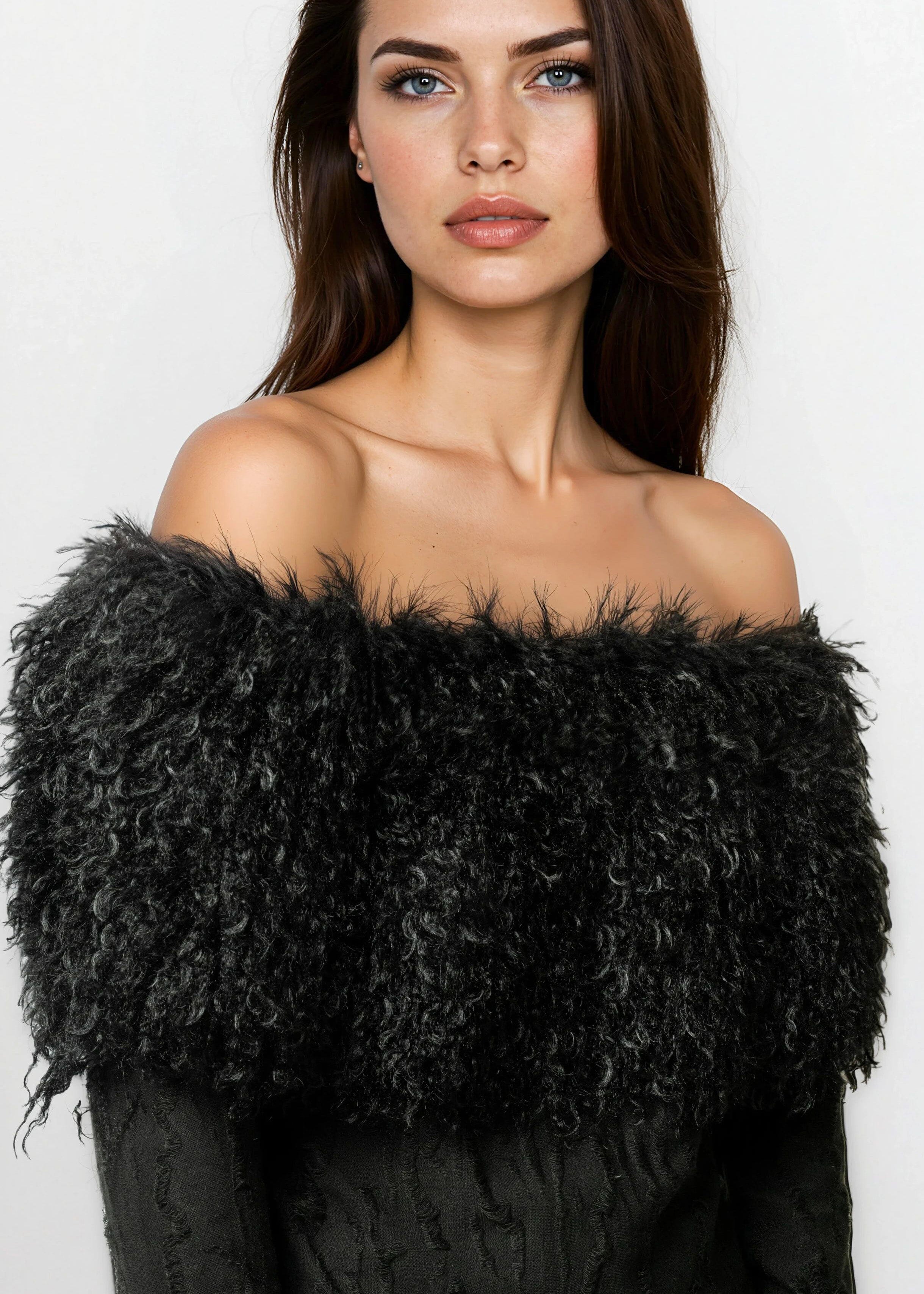 - Off-the-shoulder blouse finished with dramatic faux-fur trim
