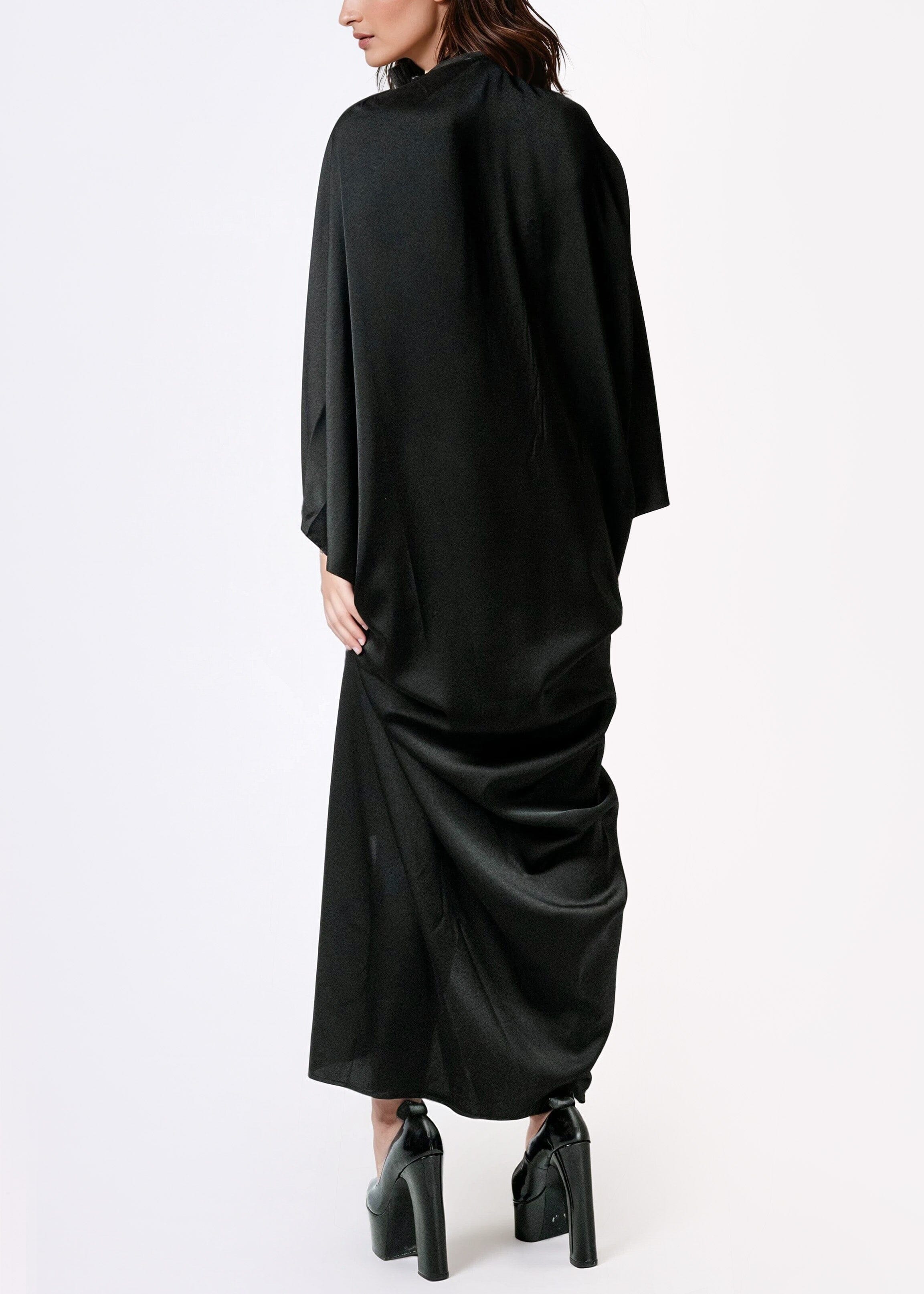 - Silhouette: Oversized relaxed kaftan with batwing sleeves, midi length, and an asymmetrical hem for movement and drama.