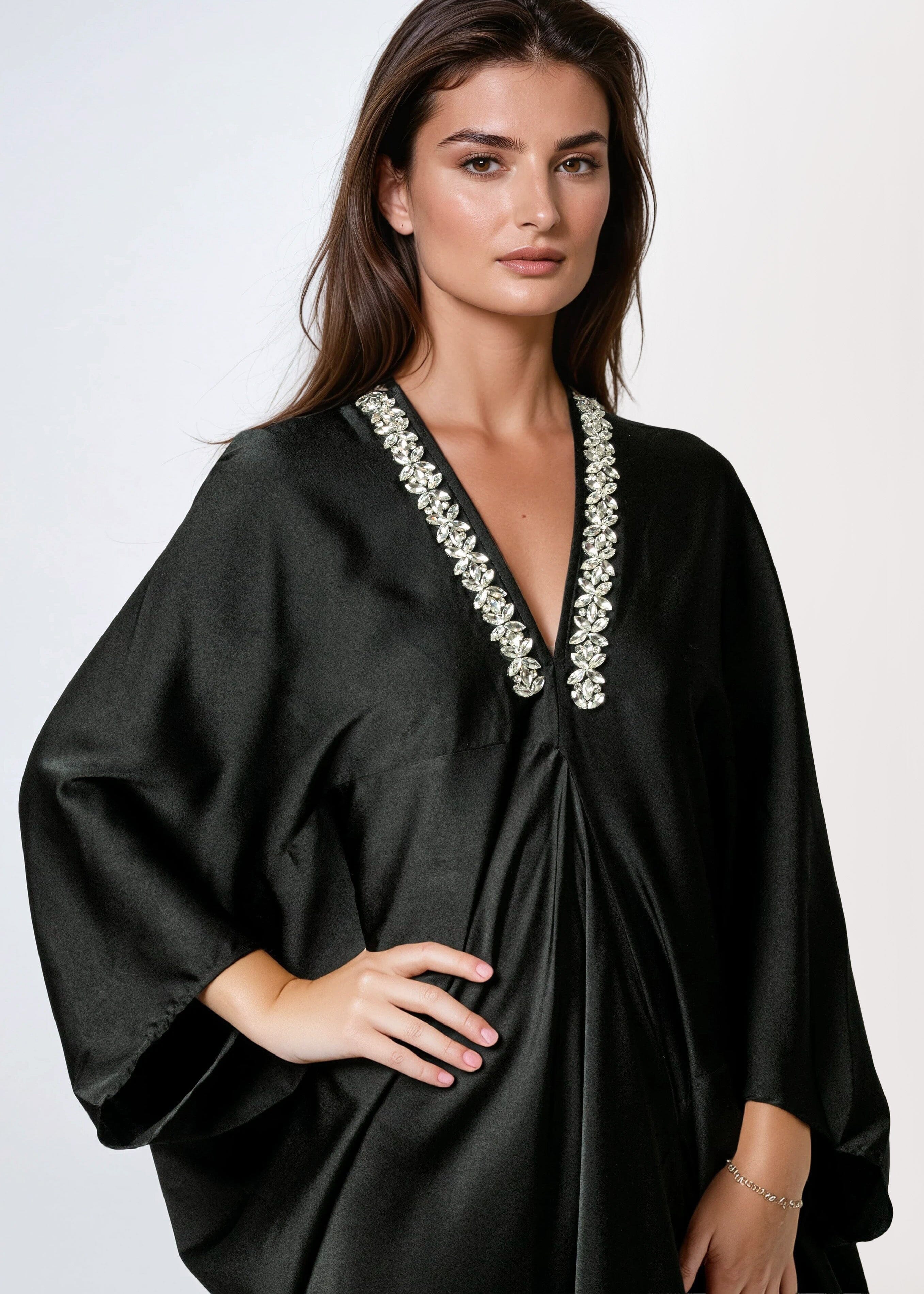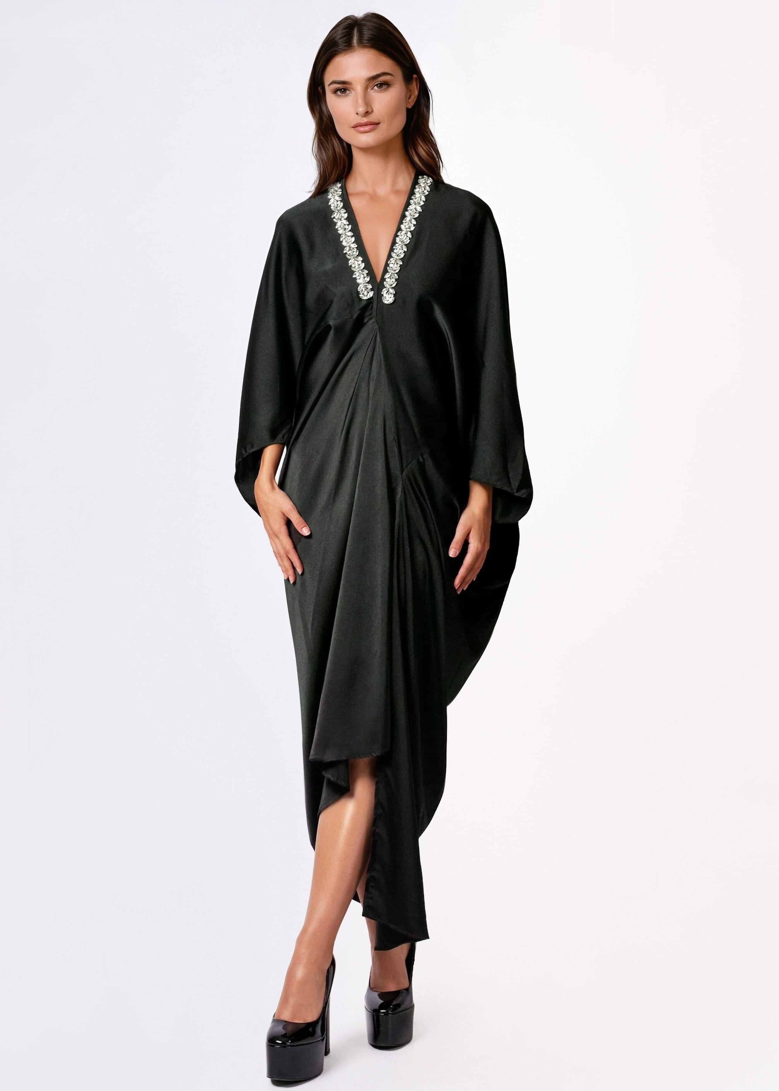 A deep V-neck embellished midi dress that commands the room before you say a word. The Embellished V Neck Kaftan Dress is cut from fluid, satin-finish polyester with batwing sleeves, a dramatic asymmetrical waterfall hem, and a crystal rhinestone neckline that makes "dressed up" feel effortless. Throw it on, let it drape, and walk like you planned the whole thing.