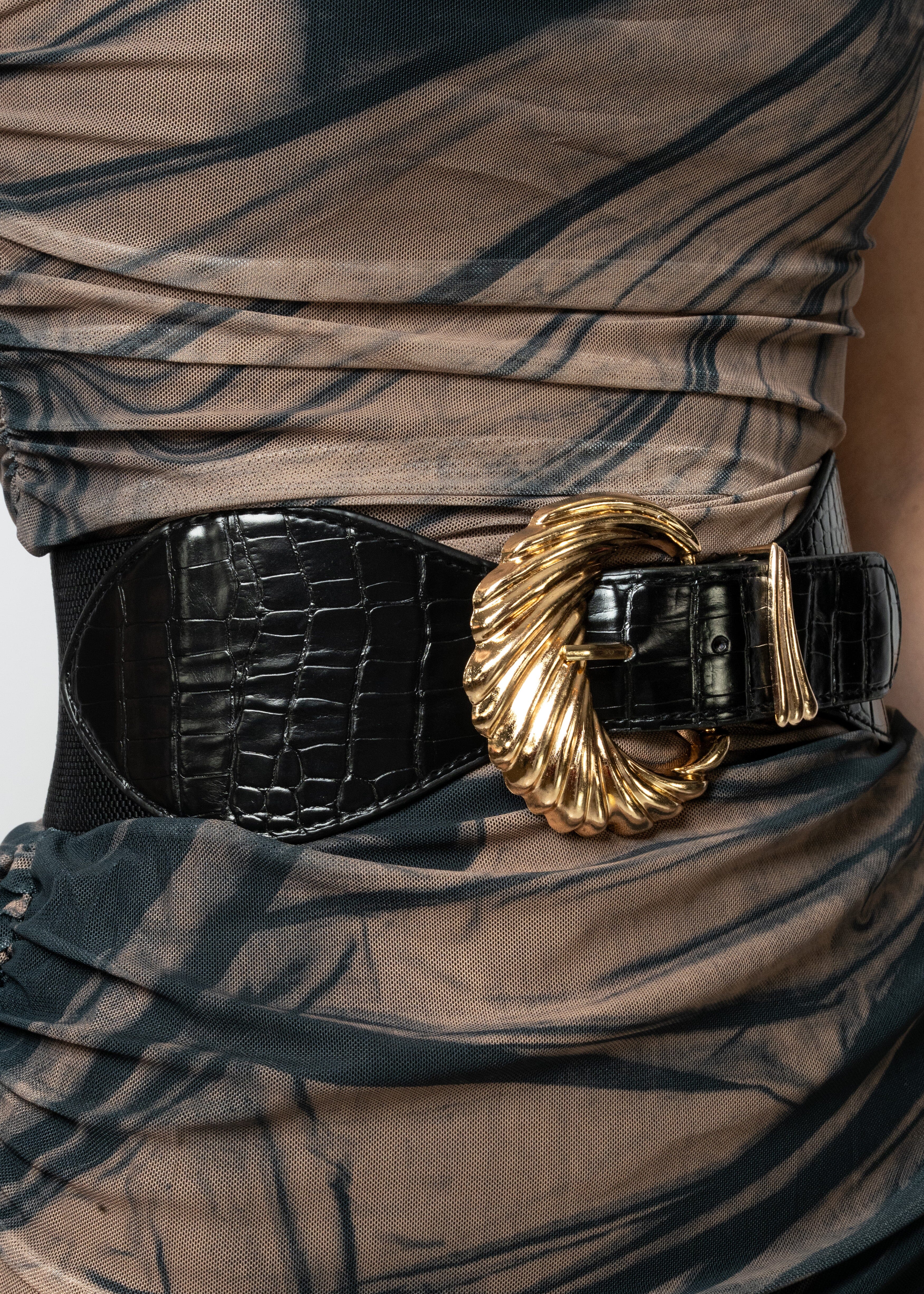 - Wide statement belt designed to cinch, sculpt, and command attention