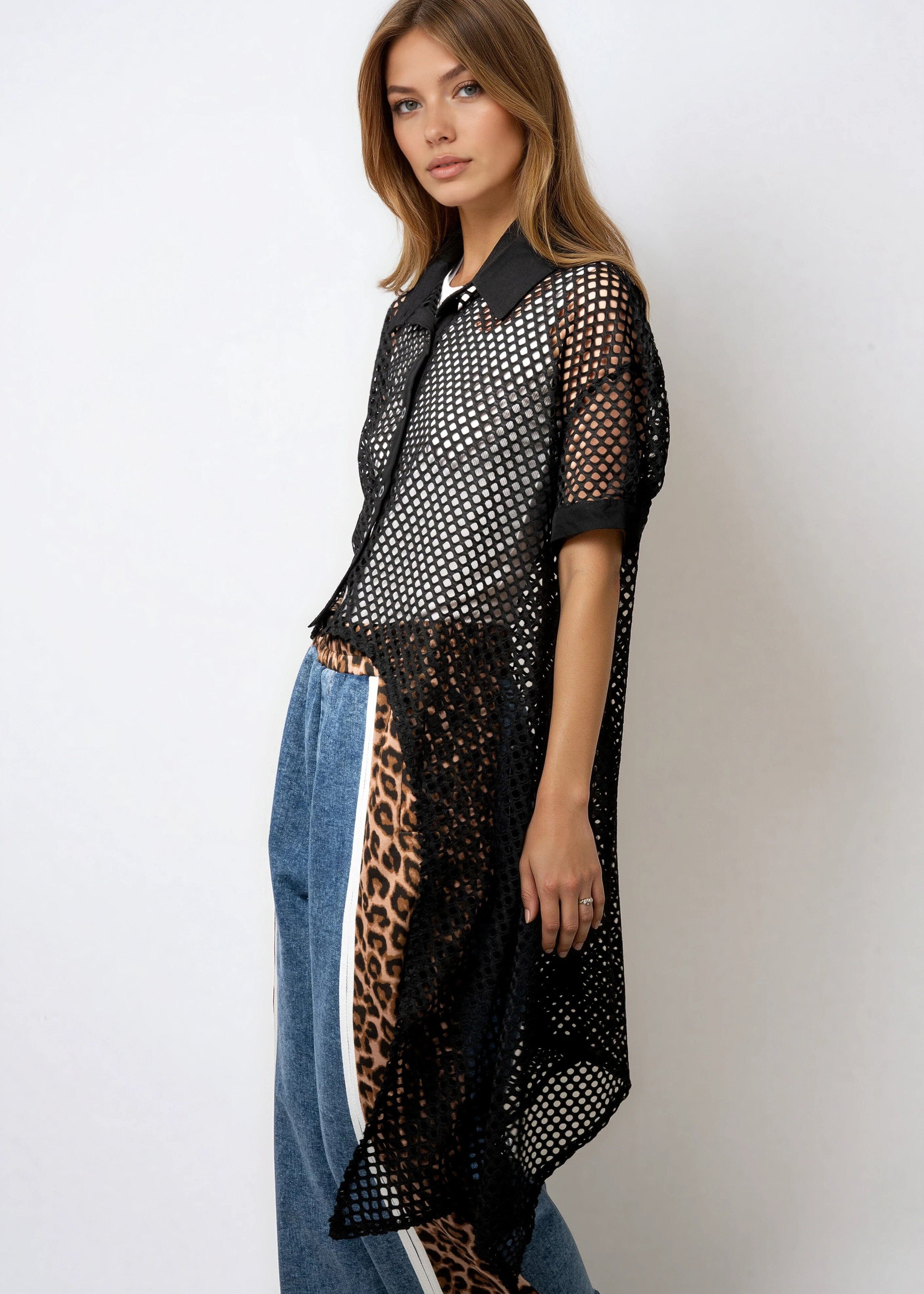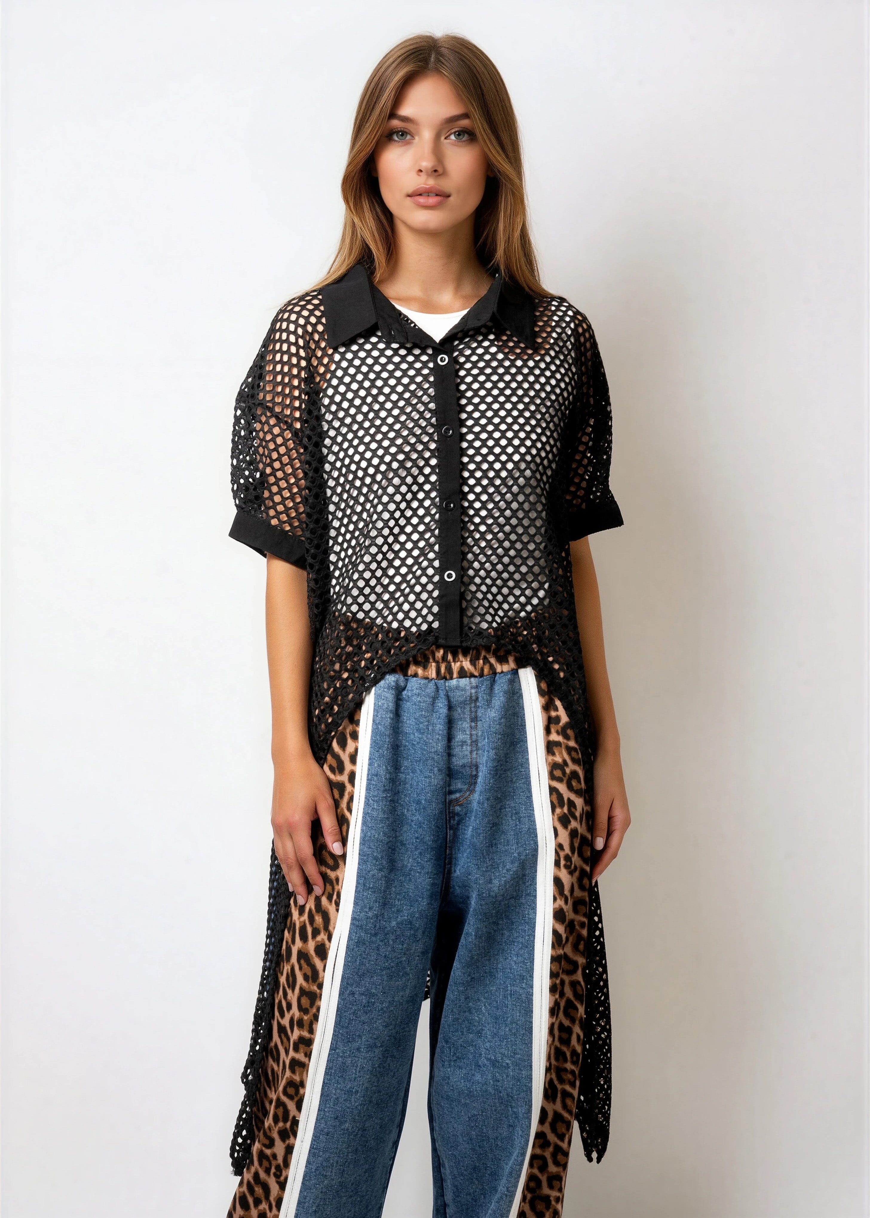 - Collared fishnet layering piece with a bold, open-mesh texture