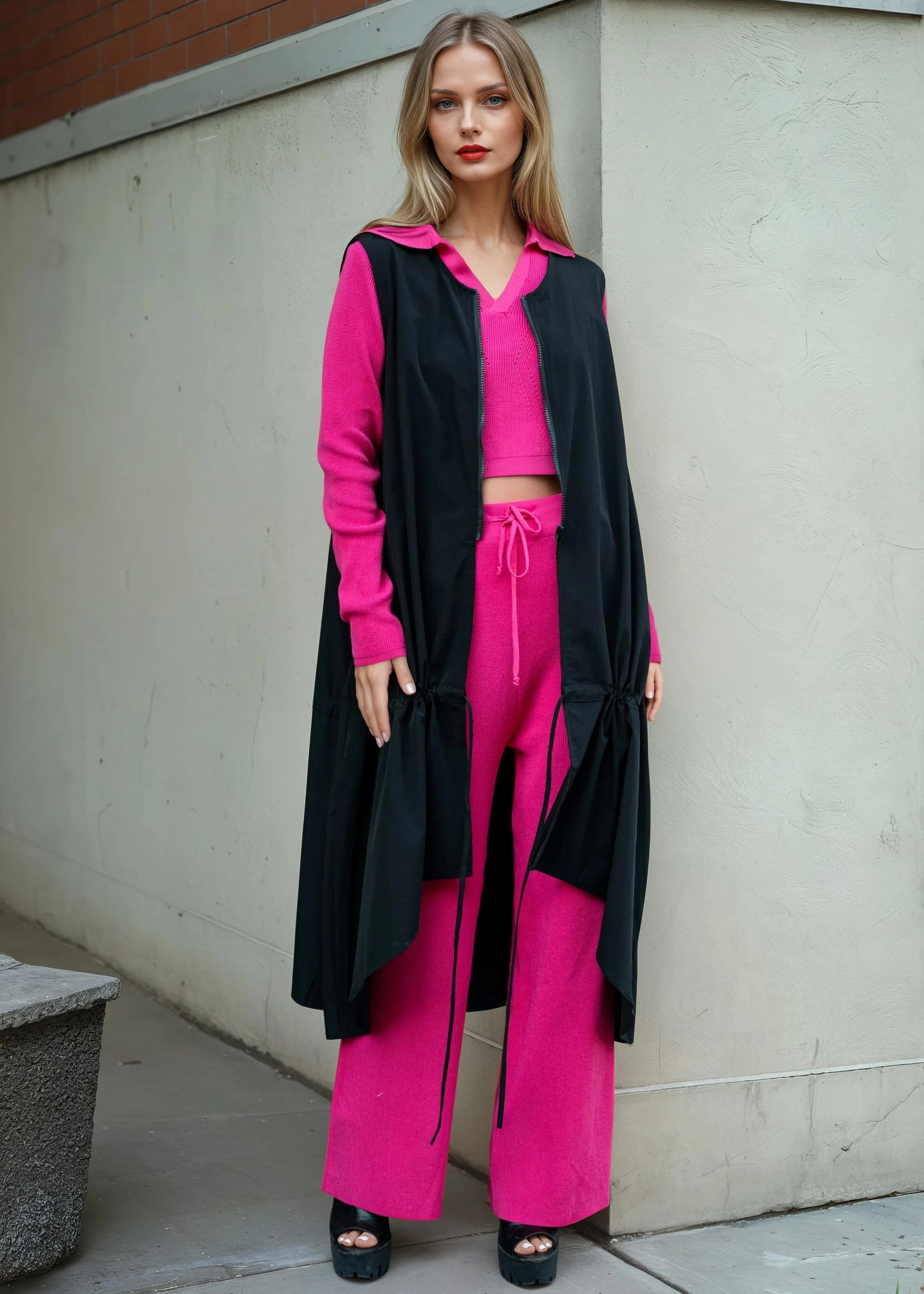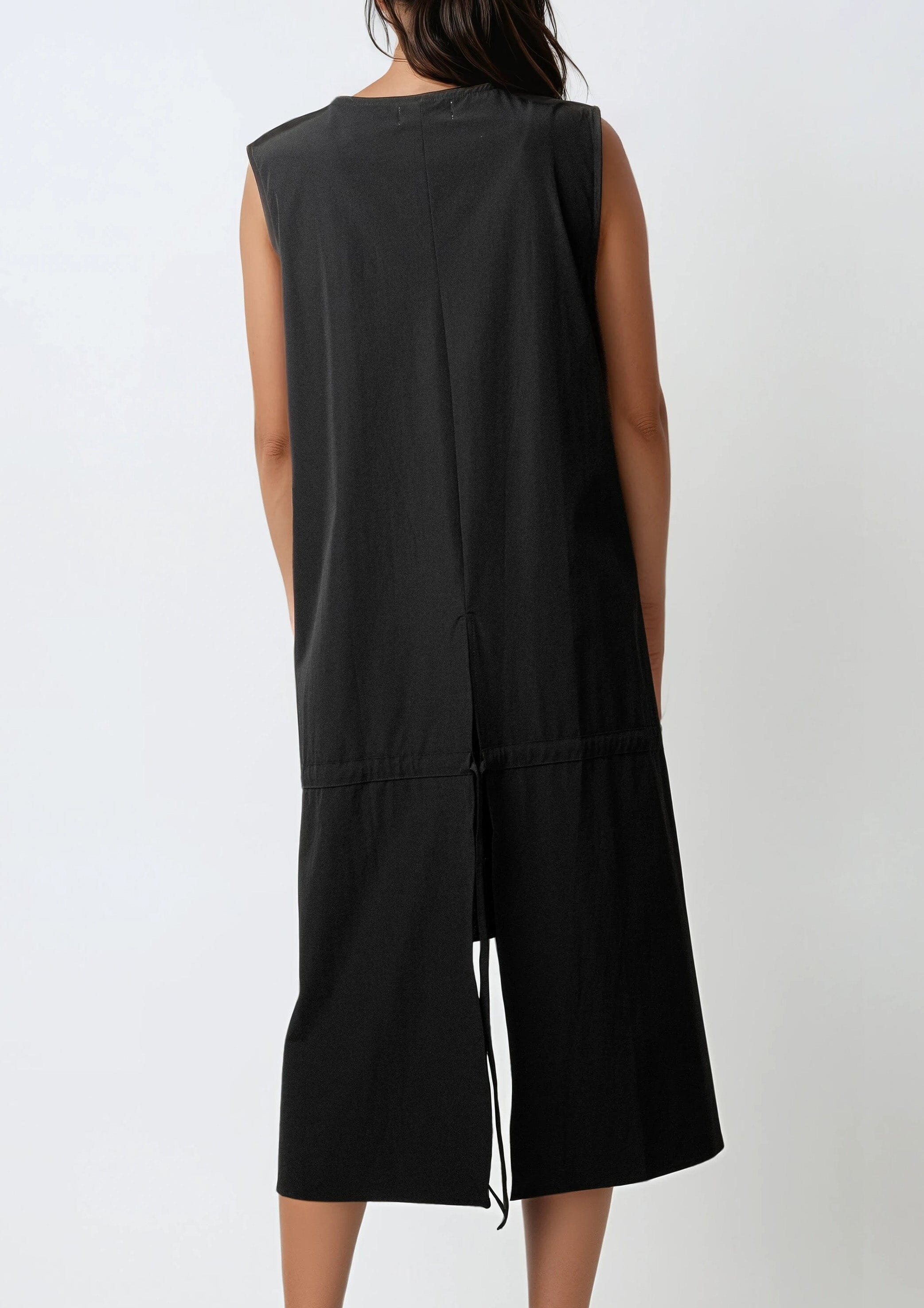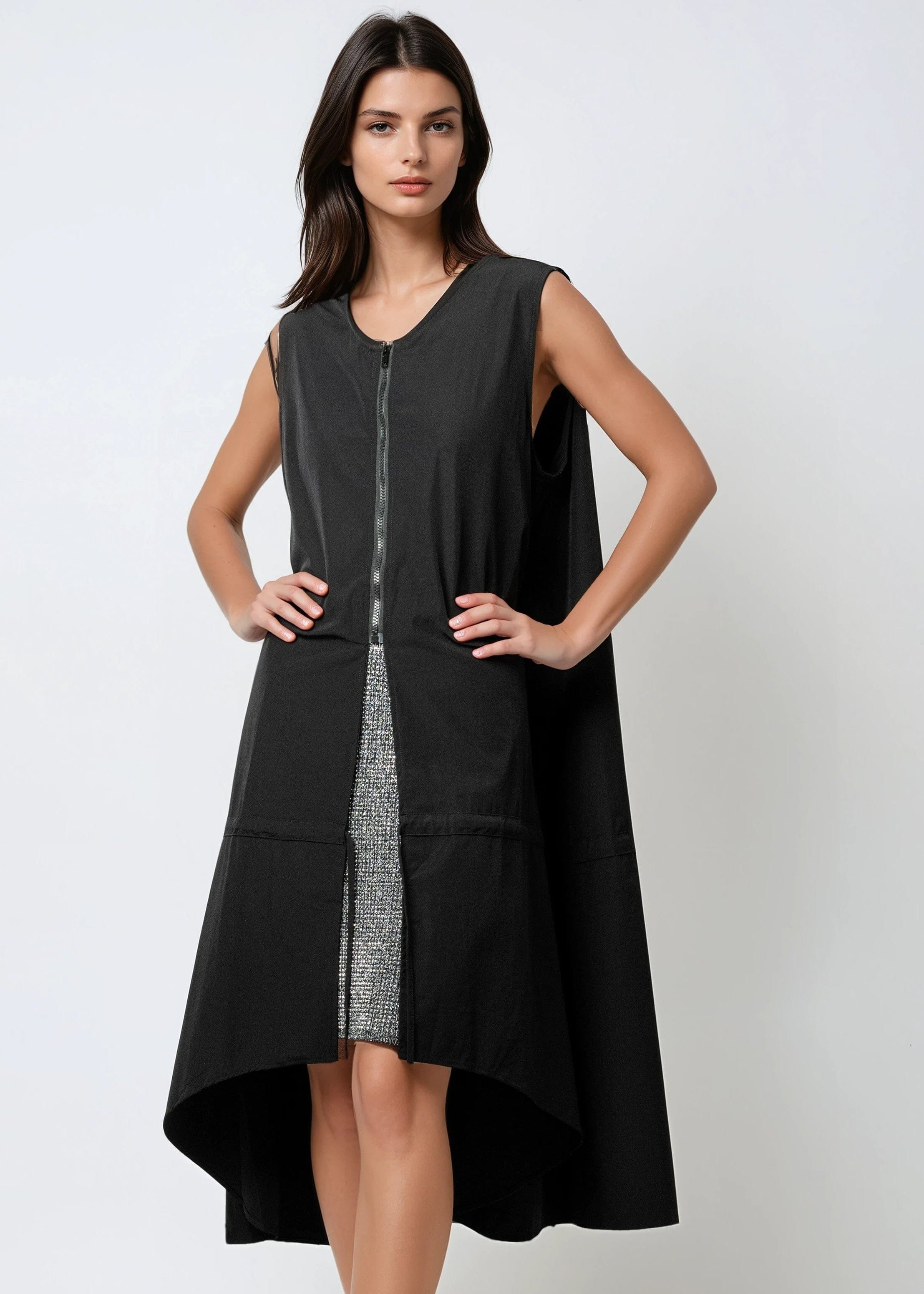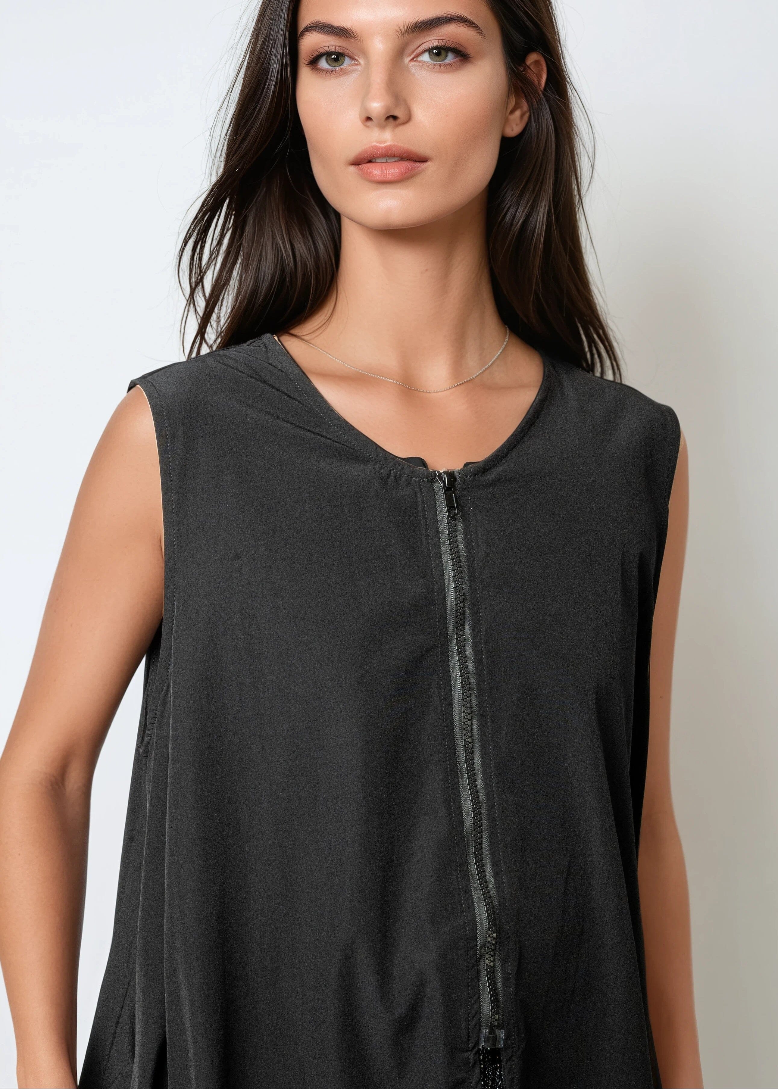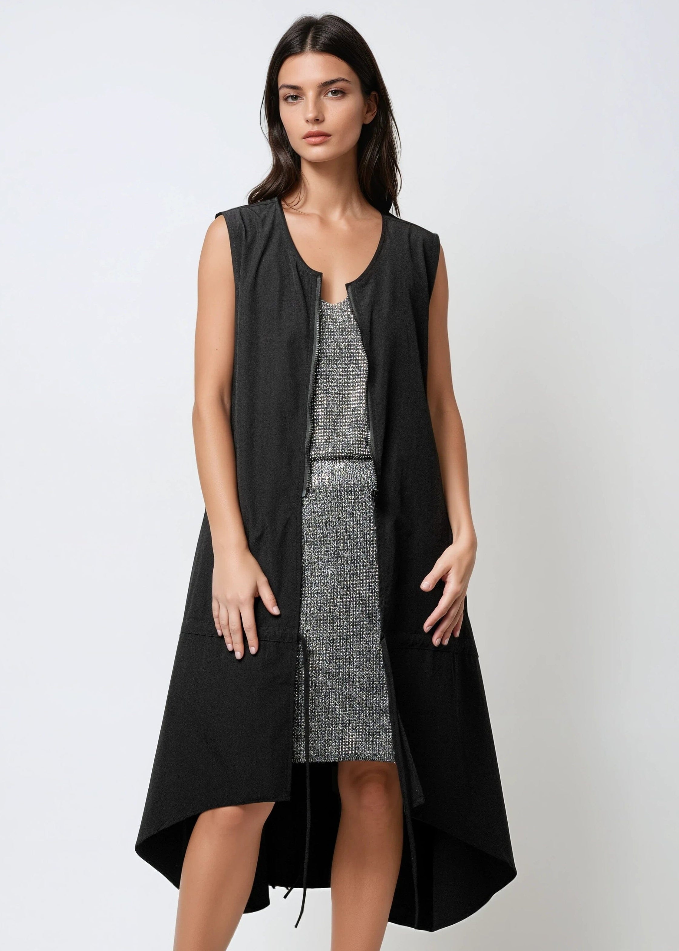 - Lightweight sleeveless vest with a dramatic high-low silhouette