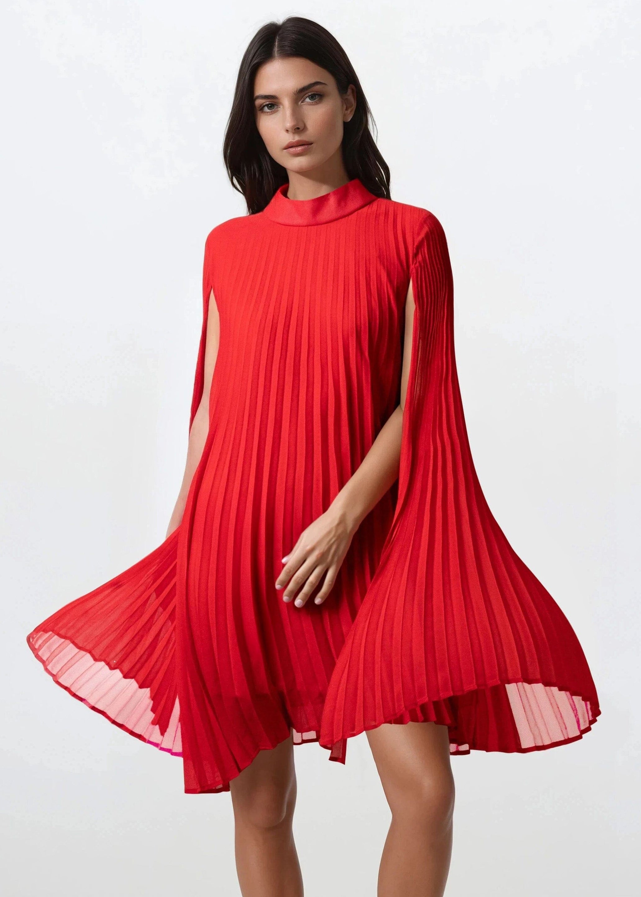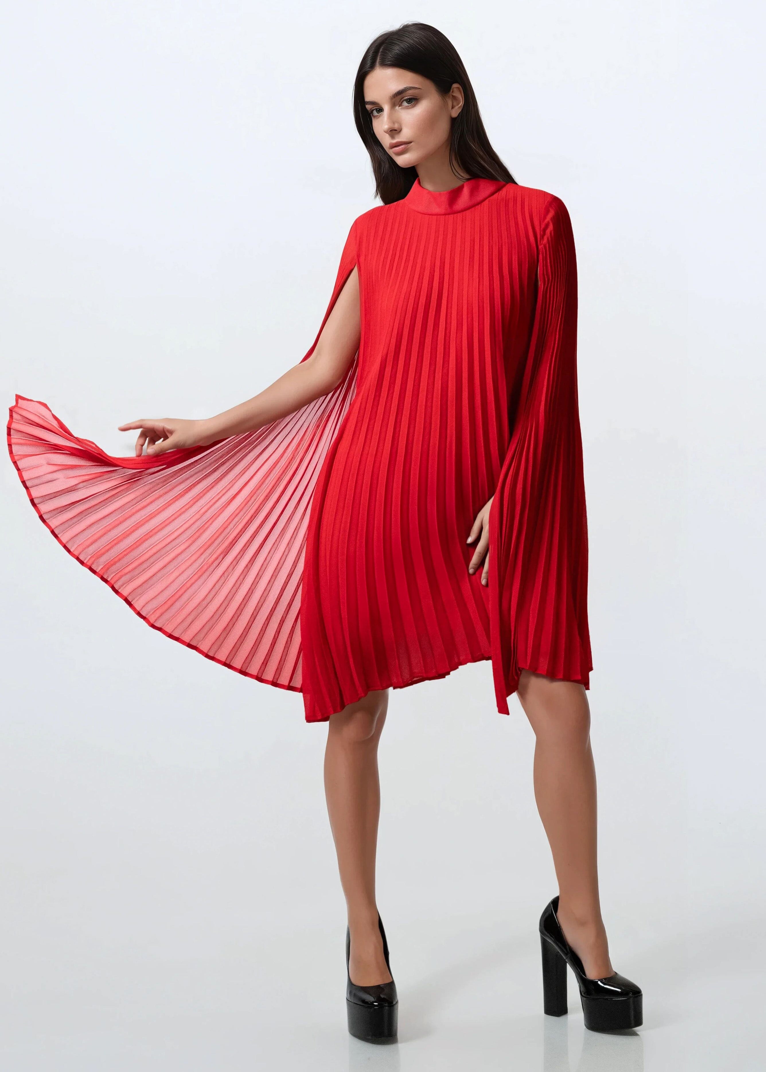 Pleated Mock Neck Cape Dress
