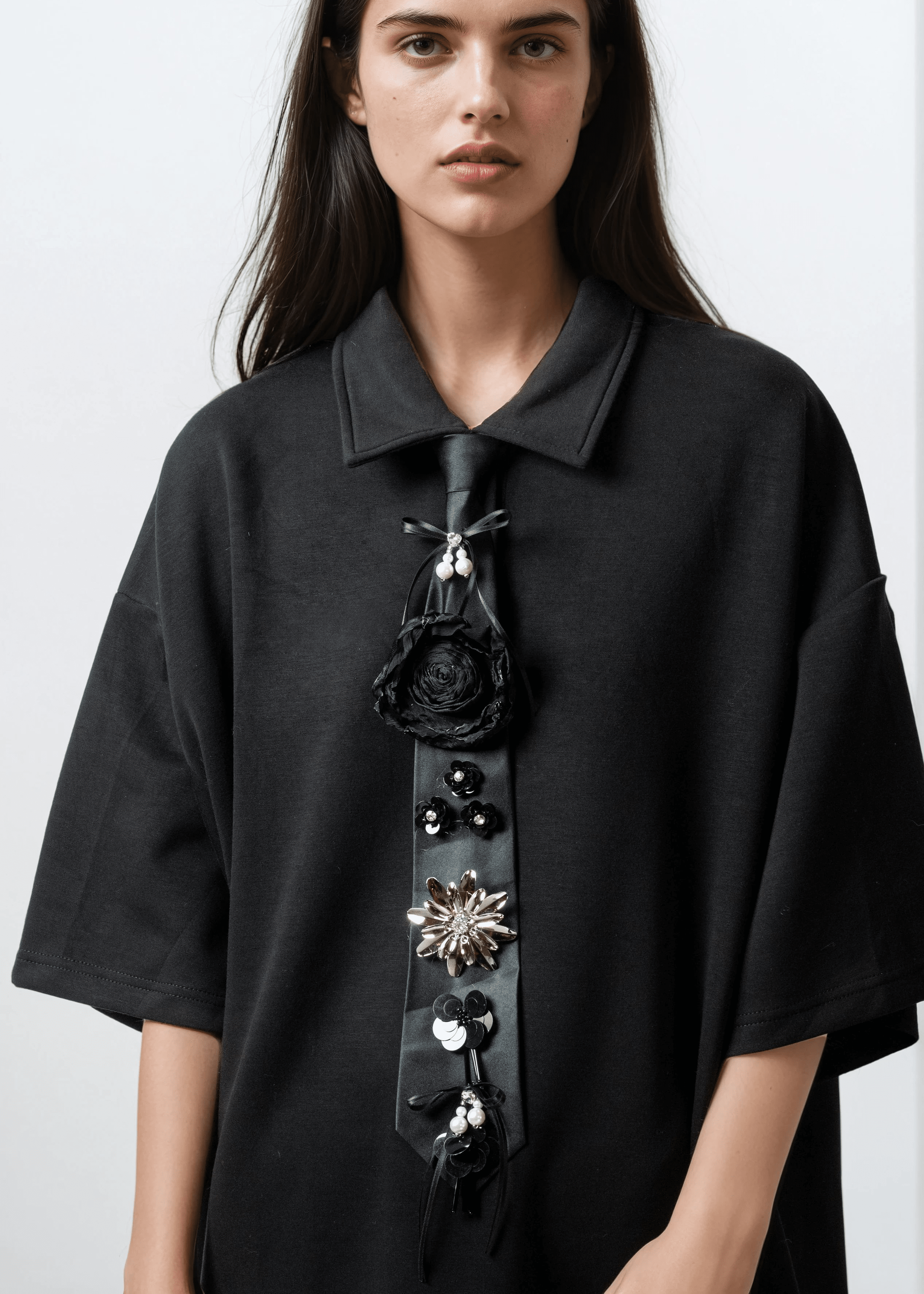 - Satin necktie panel stacked with florals, jewels + mixed embellishments