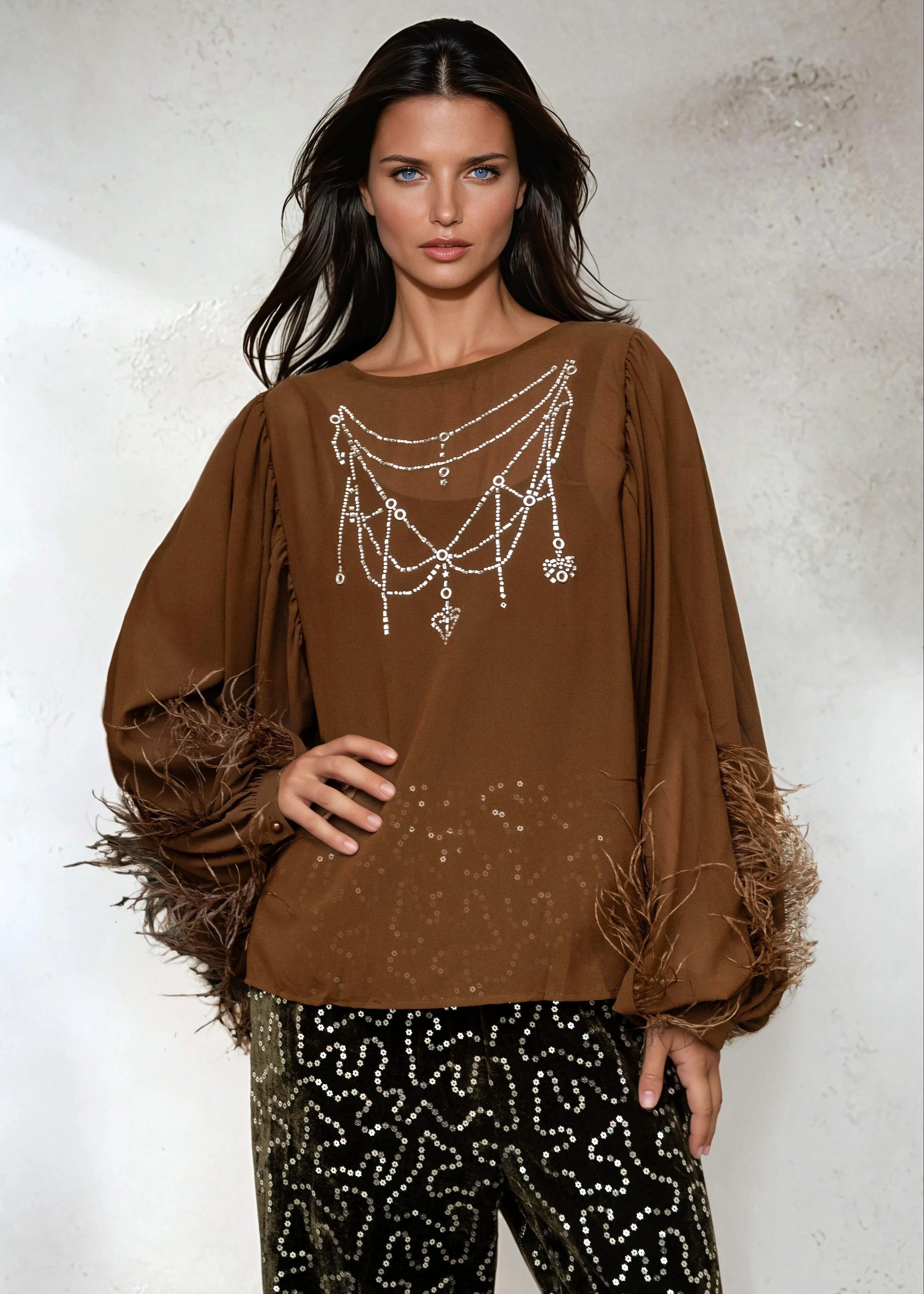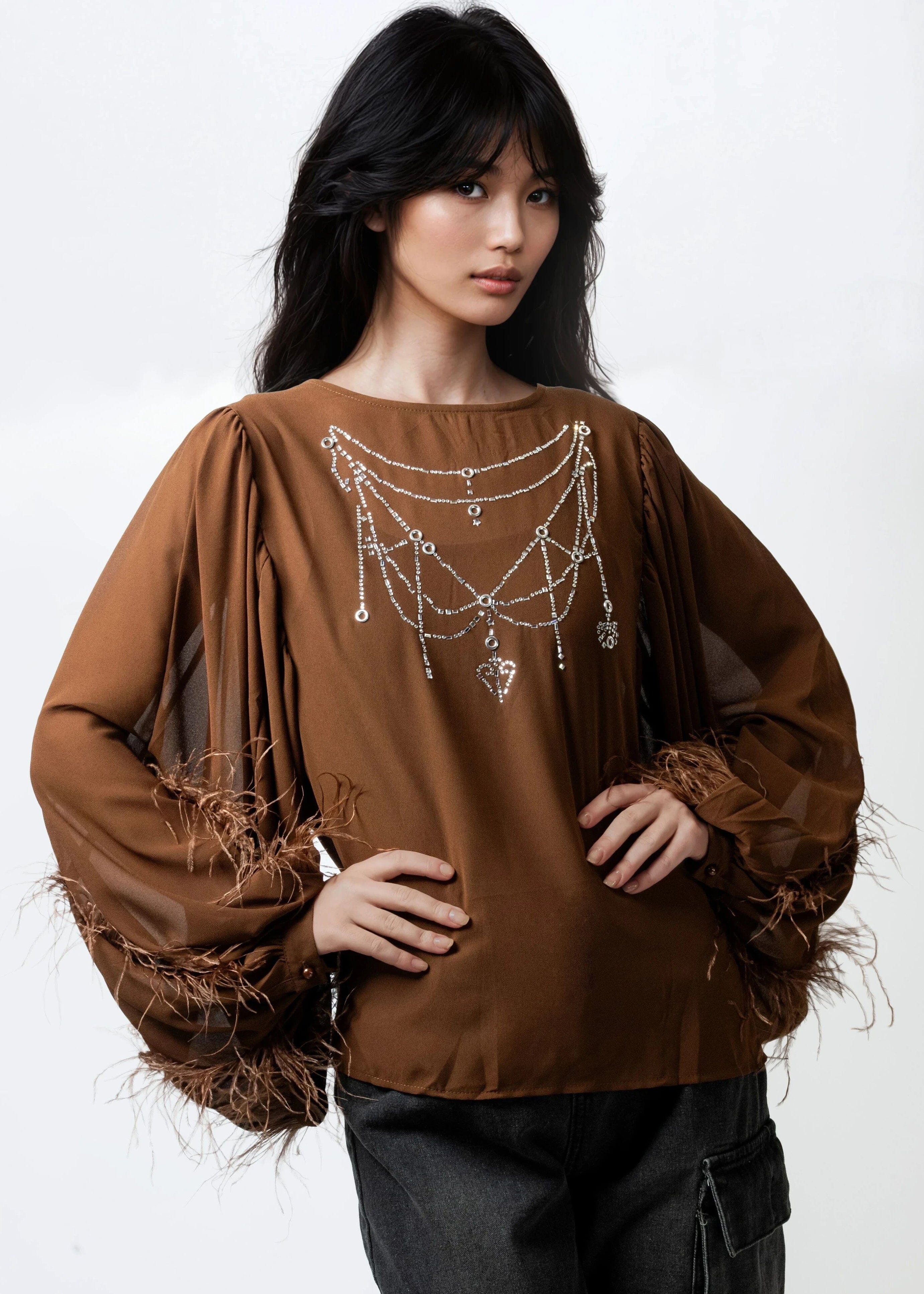 • Rhinestone chain detailing draped across the front like armor jewelry