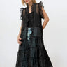 - Sheer tiered layers with fluttery ruffle trim