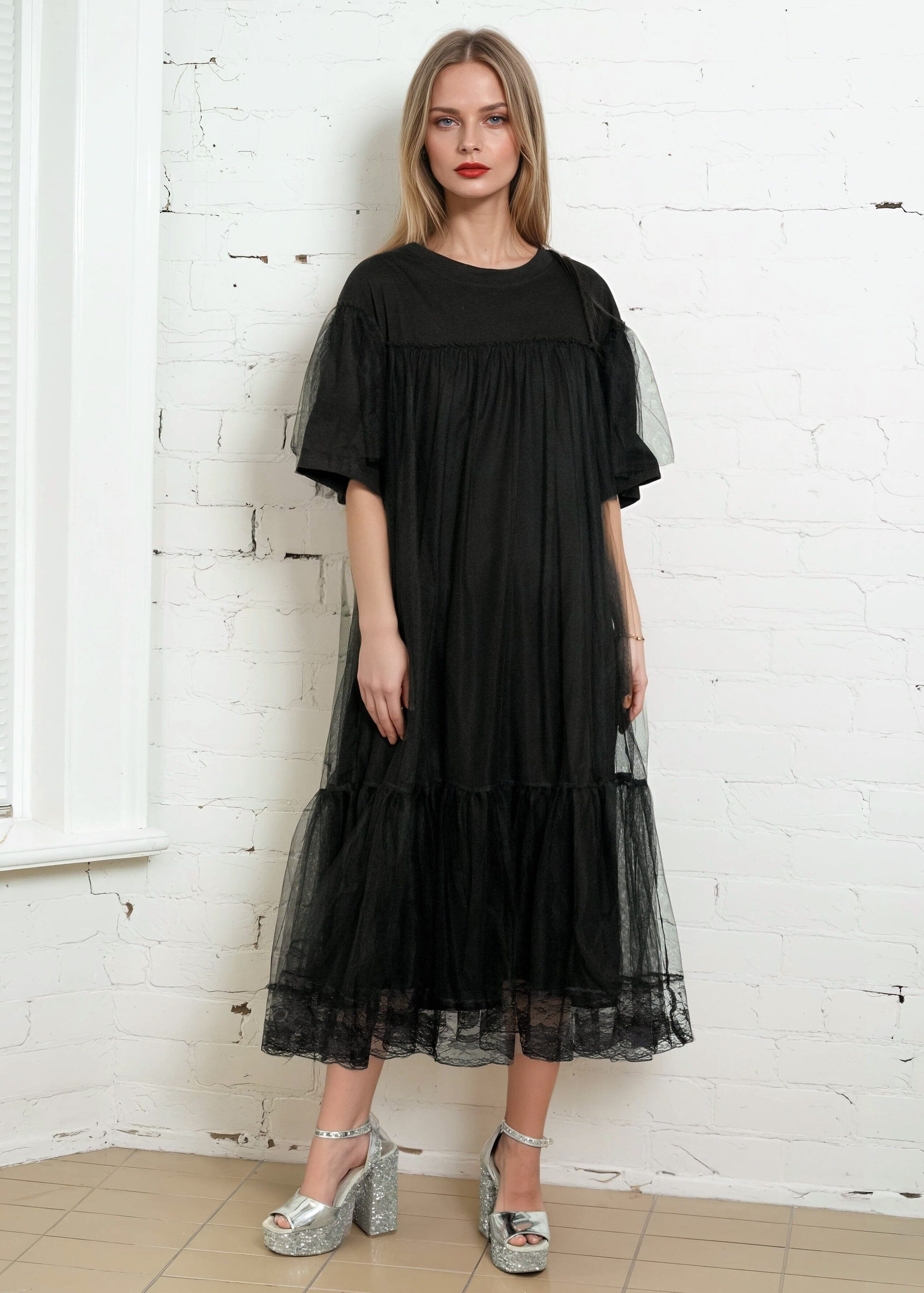 The tulle overlay tee dress you didn't know you needed — until now. This midi-length layered statement piece pairs a breathable cotton base with a sheer tulle overlay and delicate lace trim hem, making it the kind of easy throw-on that hits different every single time. Built for the woman who refuses to choose between comfort and drama.