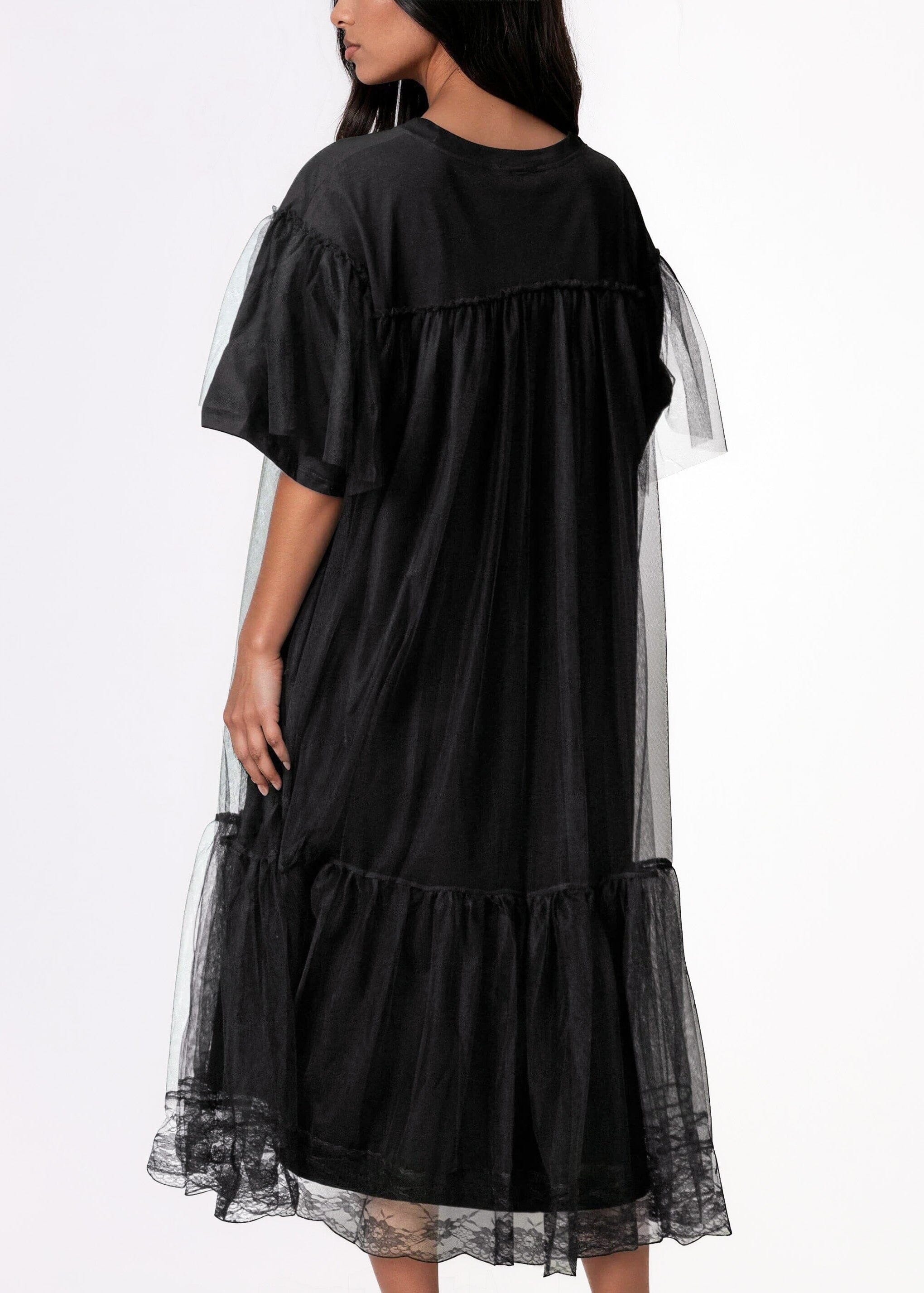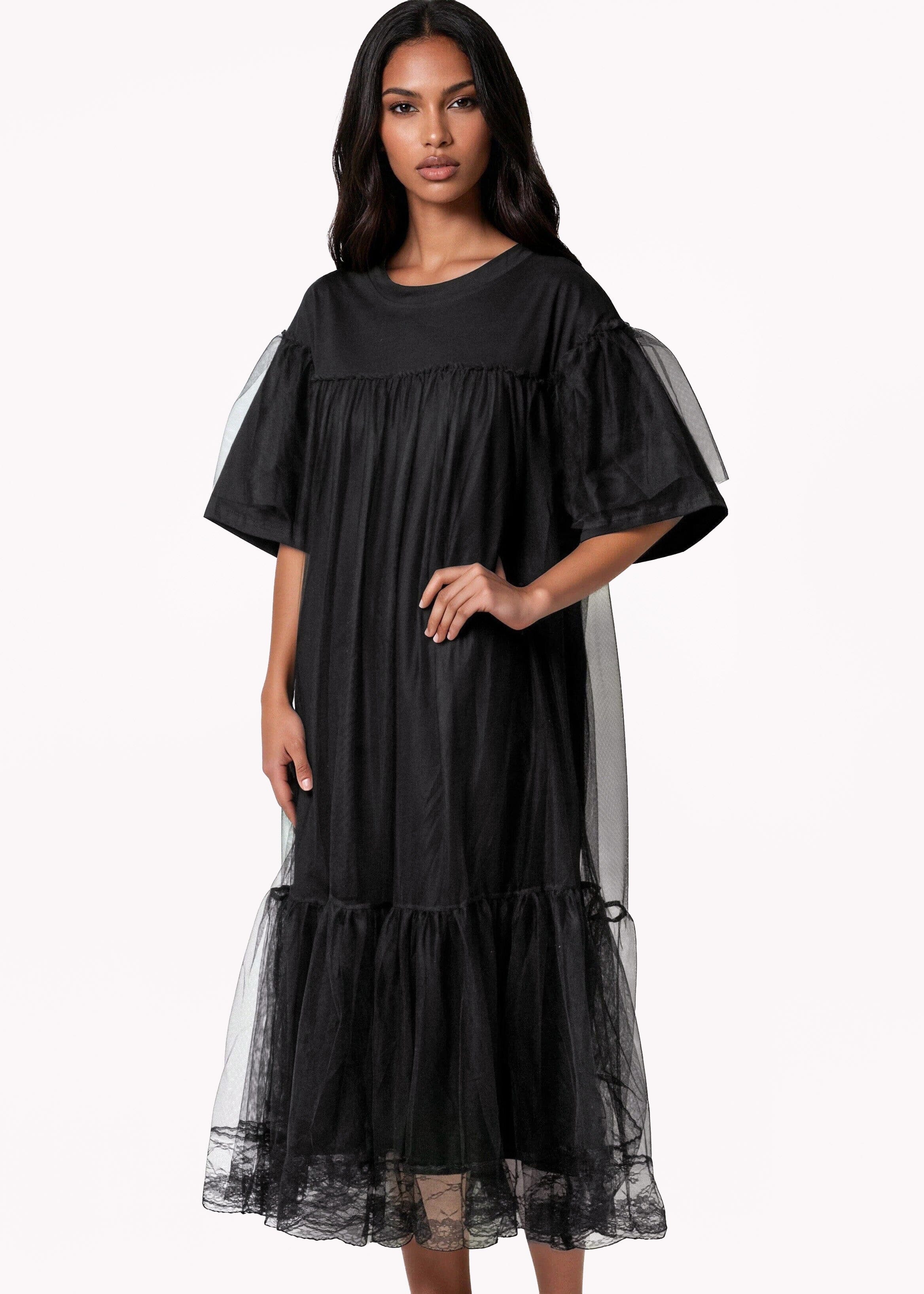 - Design: Layered tee dress construction with a sheer tulle overlay, ruffle tier hem, and delicate lace trim detailing at the hem.